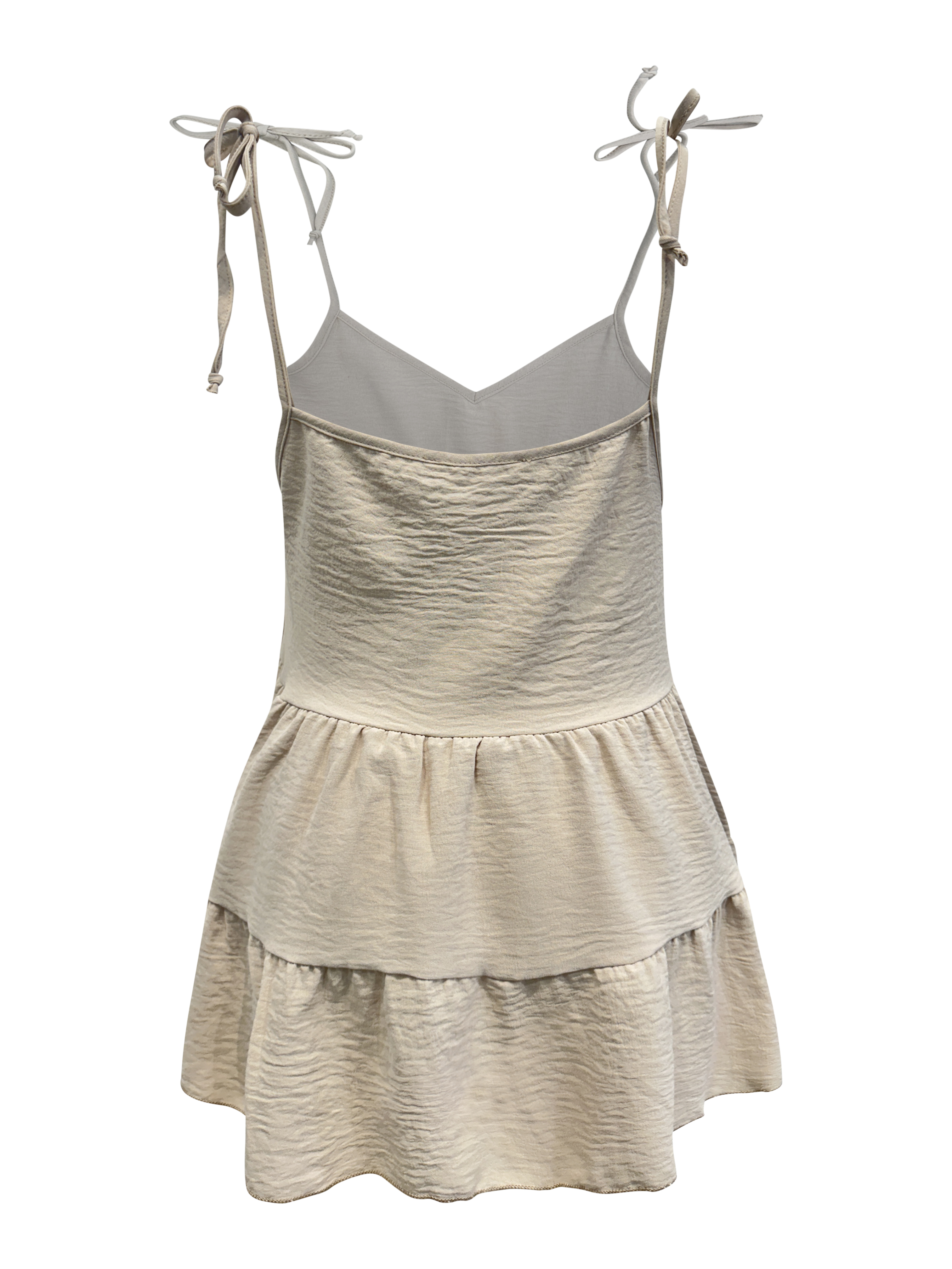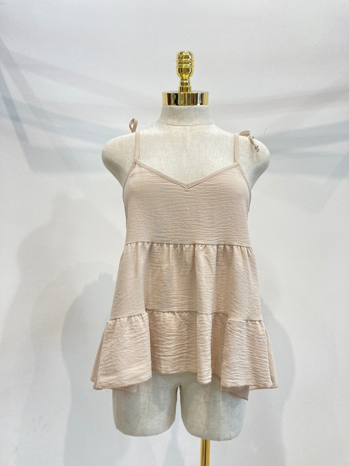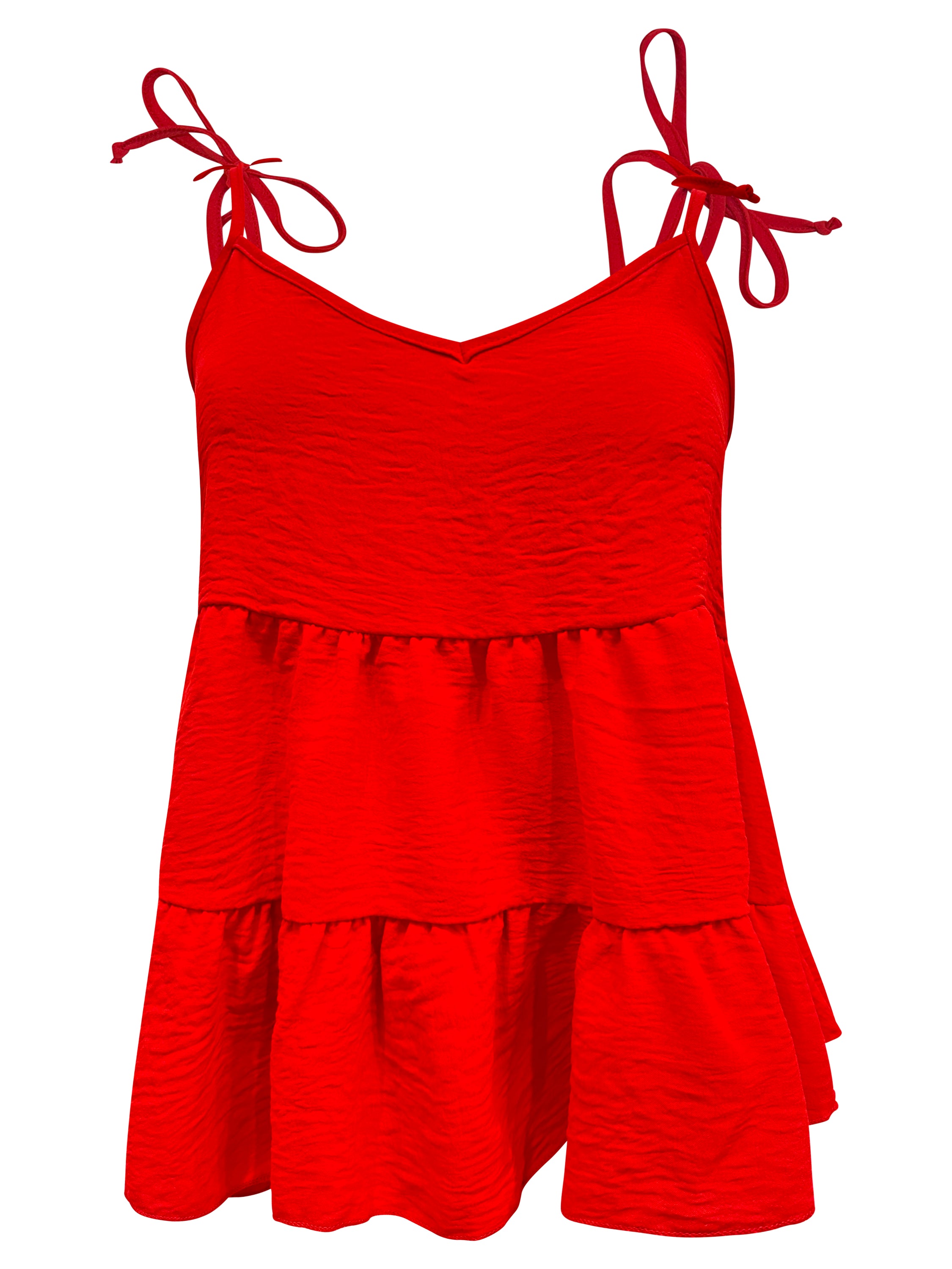 The Tie-Strap Tiered Sleeveless Top is a must-have addition to your wardrobe. This stylish tank top features a flattering V-neck design and adjustable tie straps that allow you to customize the fit to your liking. Made from high-quality materials, this top is designed for comfort and breathability, making it perfect for warm weather or layering under your favorite cardigan or jacket.