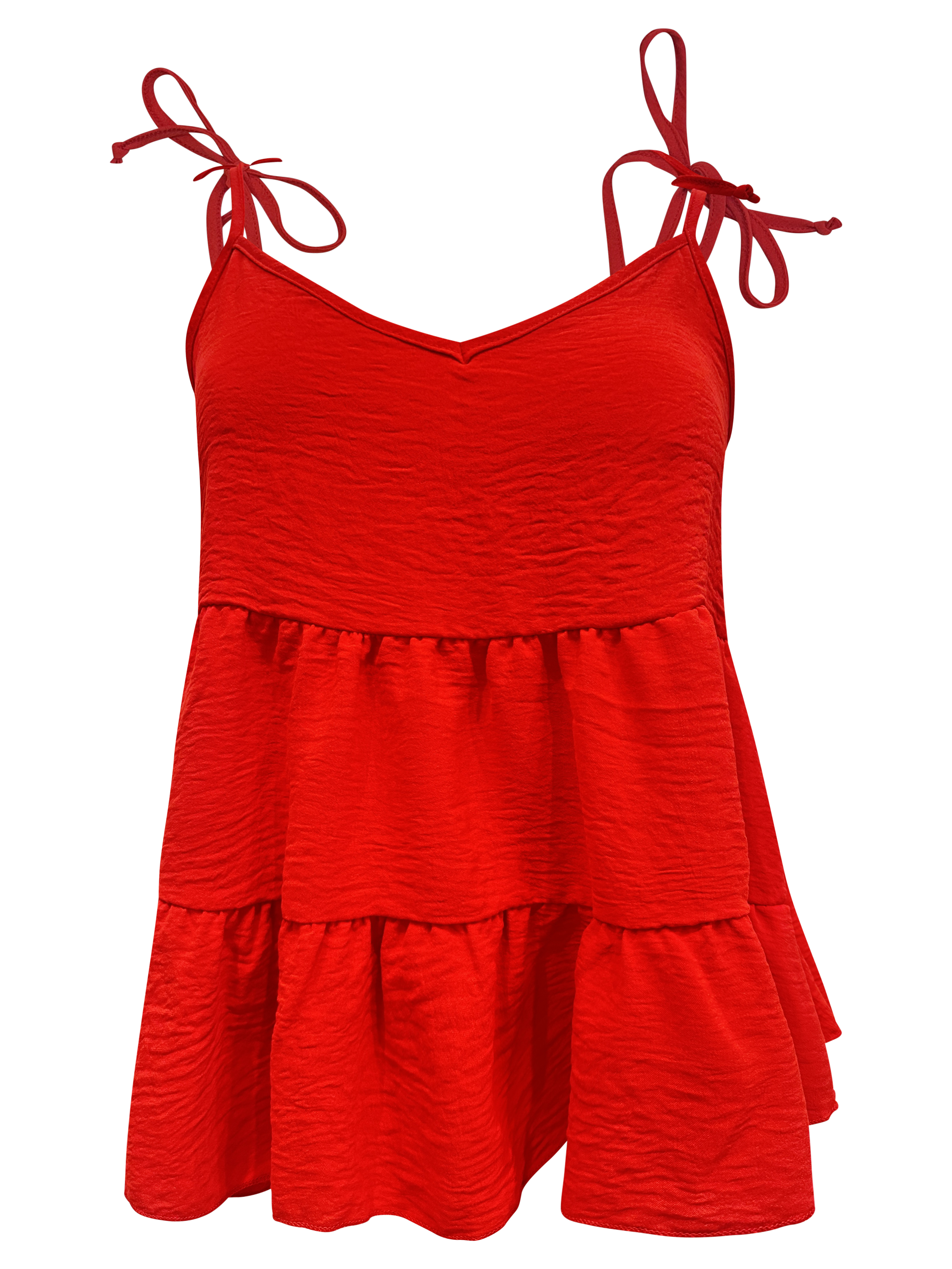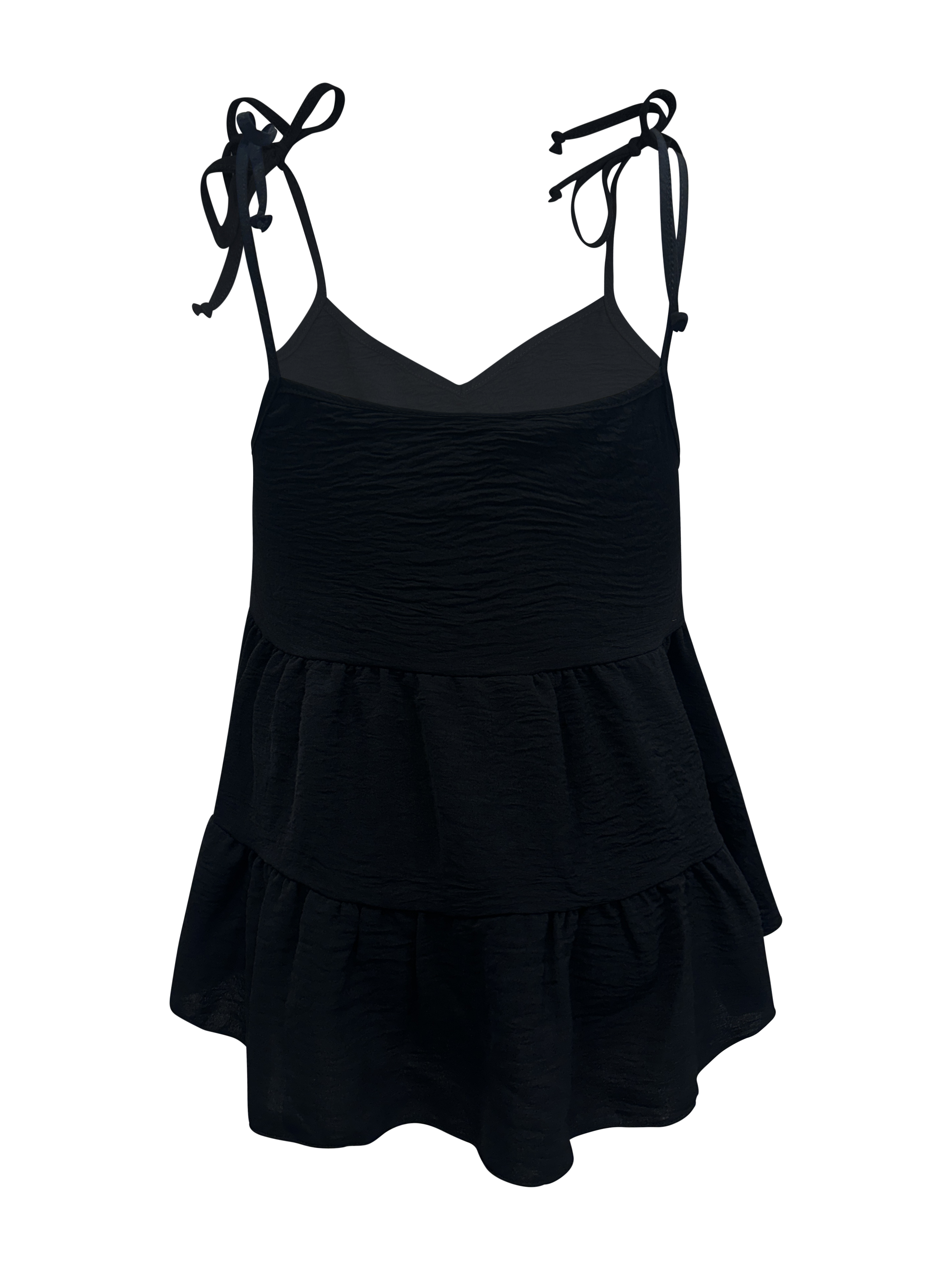 Pair the Tie-Strap Tiered Sleeveless Top with high-waisted shorts for a casual summer look, or tuck it into a pencil skirt for a more polished outfit. Add a statement necklace or a pair of hoop earrings to elevate your style. This top is also perfect for layering under a denim jacket or a lightweight cardigan during transitional seasons.