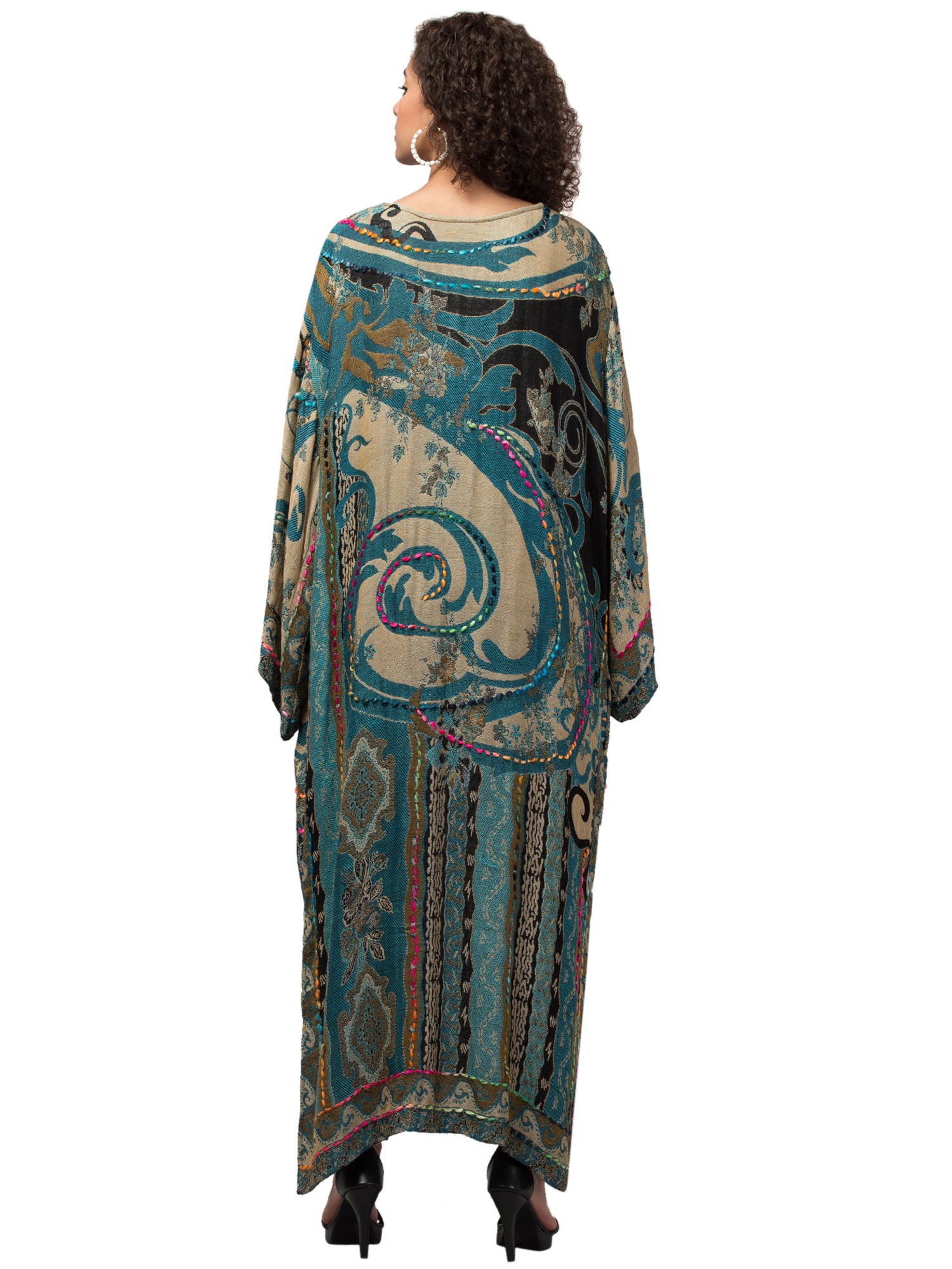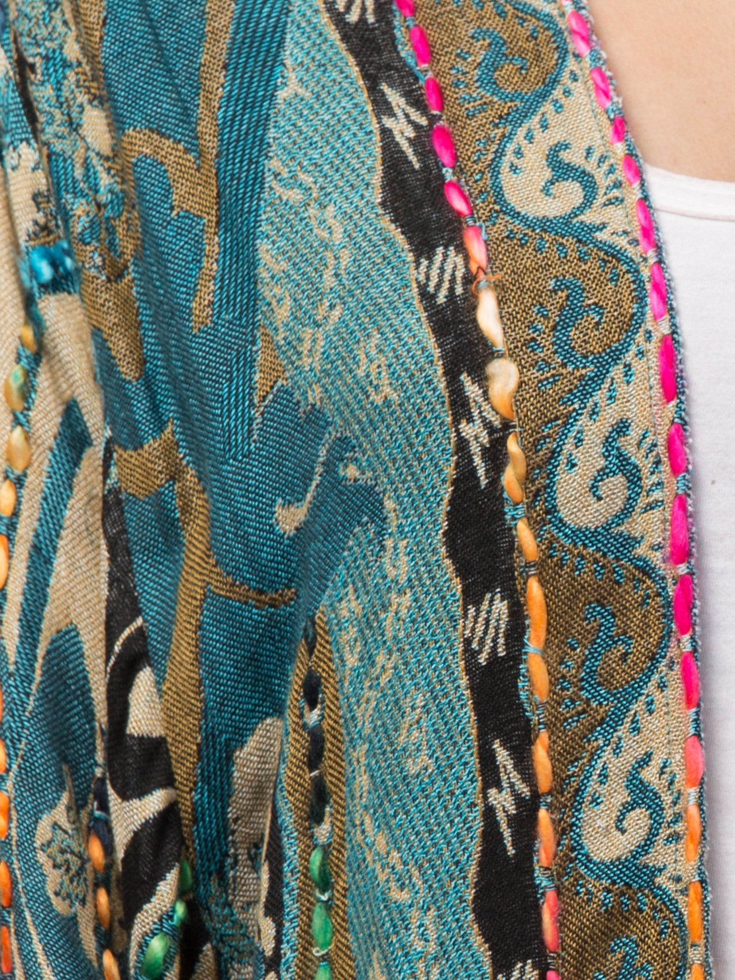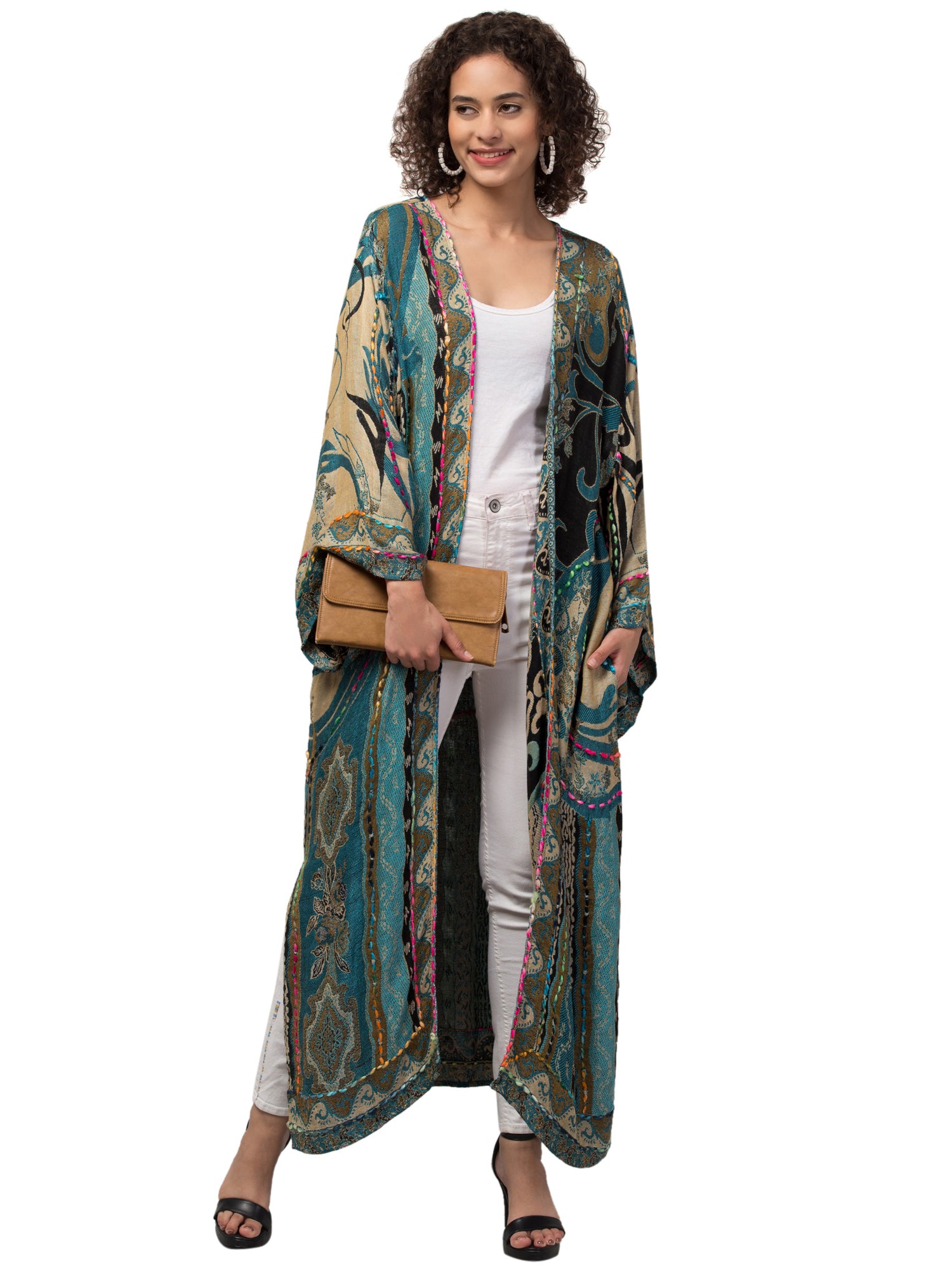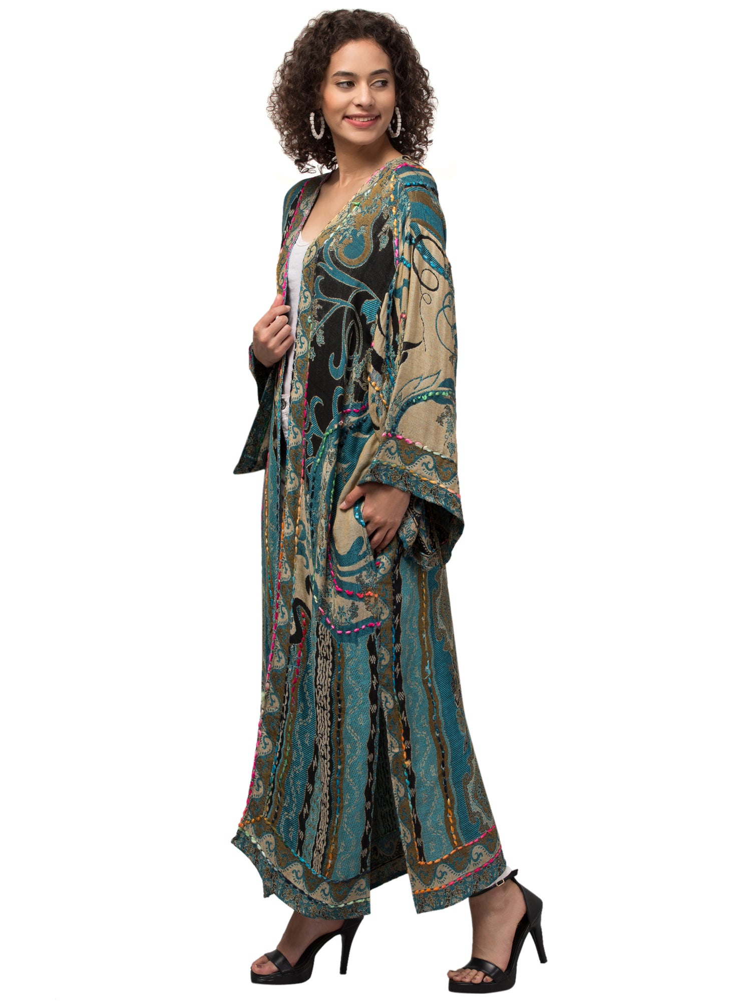 A stunning Tiffany Blue Thick Stitch Kimono Jacket featuring intricate hand embroidery and vibrant colors, perfect for bohemian fashion lovers.