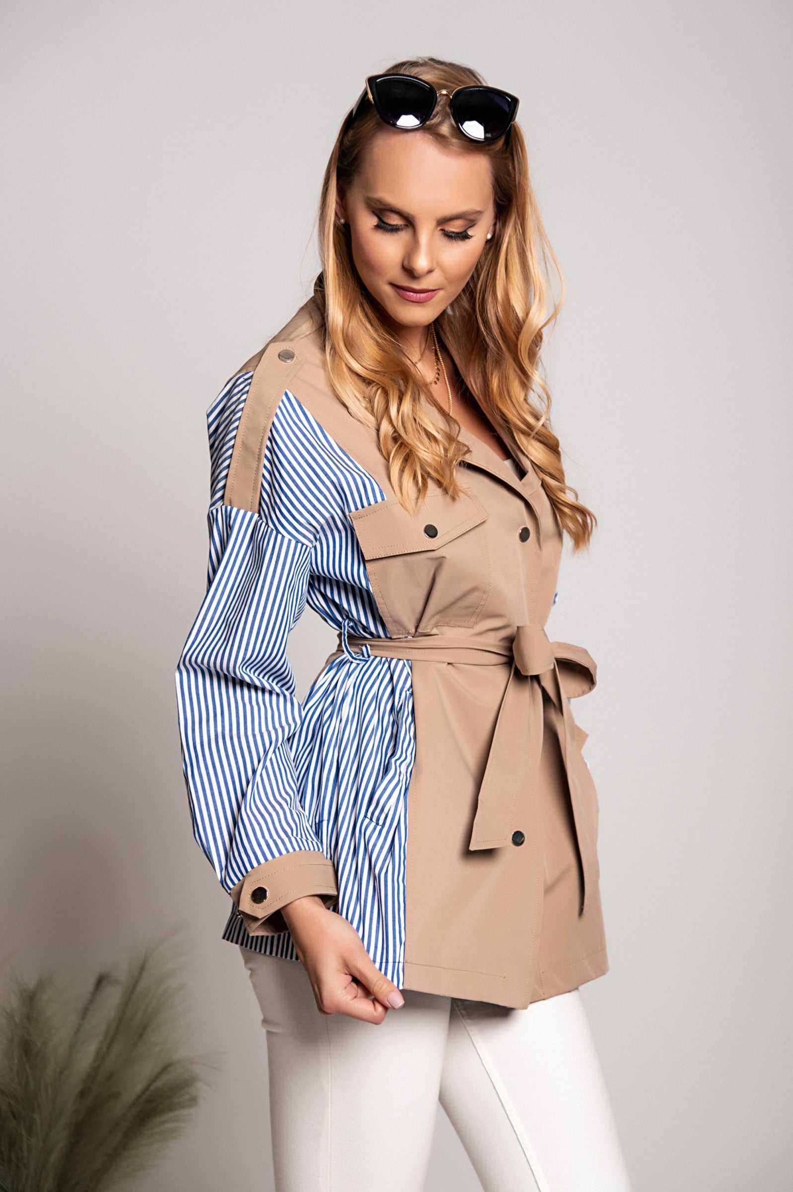Practicality meets style with the Trenchcoat Xalapa. It includes two front pockets, perfect for keeping your essentials close at hand, whether it's your phone, keys, or wallet. The coat fastens with buttons down the front, ensuring a secure closure while adding to its classic trench coat aesthetic. Additionally, the attached belt allows you to cinch the waist for a more tailored look, enhancing your silhouette.