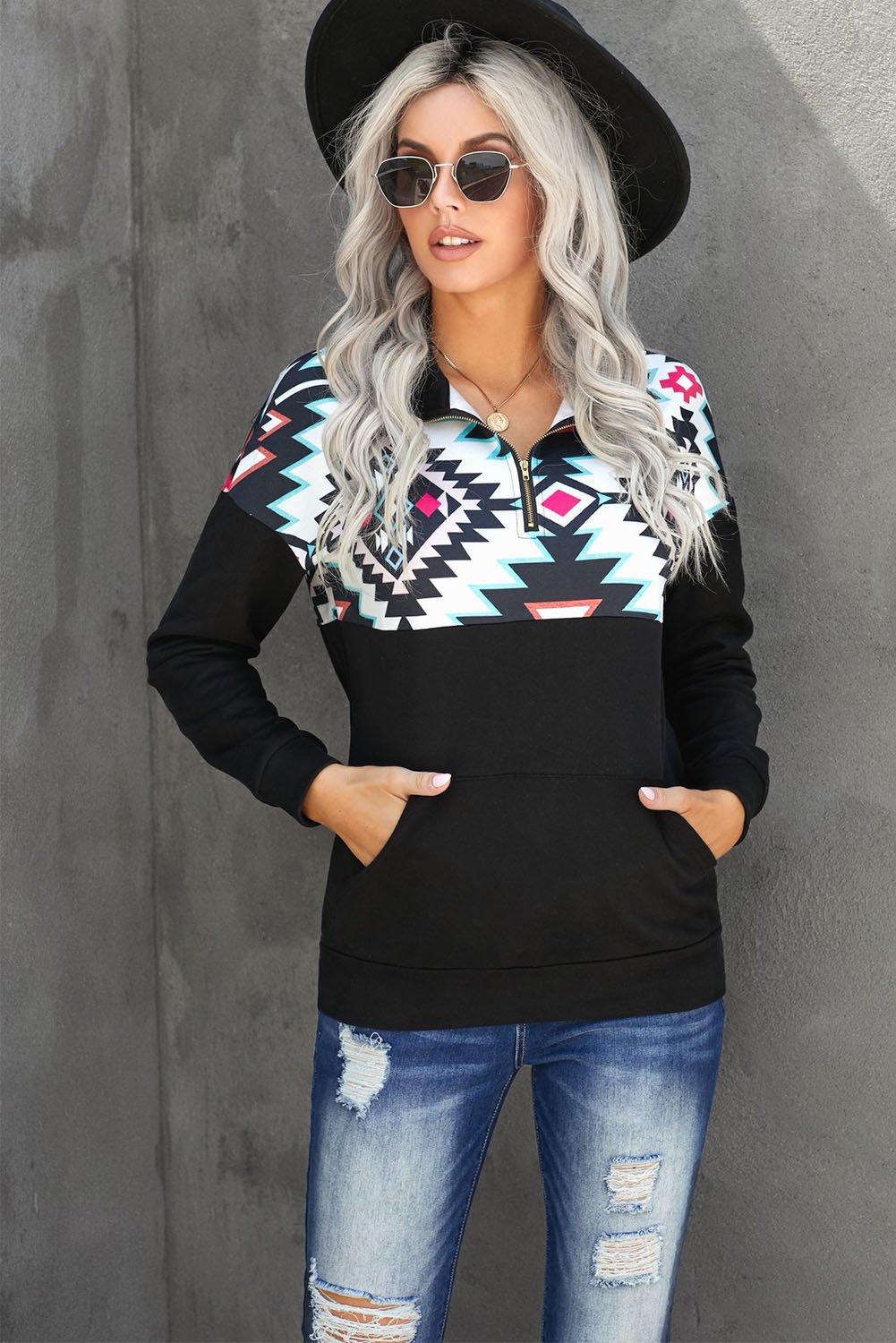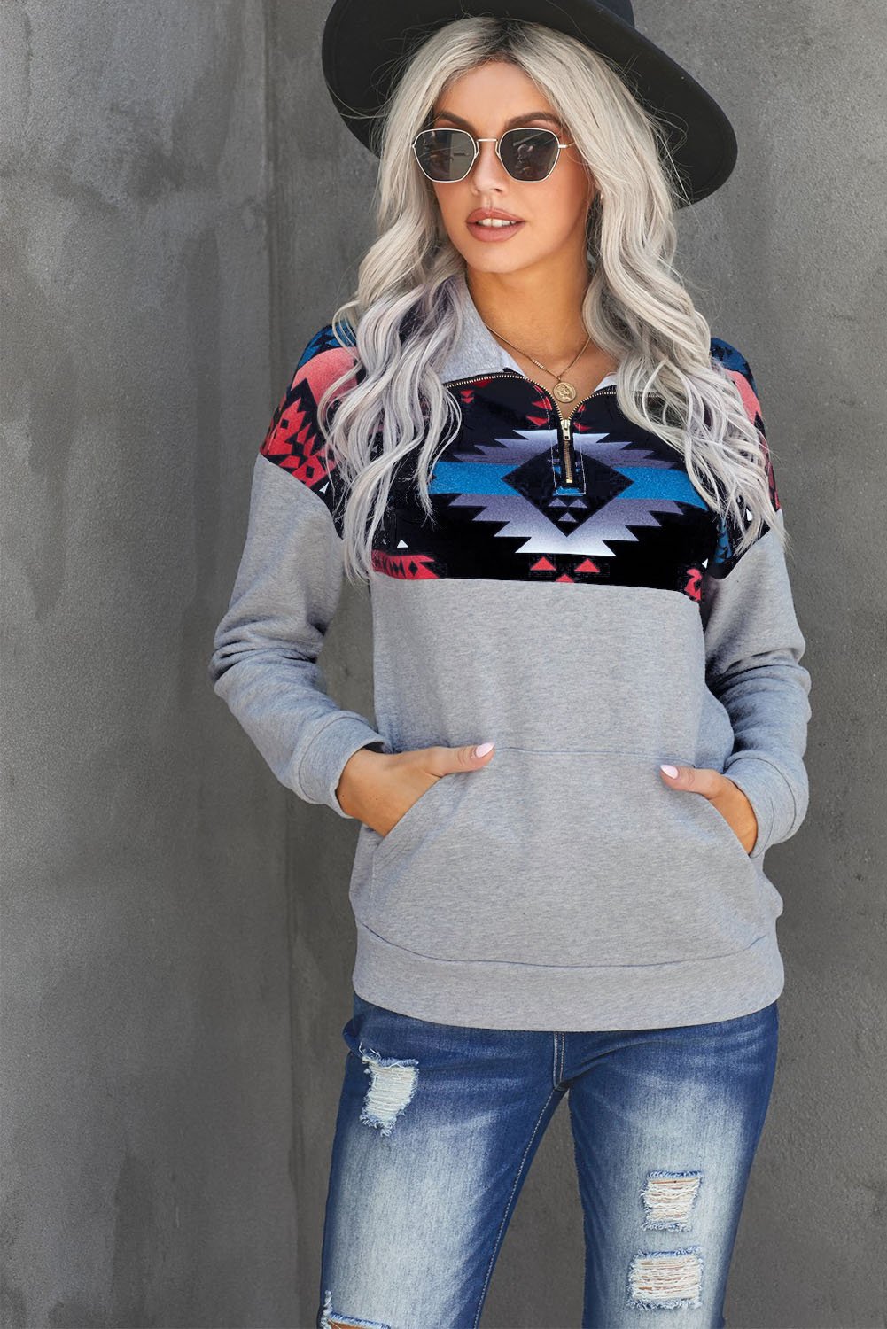 The Turn Down Collar Zip Tribal Print Sweatshirt features a trendy turn down collar that adds a touch of sophistication to your casual look. The zip closure not only enhances the style but also provides convenience, allowing you to adjust the neckline according to your preference. Whether you're heading out for a quick errand or meeting friends for coffee, this sweatshirt is the ideal choice.