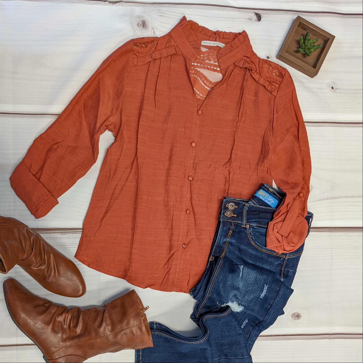 A stylish V-neck Button Down Woven Top featuring a lace back, perfect for casual and semi-formal occasions.