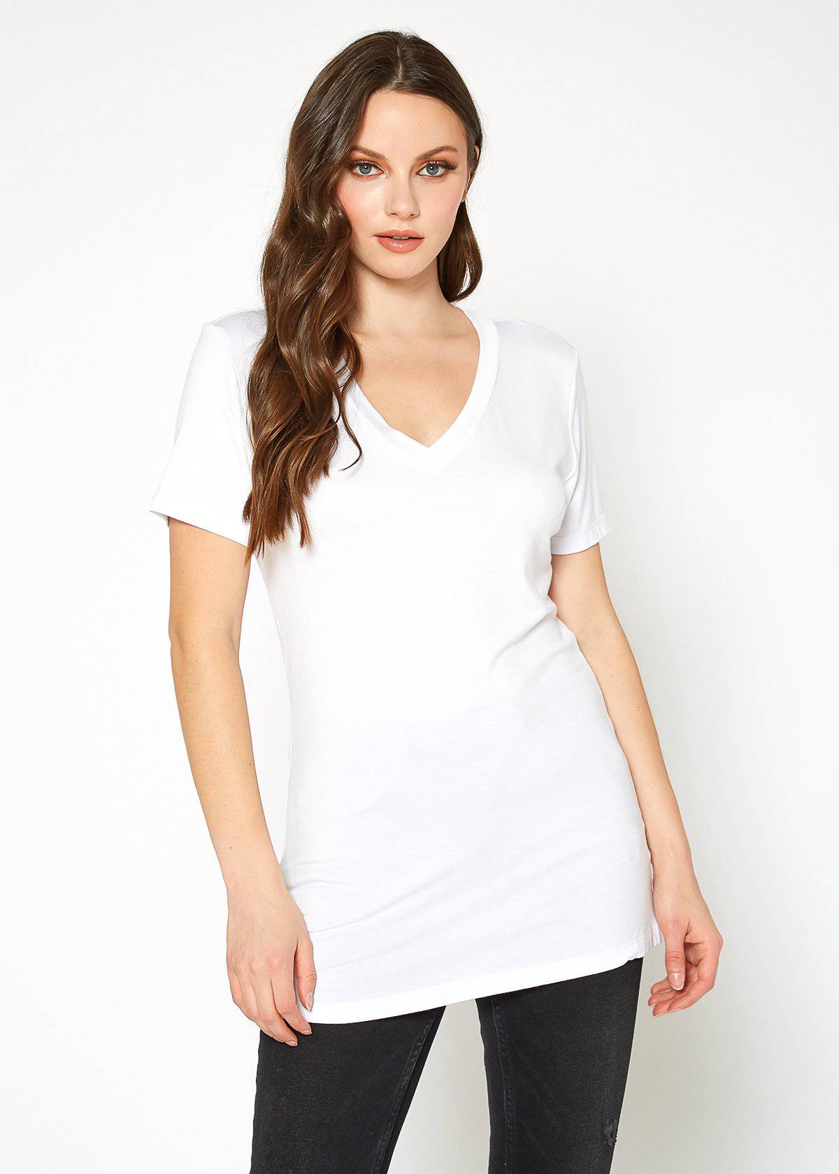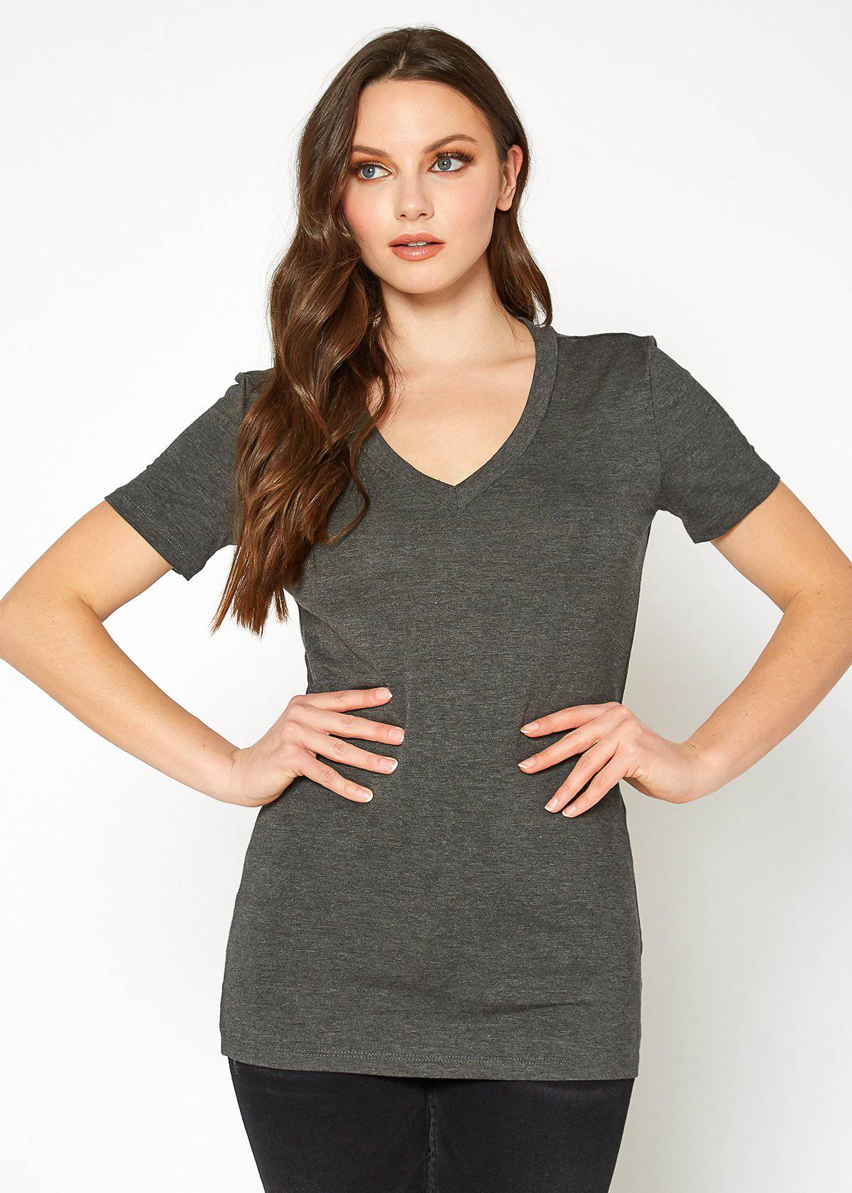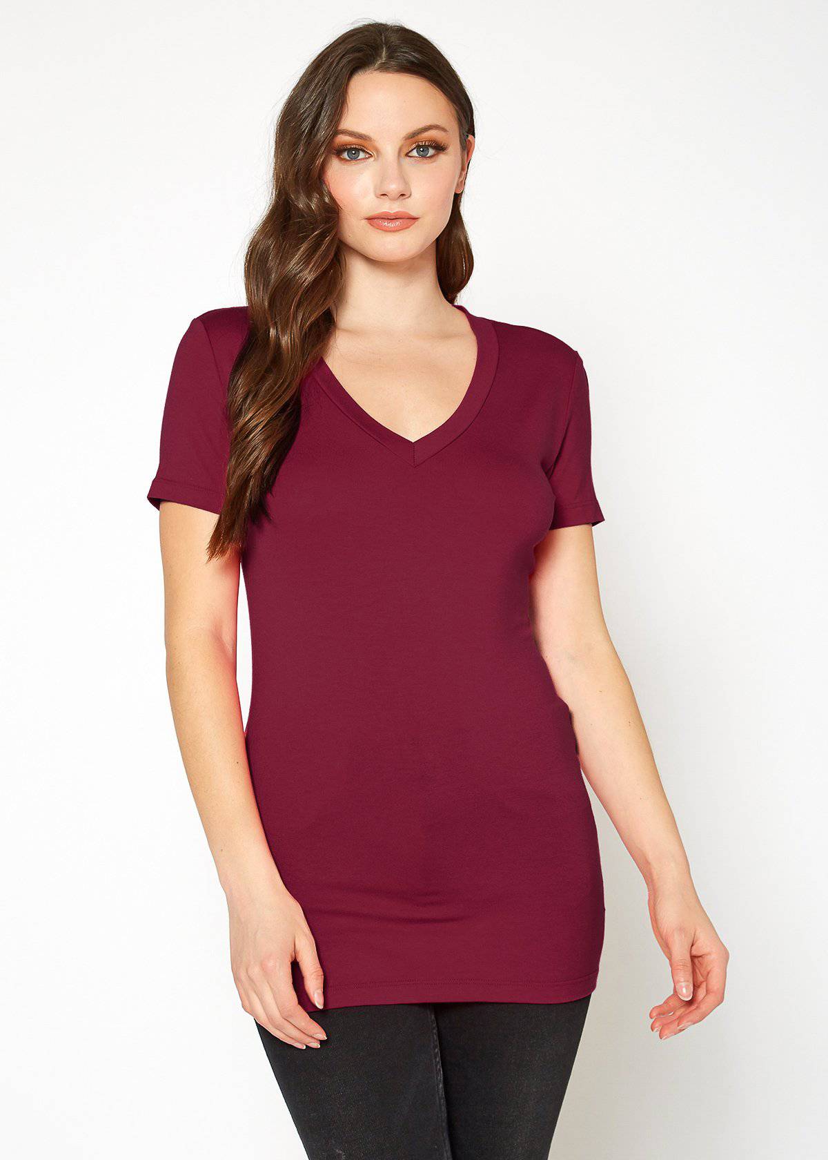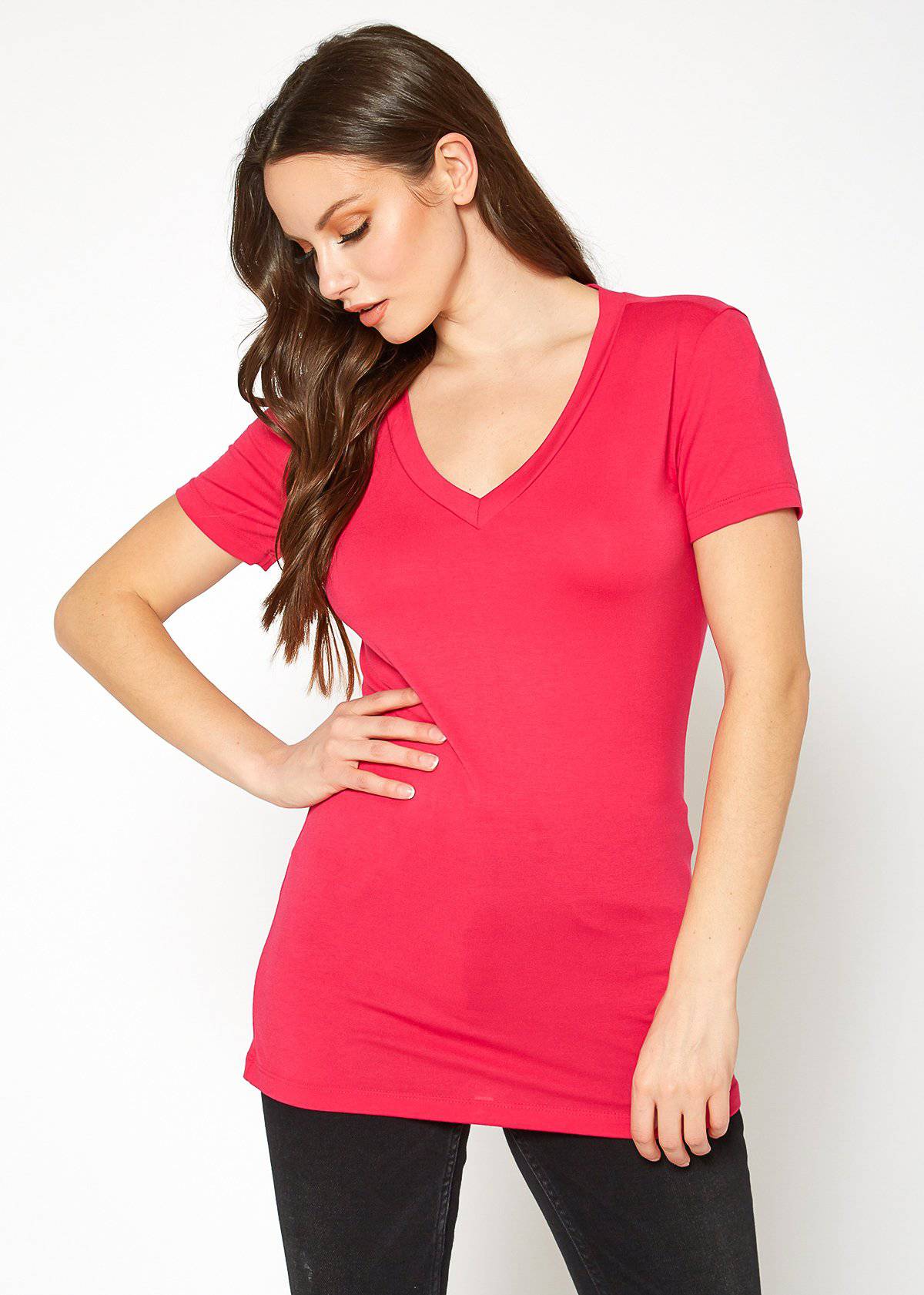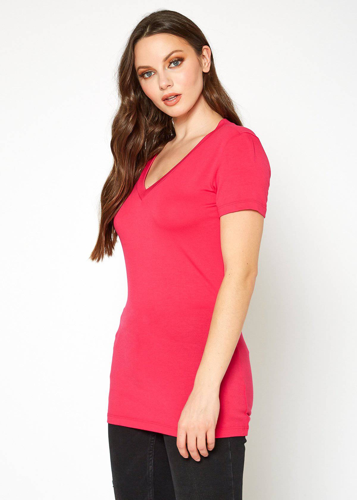 The fitted design of this V-neck tee accentuates your silhouette, making it a flattering choice for all body types. The V-neckline adds a touch of elegance, allowing you to dress it up or down depending on the occasion. Pair it with jeans for a casual look or with a skirt for a more polished outfit.