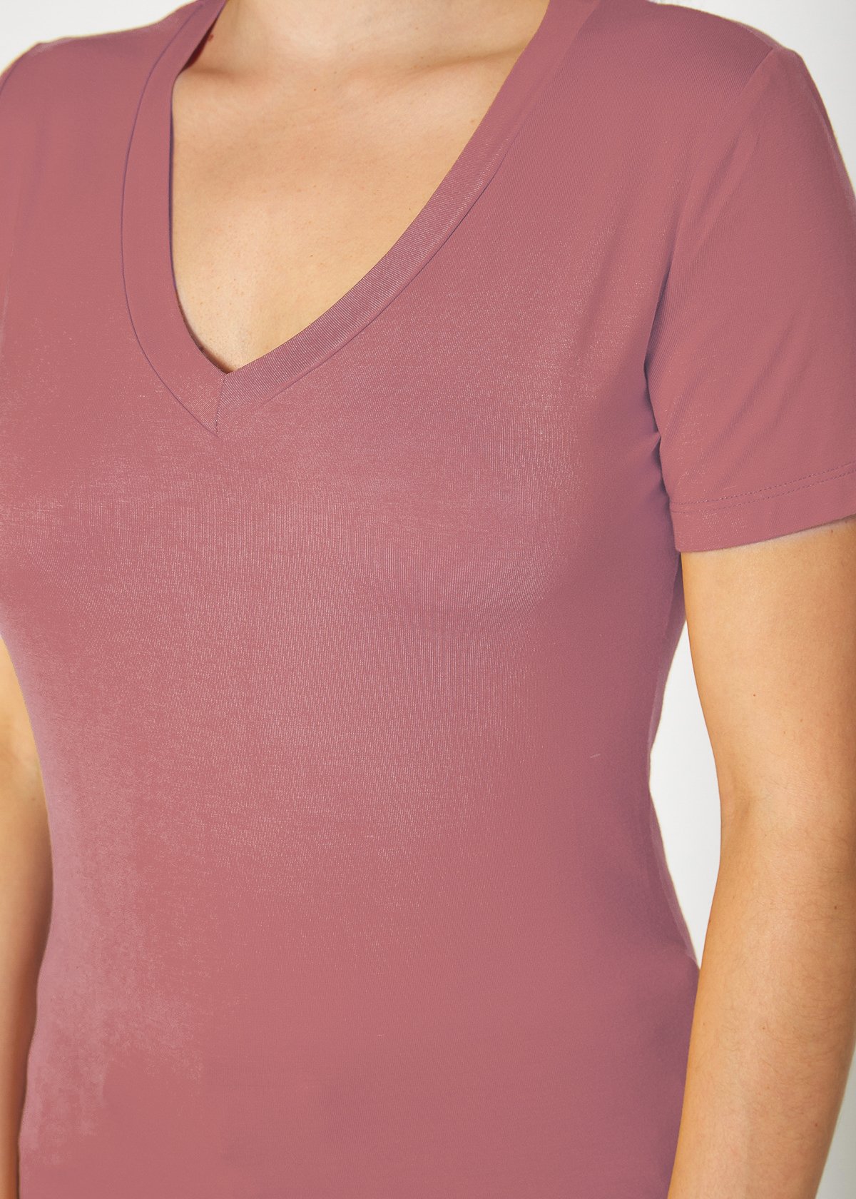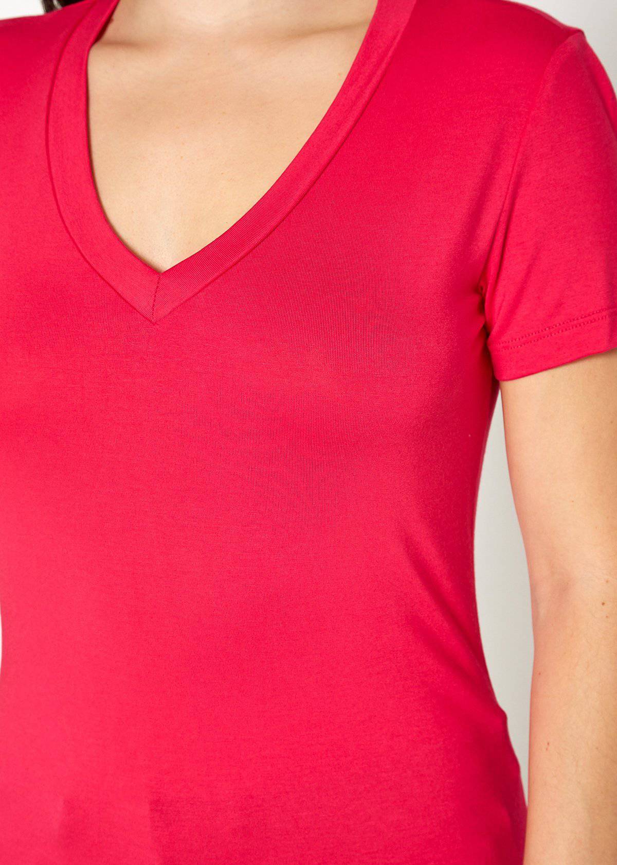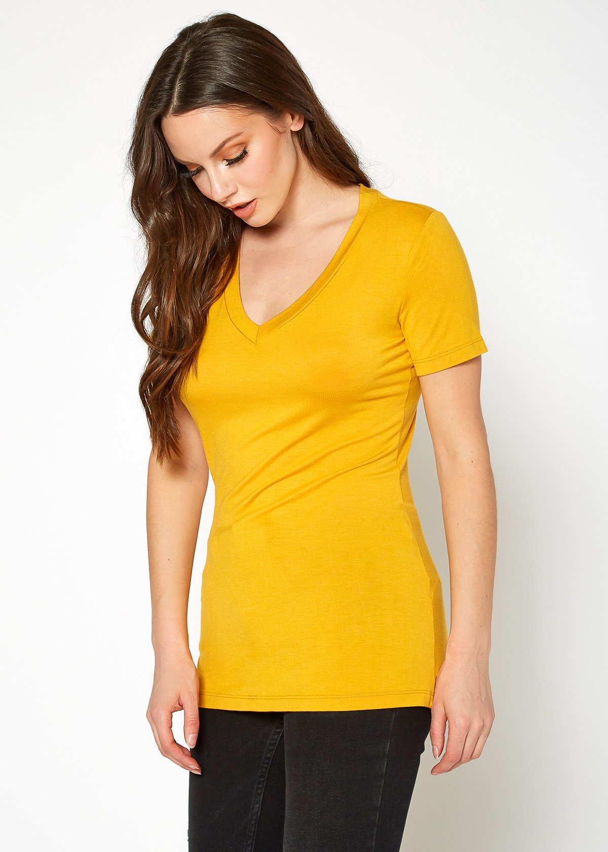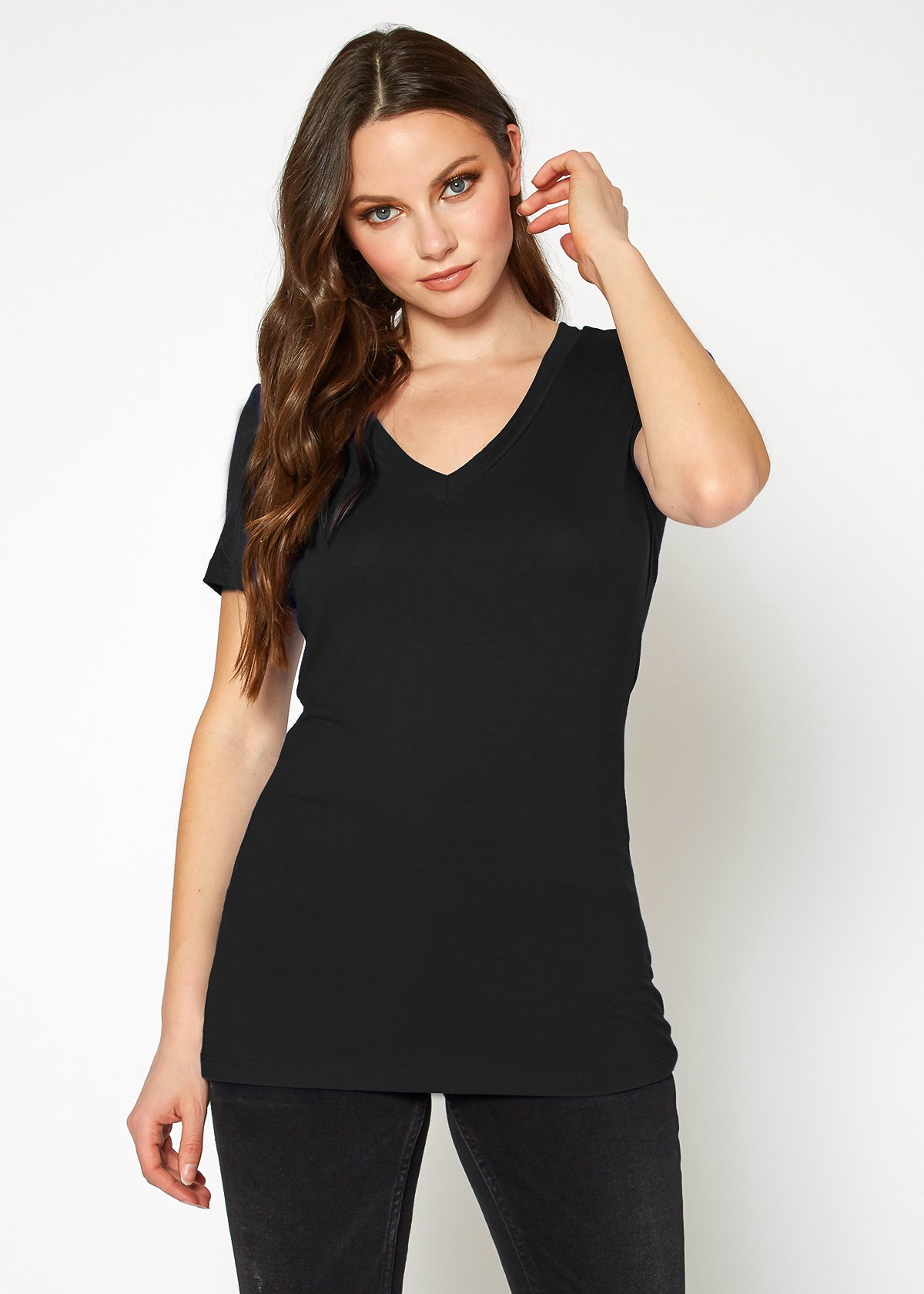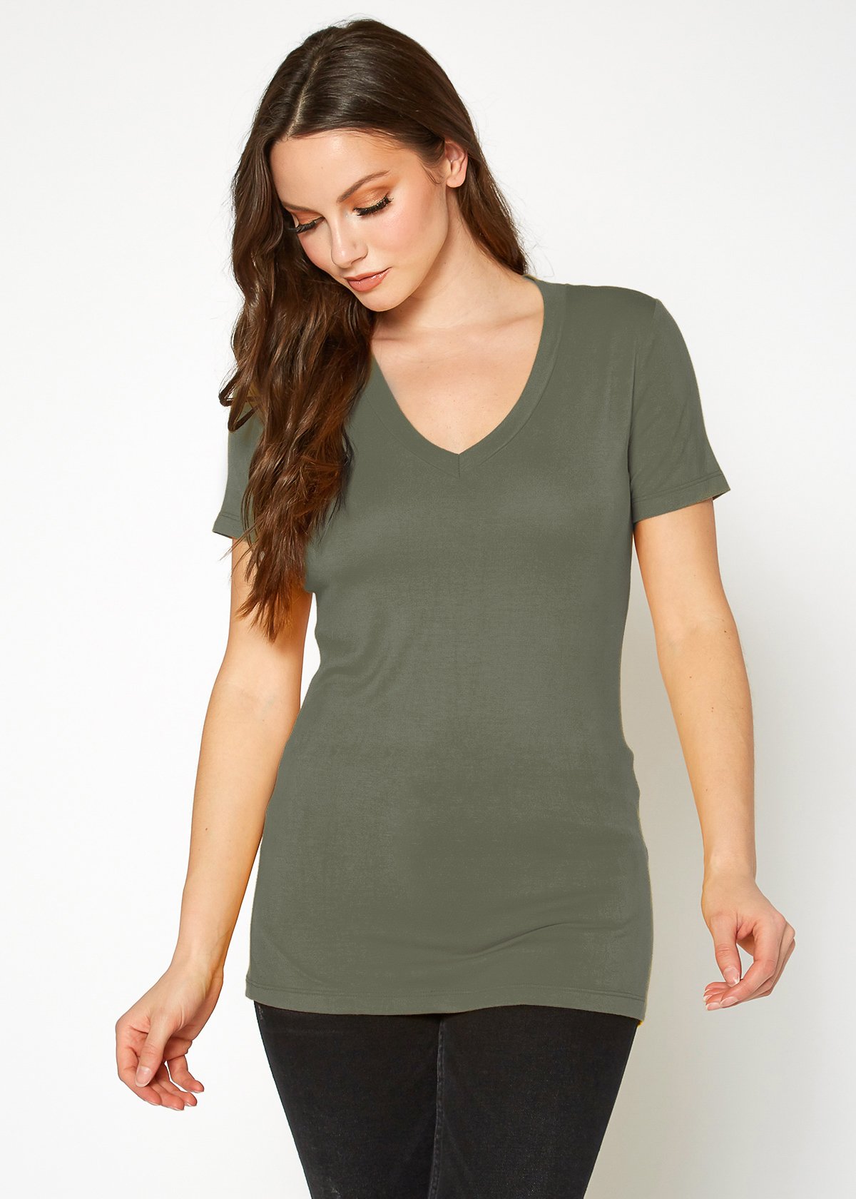 The fitted design of this V-neck tee accentuates your silhouette, making it a flattering choice for all body types. The V-neckline adds a touch of elegance, allowing you to dress it up or down depending on the occasion. Pair it with jeans for a casual look or with a skirt for a more polished outfit.