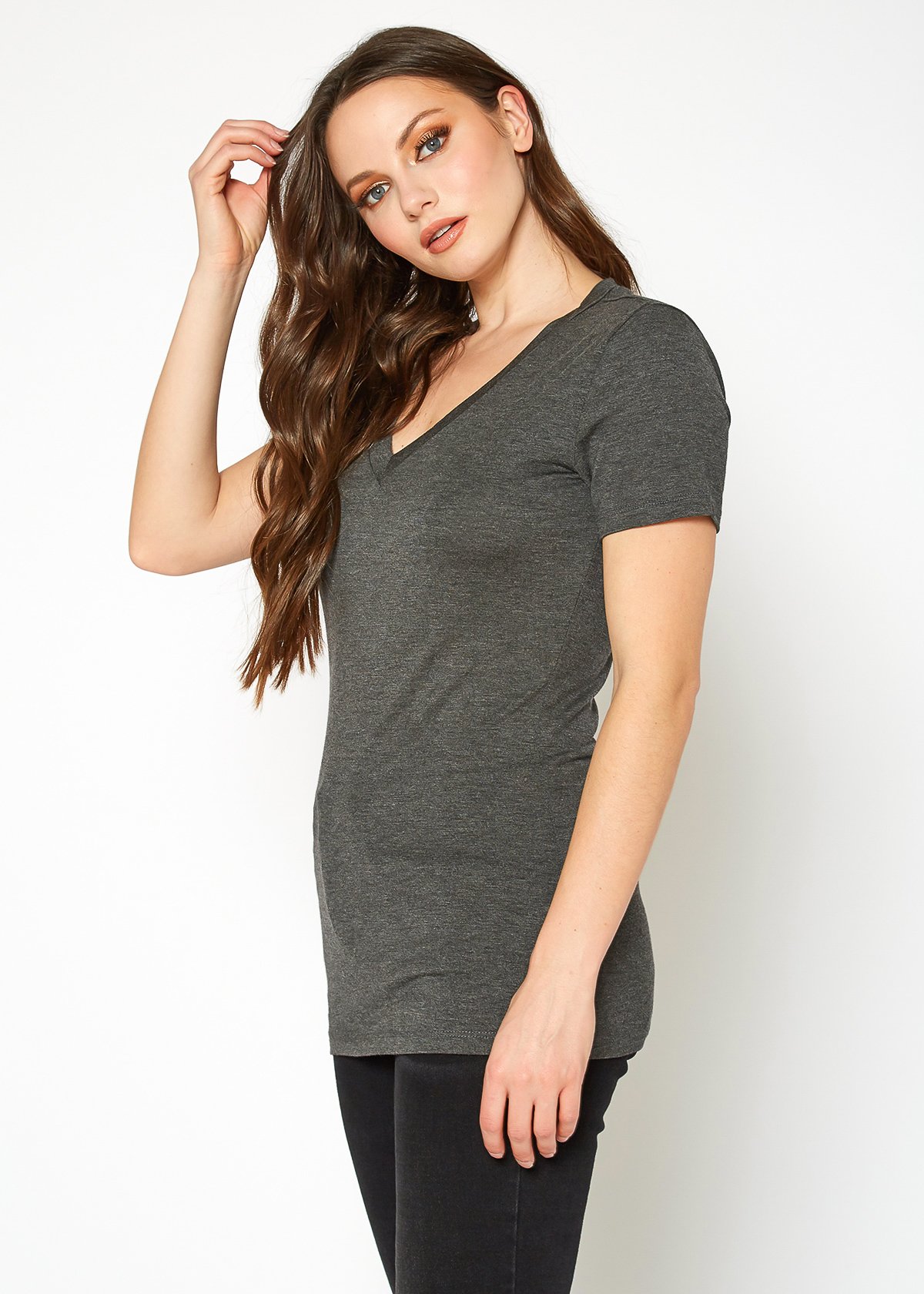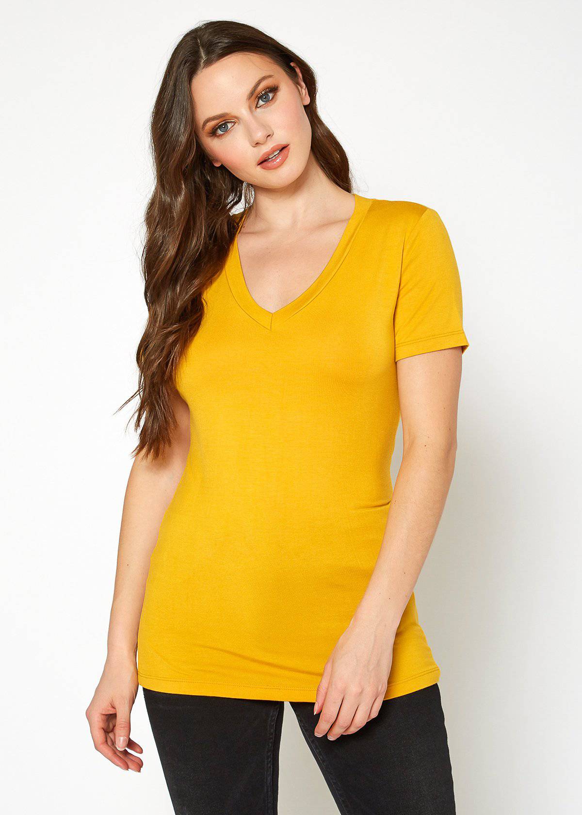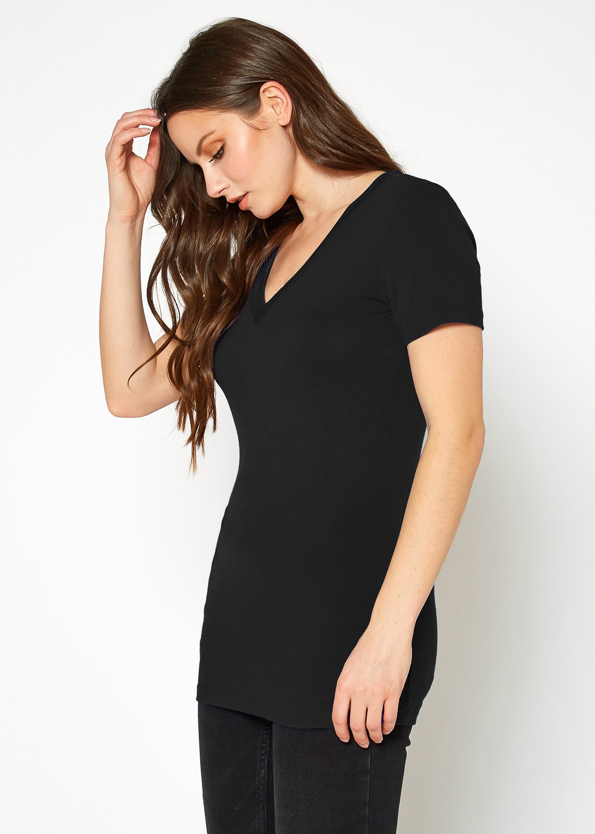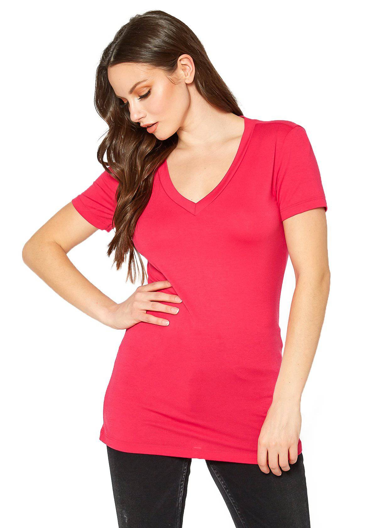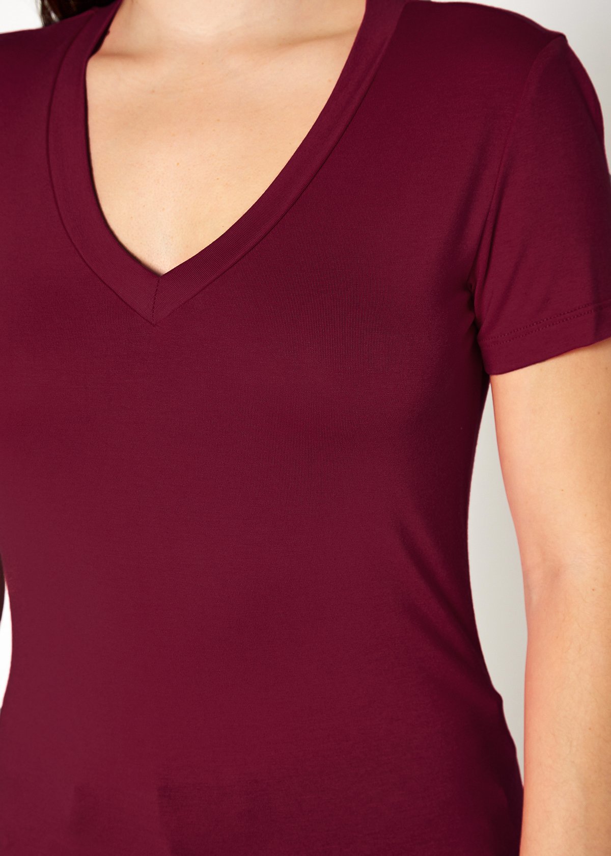 The fitted design of this V-neck tee accentuates your silhouette, making it a flattering choice for all body types. The V-neckline adds a touch of elegance, allowing you to dress it up or down depending on the occasion. Pair it with jeans for a casual look or with a skirt for a more polished outfit.