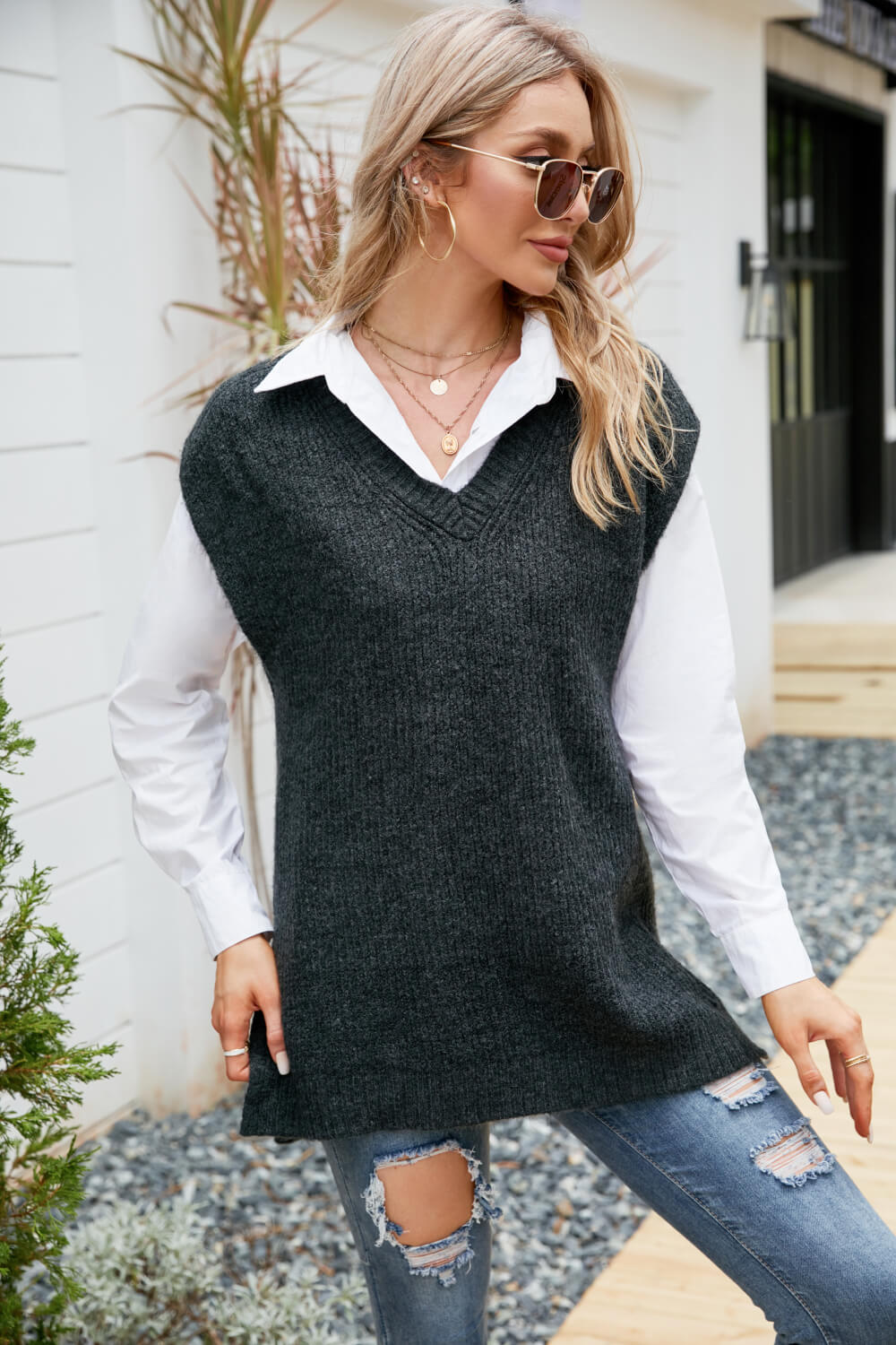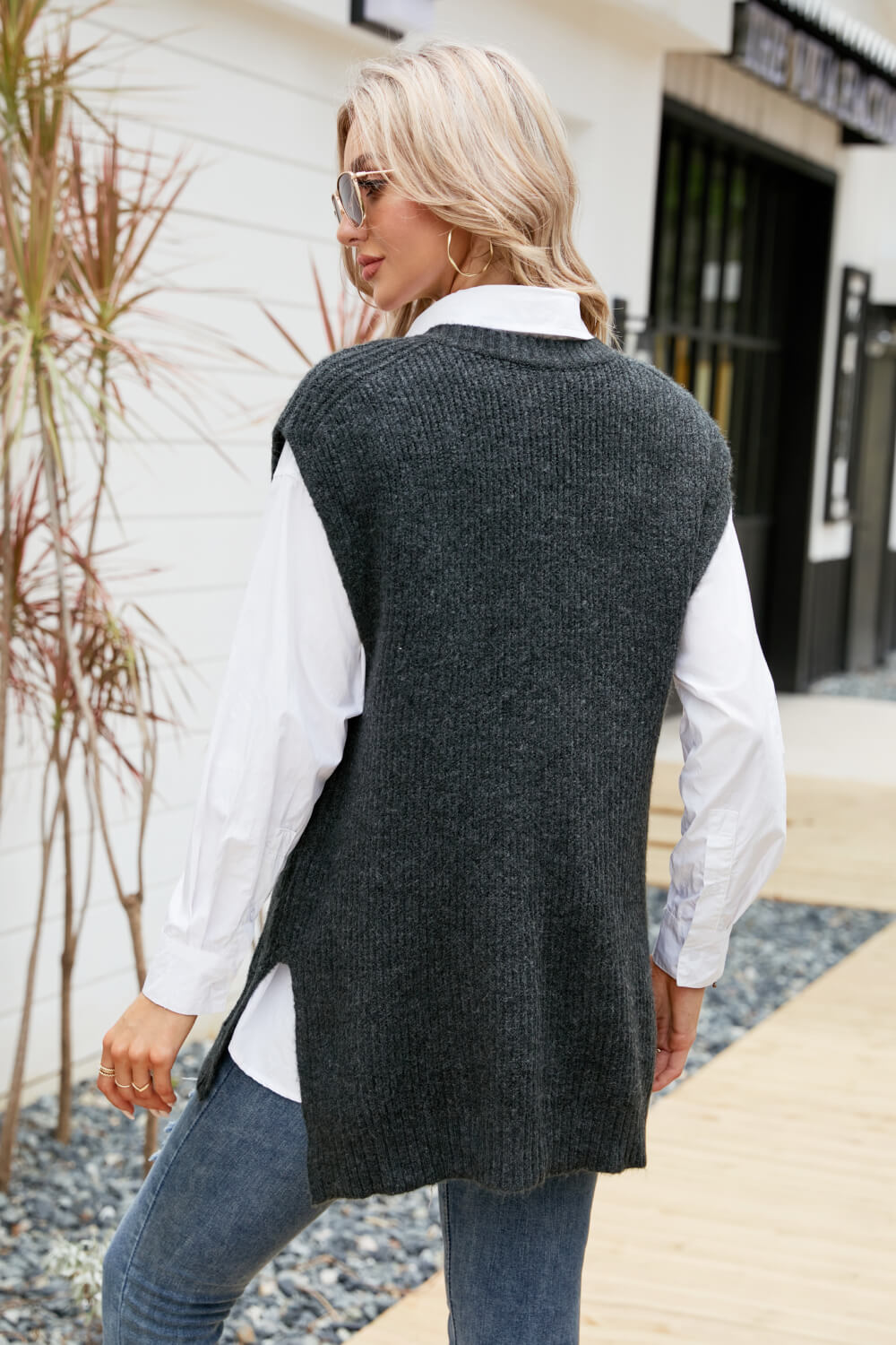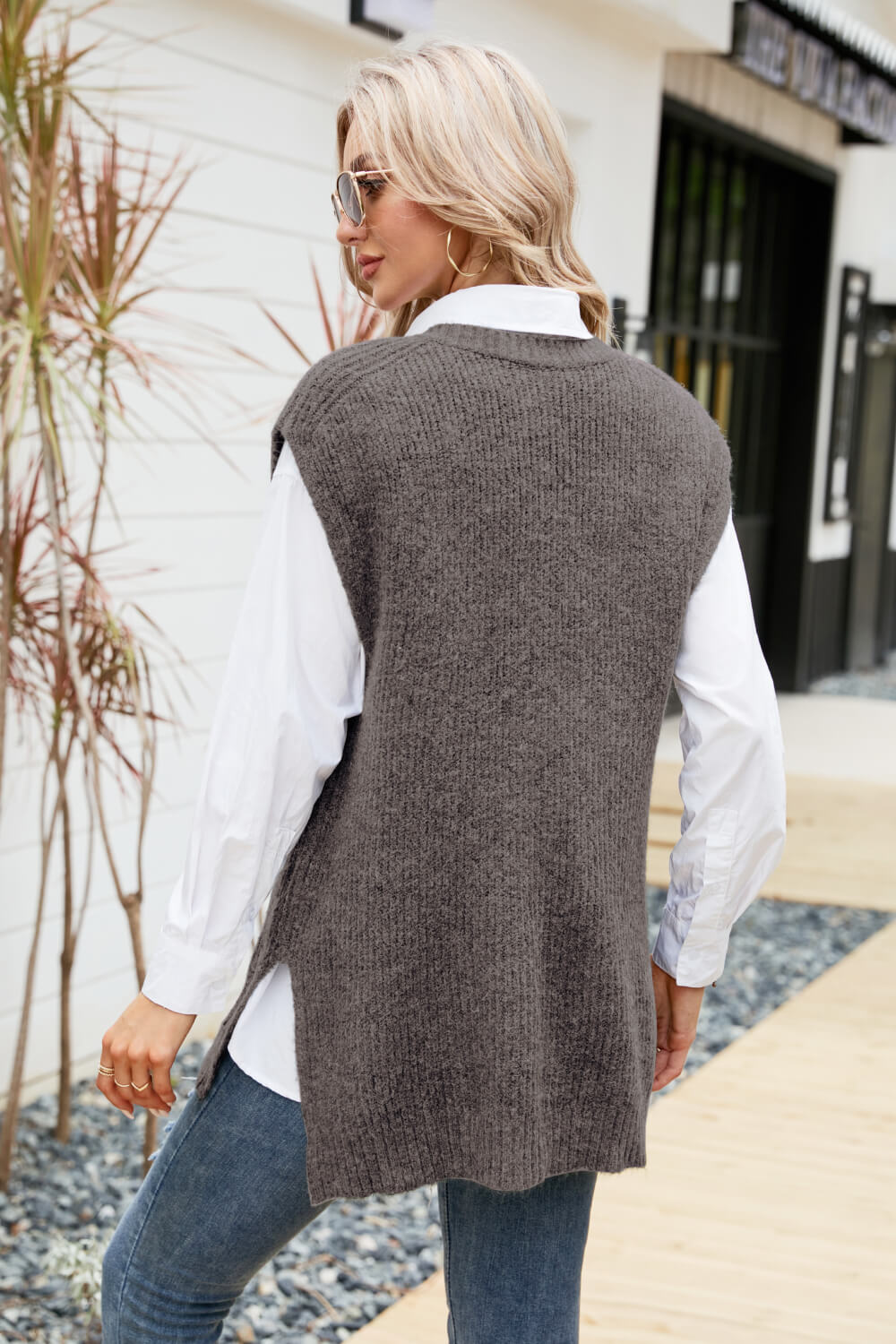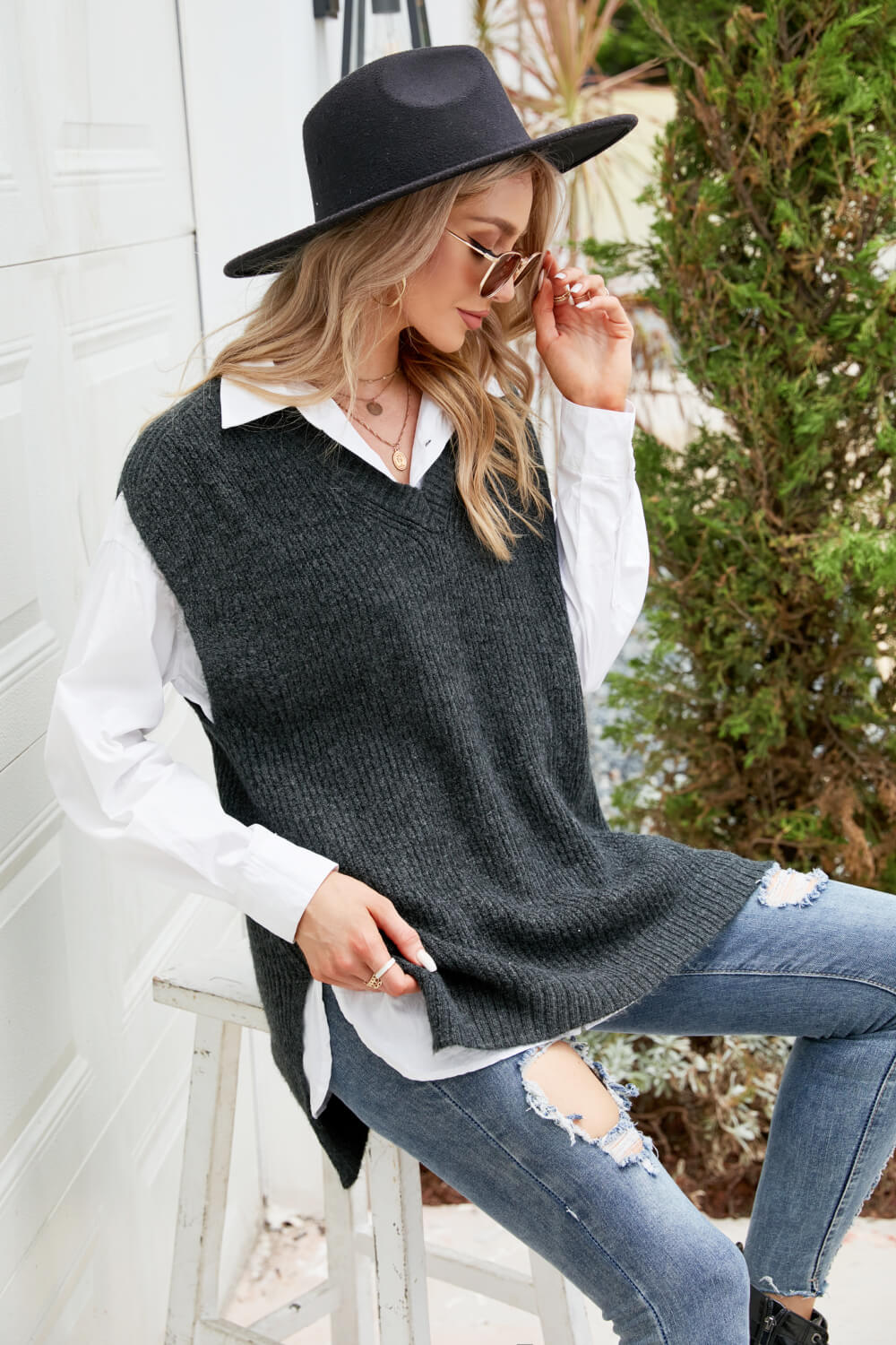 Whether you're dressing up for a casual outing or looking for a cozy layer to wear at home, the V-Neck Side Slit Sweater Vest is the perfect choice. Its chic design, comfortable fit, and easy-care fabric make it a go-to piece for any fashion-forward individual.