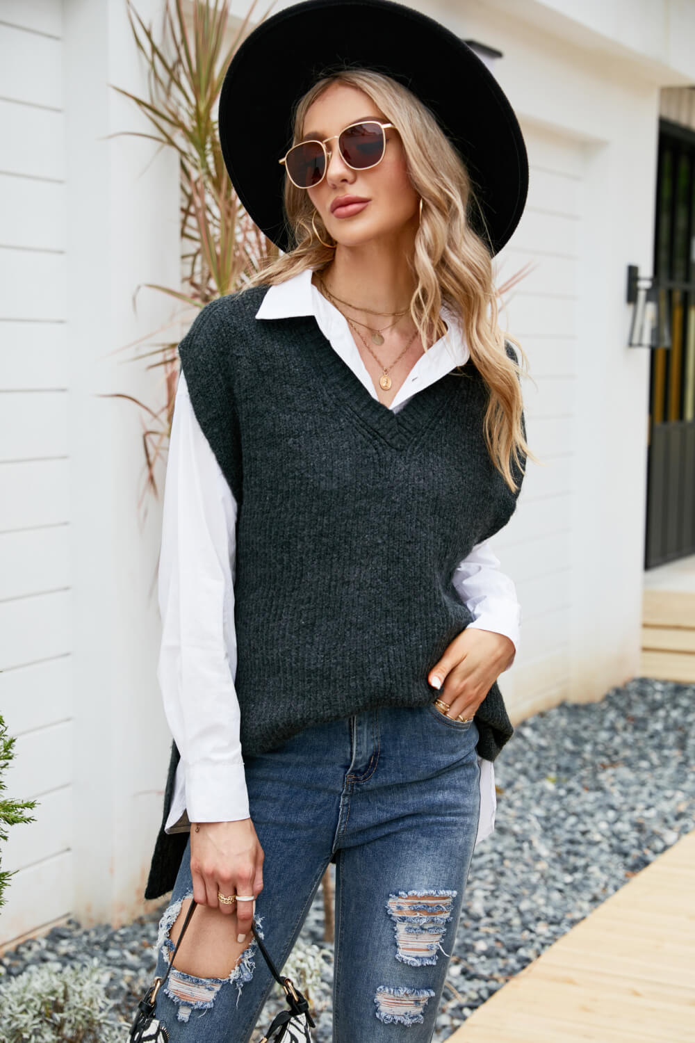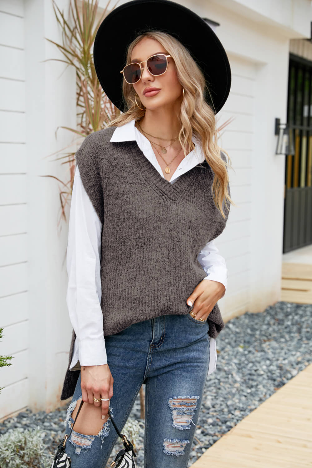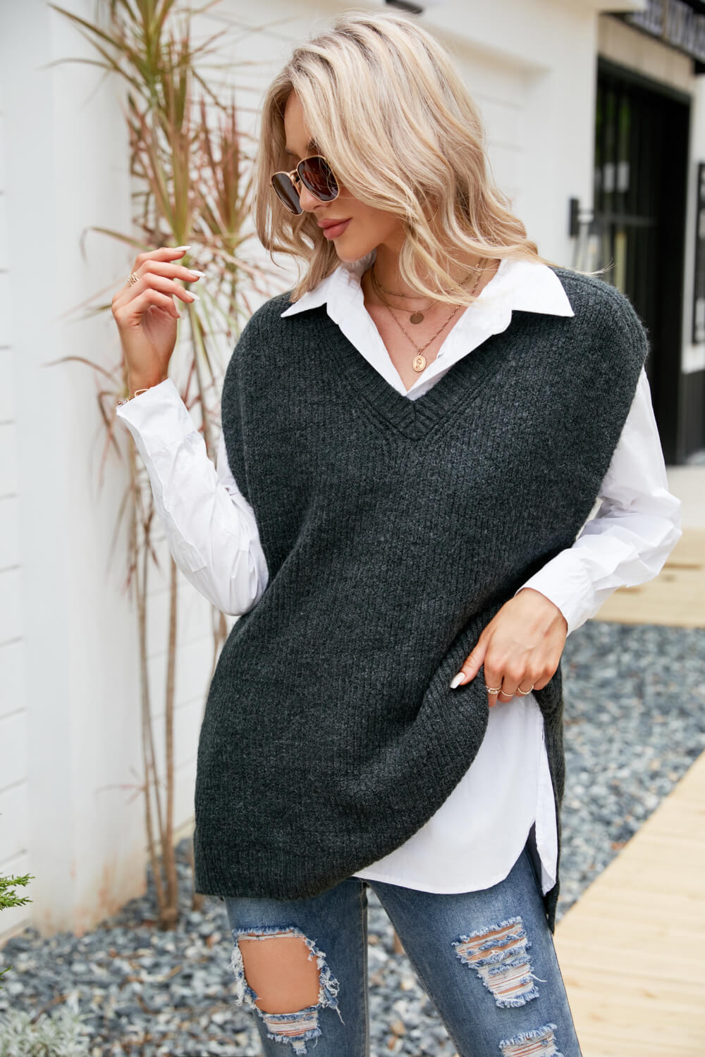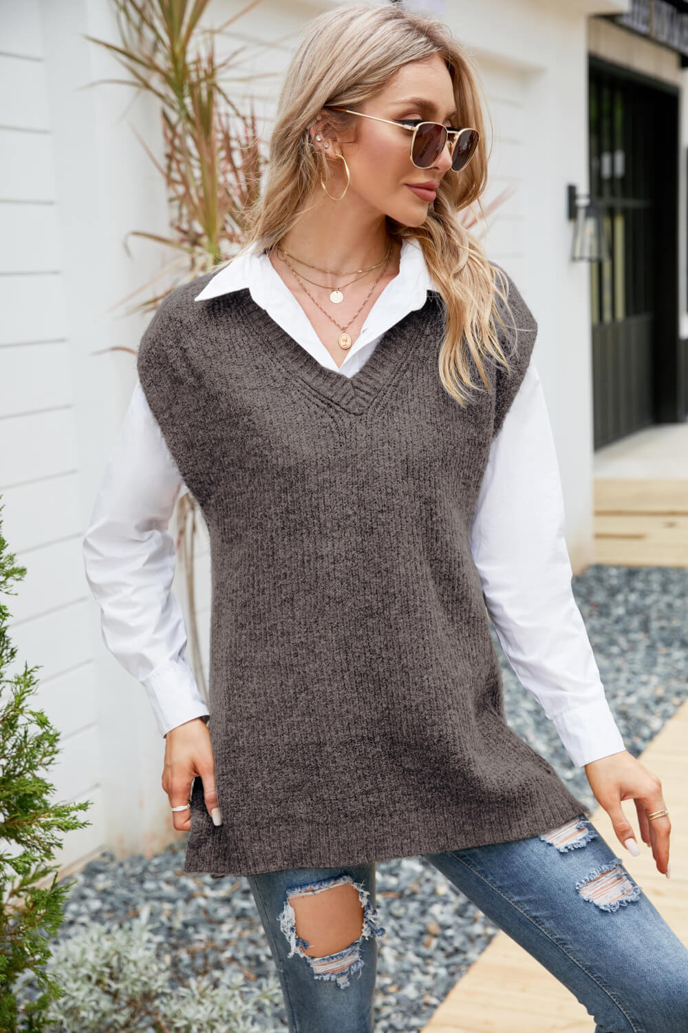 Whether you're dressing up for a casual outing or looking for a cozy layer to wear at home, the V-Neck Side Slit Sweater Vest is the perfect choice. Its chic design, comfortable fit, and easy-care fabric make it a go-to piece for any fashion-forward individual.