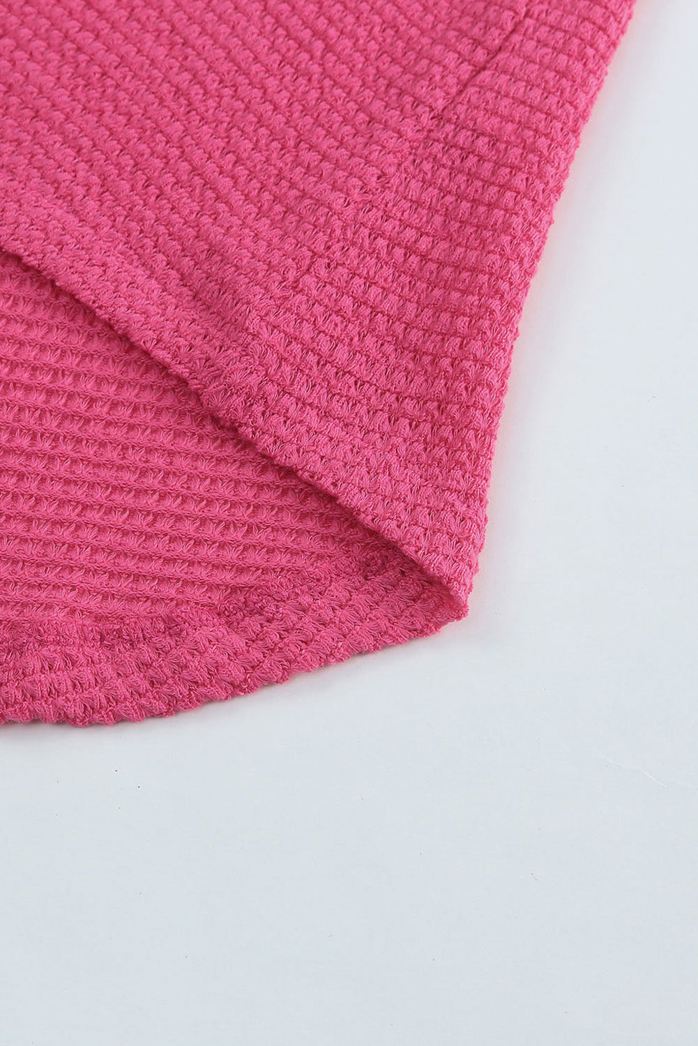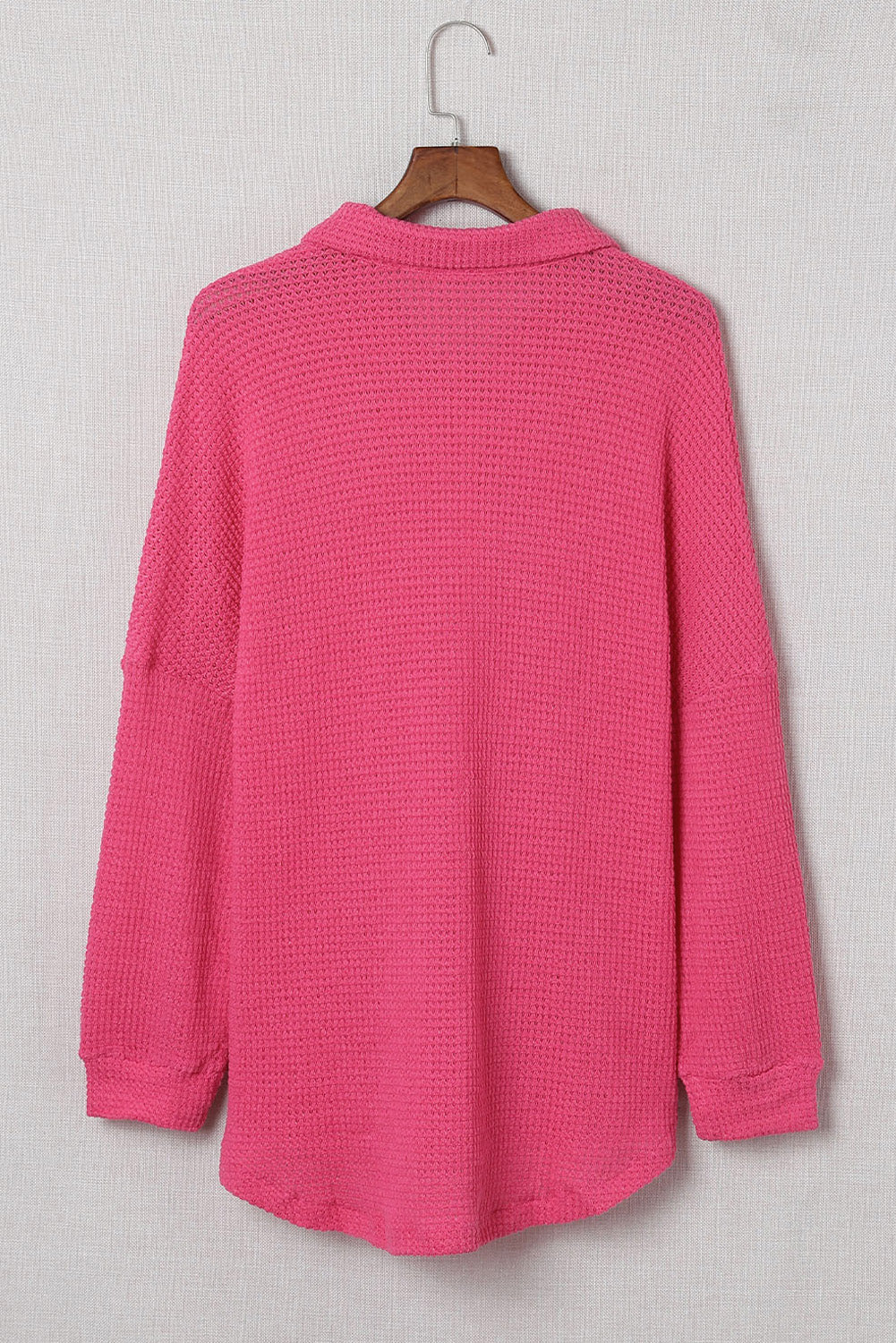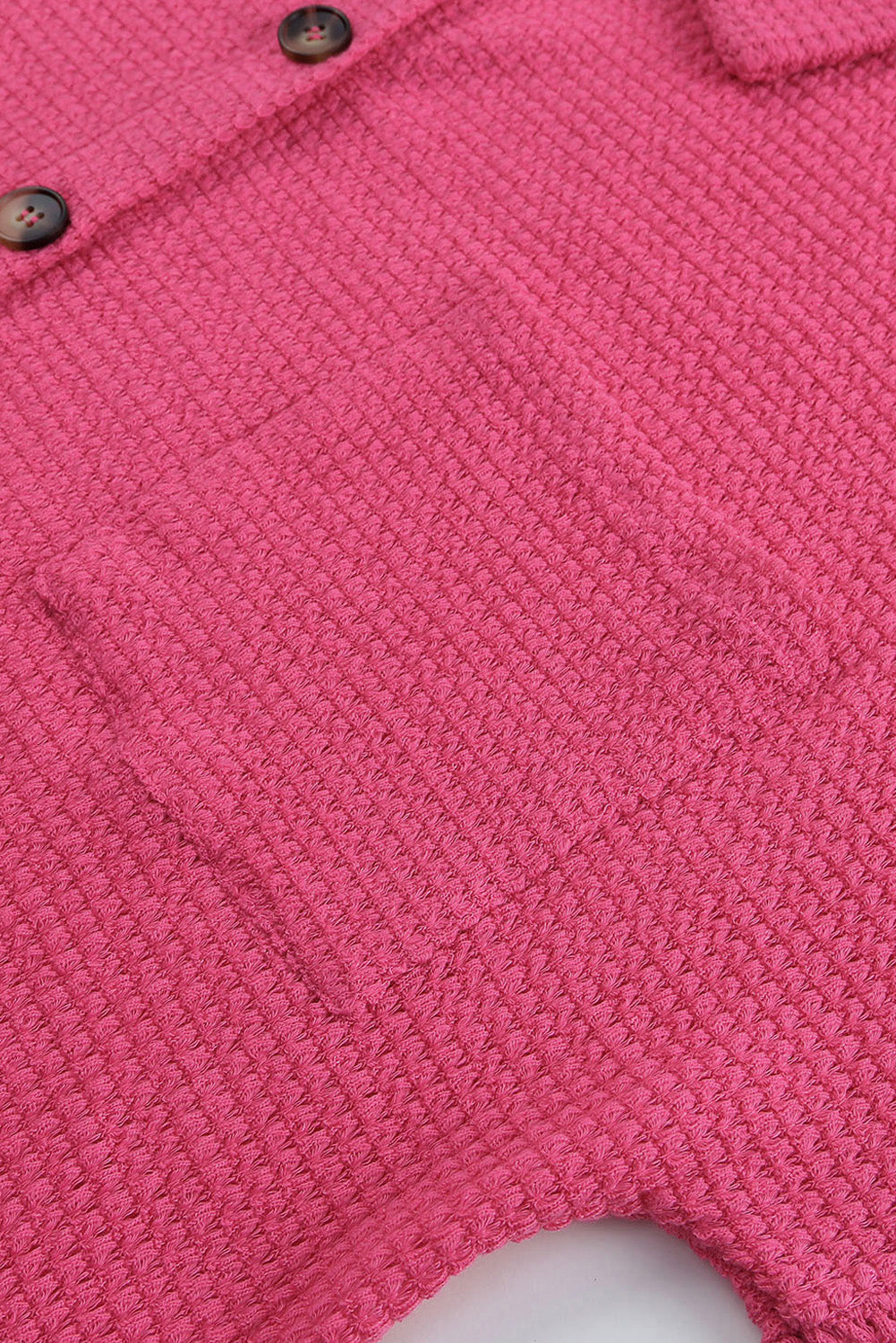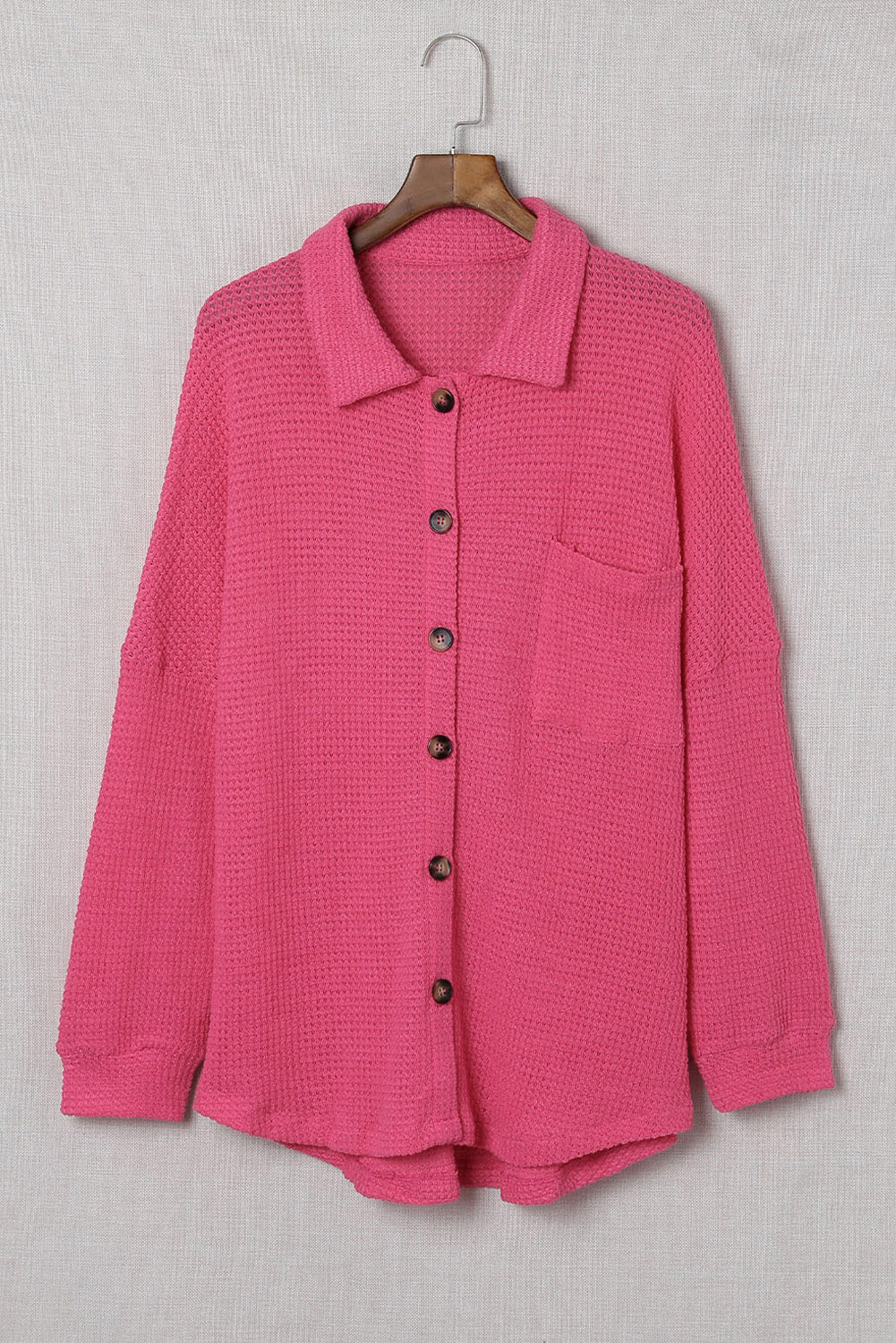 The Waffle Knit Button Up Casual Shirt features a trendy oversized design that flatters all body types. The button-up front allows for easy wear and adds a touch of sophistication to your outfit. With its classic collar and long sleeves, this shirt is perfect for layering or wearing on its own. The plain pattern ensures versatility, allowing you to pair it with jeans, skirts, or shorts effortlessly.