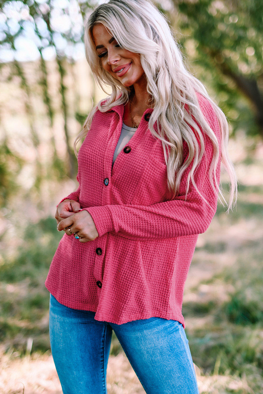 Introducing the Waffle Knit Button Up Casual Shirt, a must-have addition to any stylish woman's wardrobe. This shirt is designed to offer both comfort and elegance, making it suitable for a variety of occasions. Whether you're heading to brunch with friends or a casual day at the office, this shirt will keep you looking chic and feeling great.
