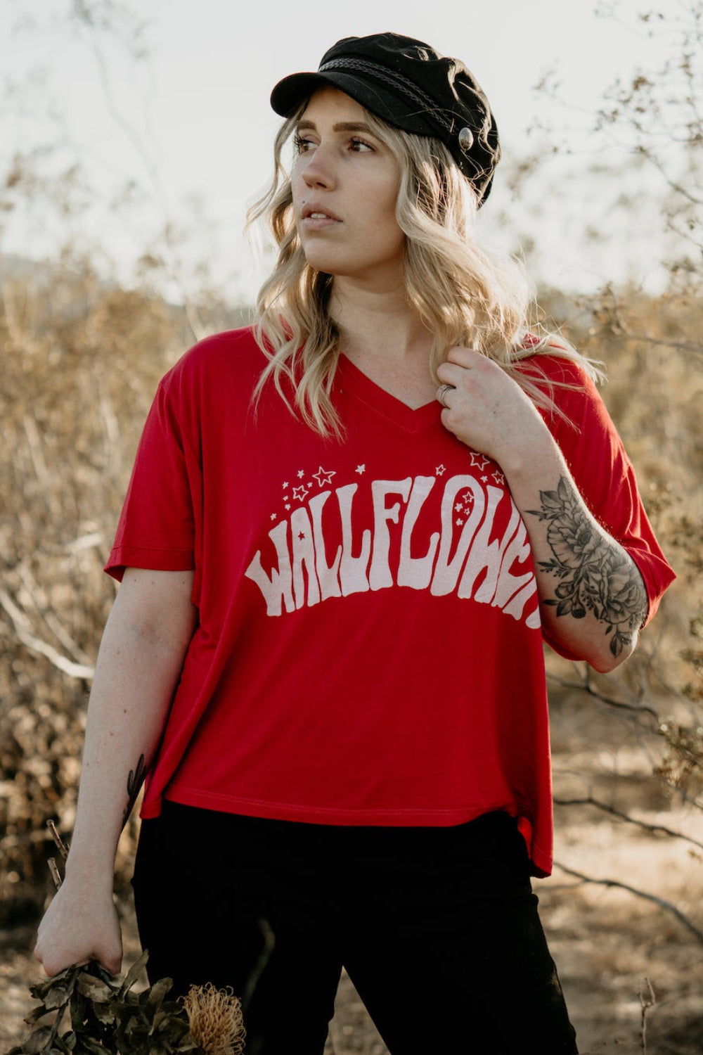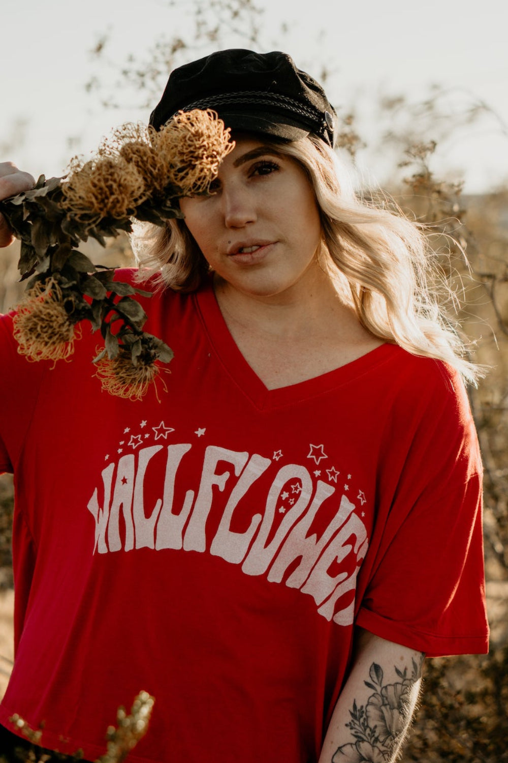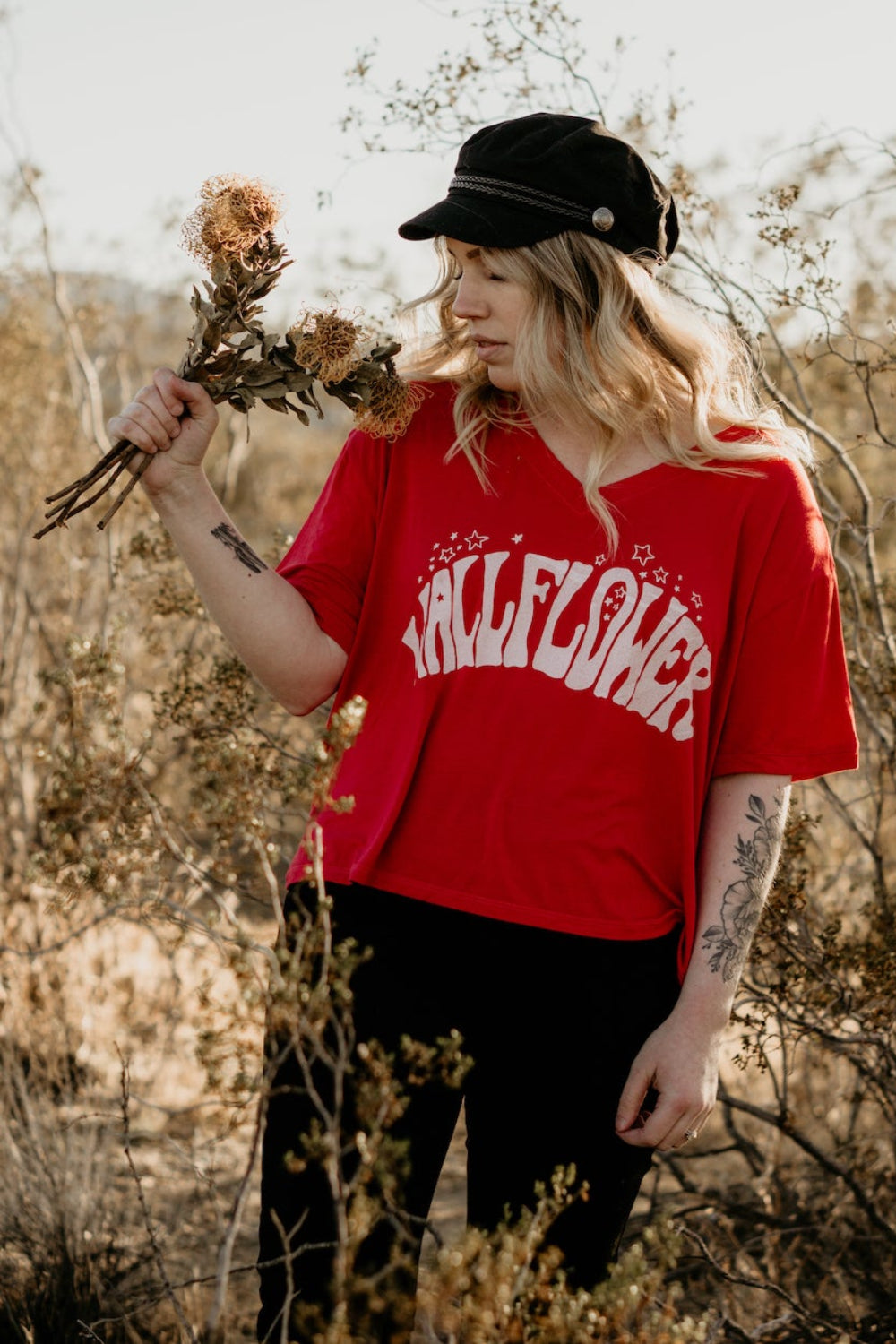 Introducing the Wallflower Vintage V-Neck T-Shirt, a stylish and comfortable addition to your wardrobe that captures the essence of retro 70s fashion. This slouchy V-neck shirt is designed for those who appreciate a relaxed fit while making a bold statement. The vibrant red color combined with the eye-catching 'Wallflower' print in psychedelic lettering makes this t-shirt a standout piece for any casual outfit.