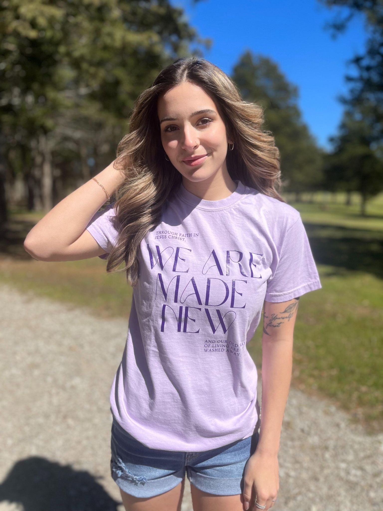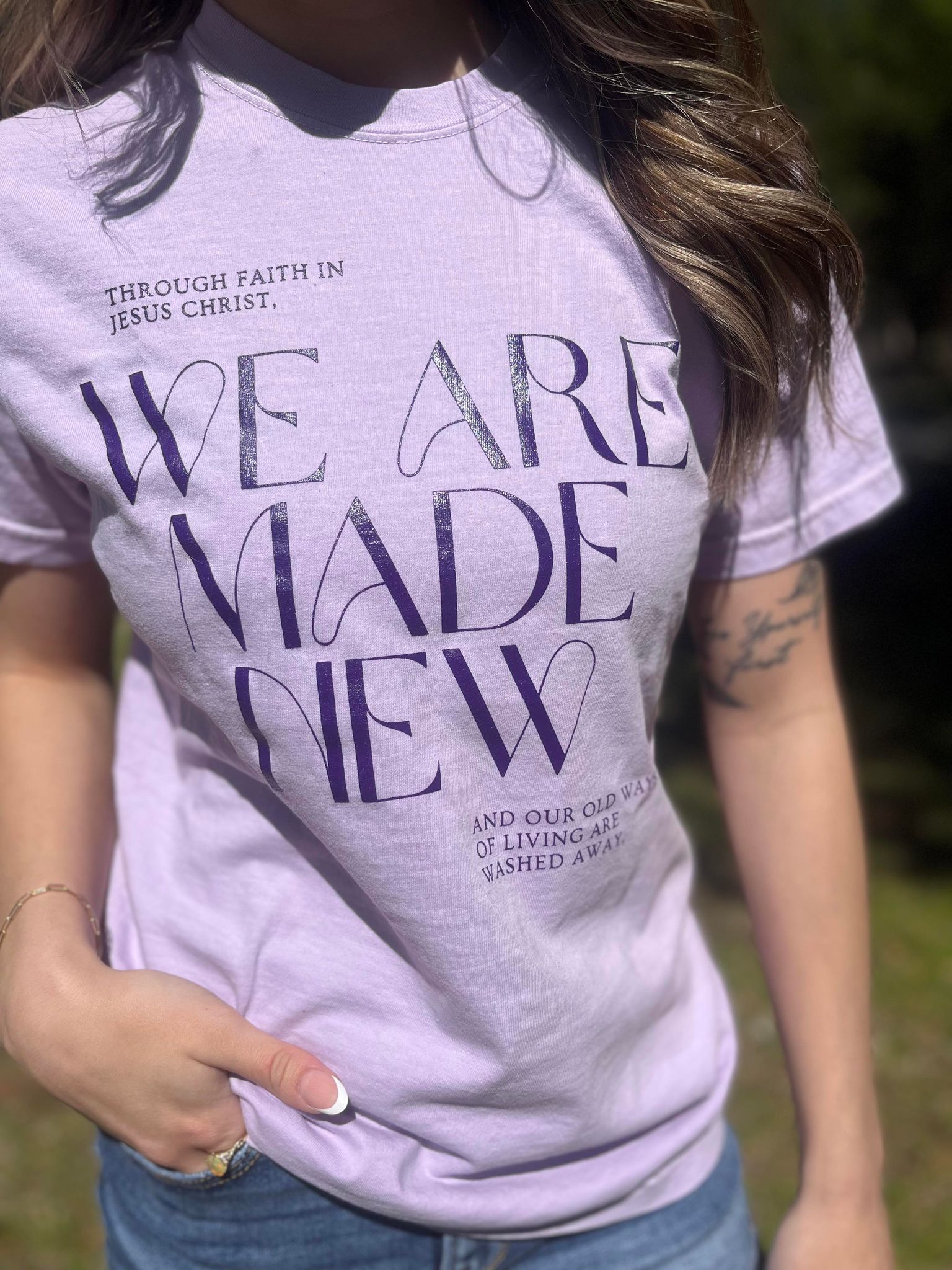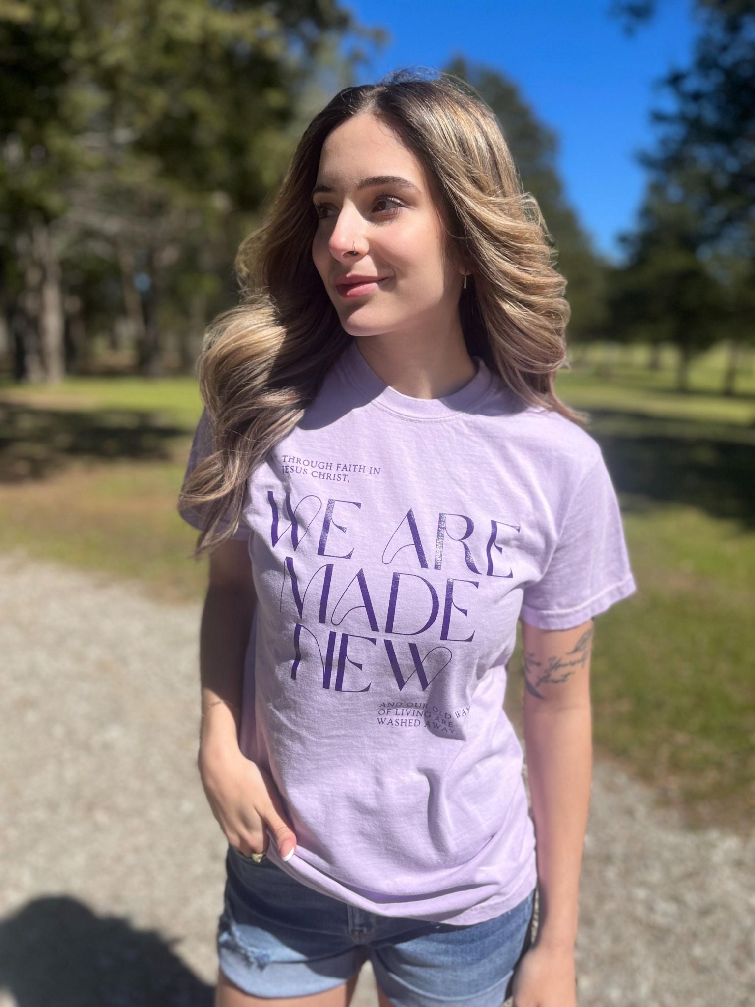 A stylish monochrome purple tee with the text 'We Are Made New' printed on it, showcasing a comfortable fit.