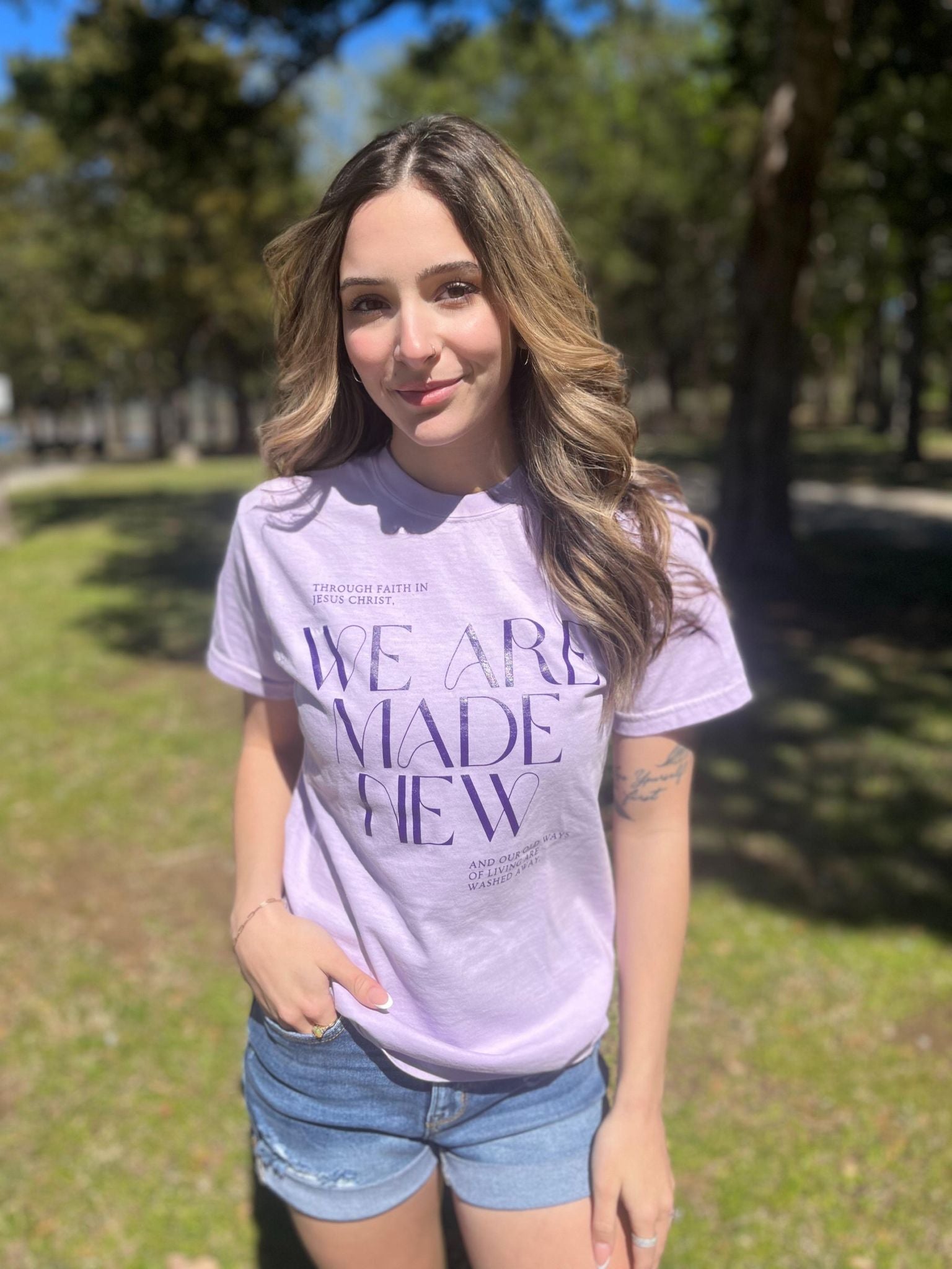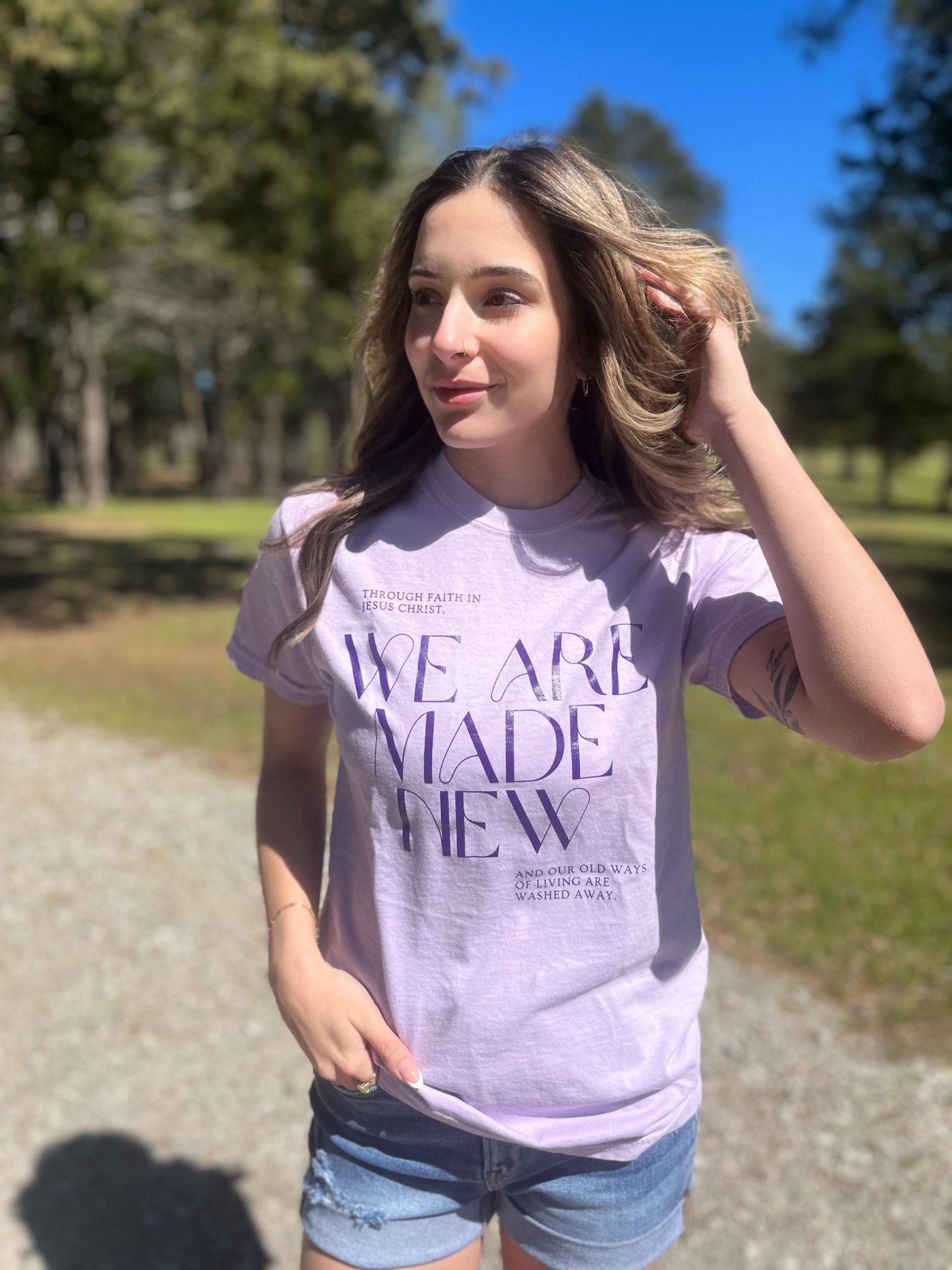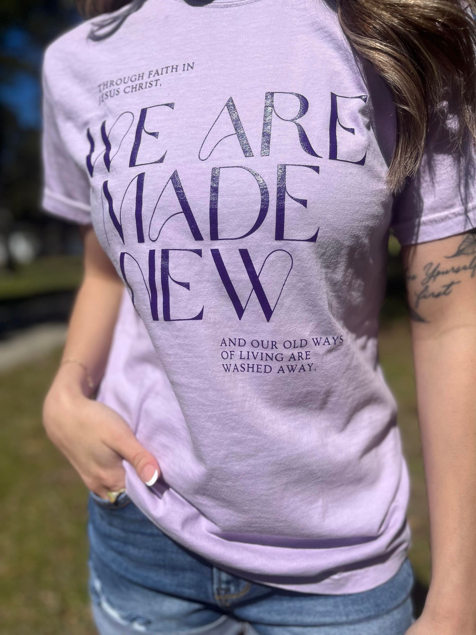 A stylish monochrome purple tee with the text 'We Are Made New' printed on it, showcasing a comfortable fit.
