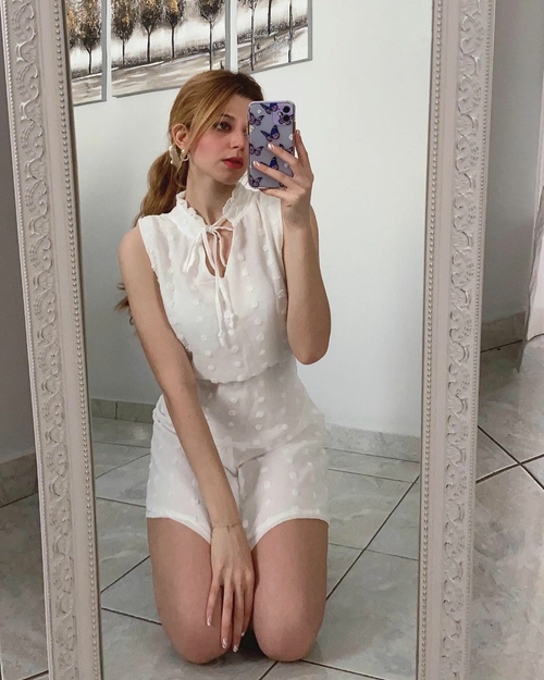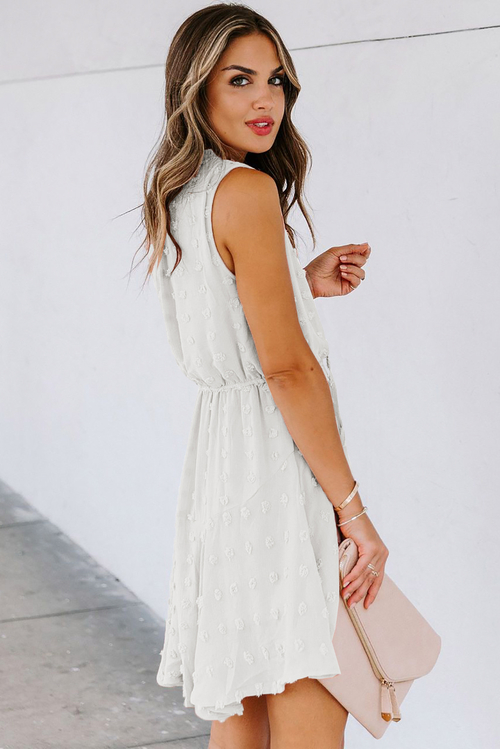 White Split Neck Pom Pom Textured Flowy Mini Dress