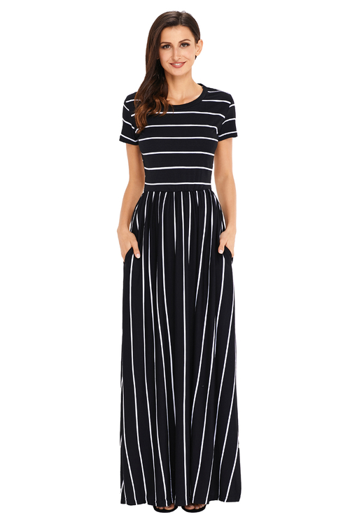 White Striped Black Short Sleeve Maxi Dress