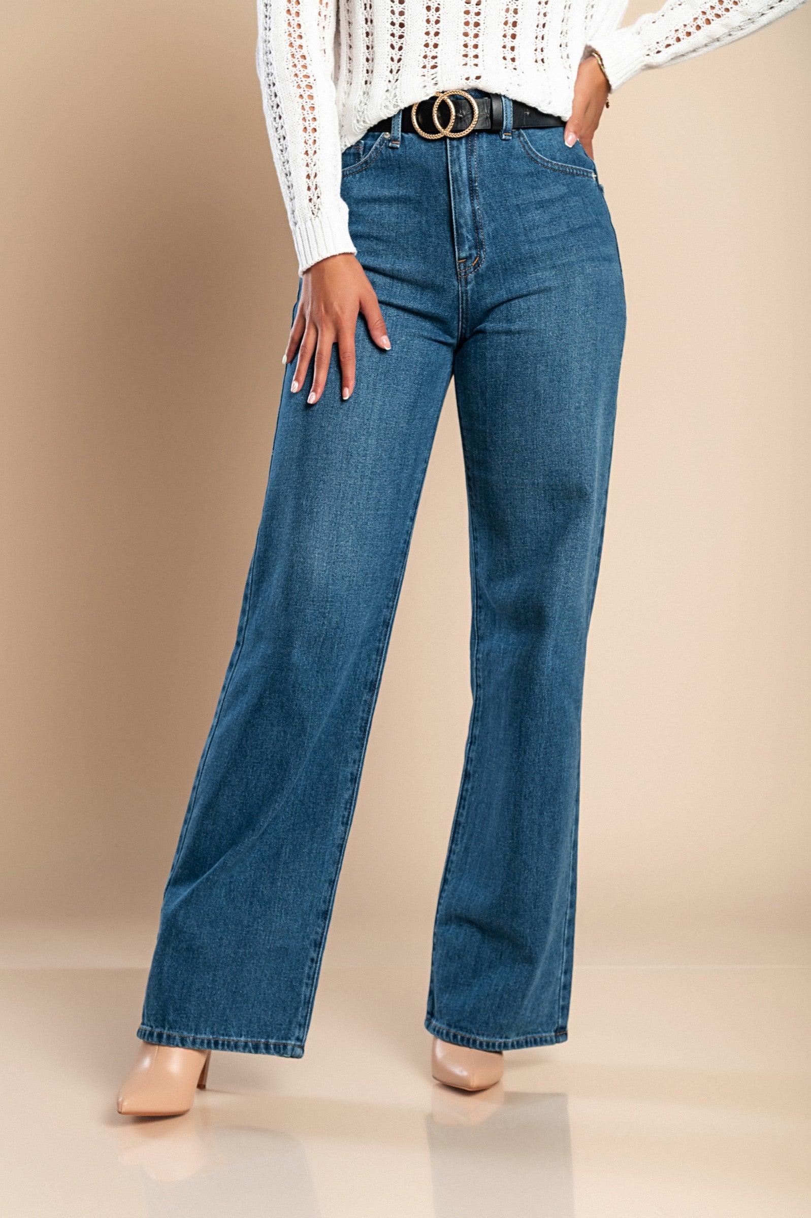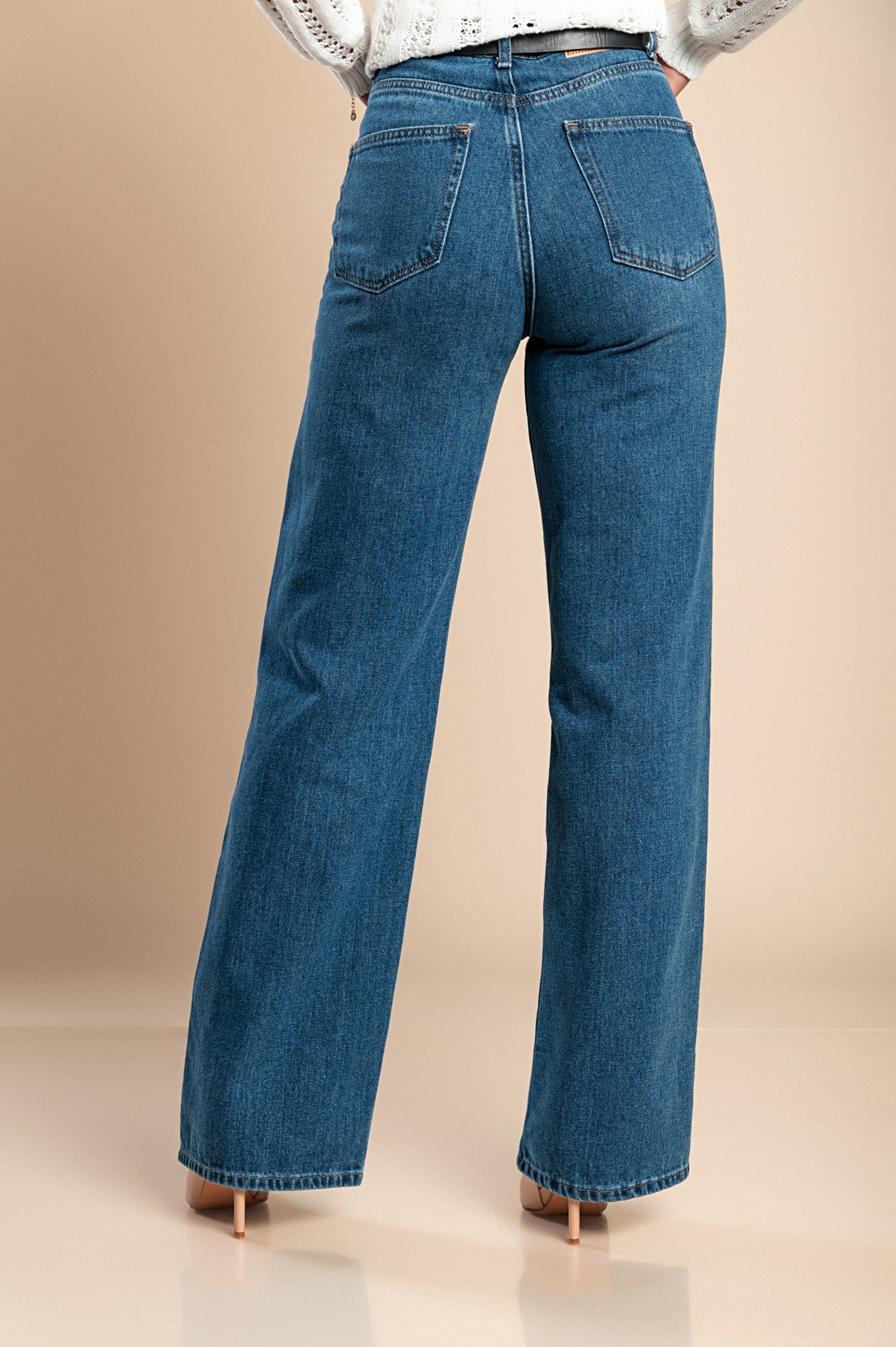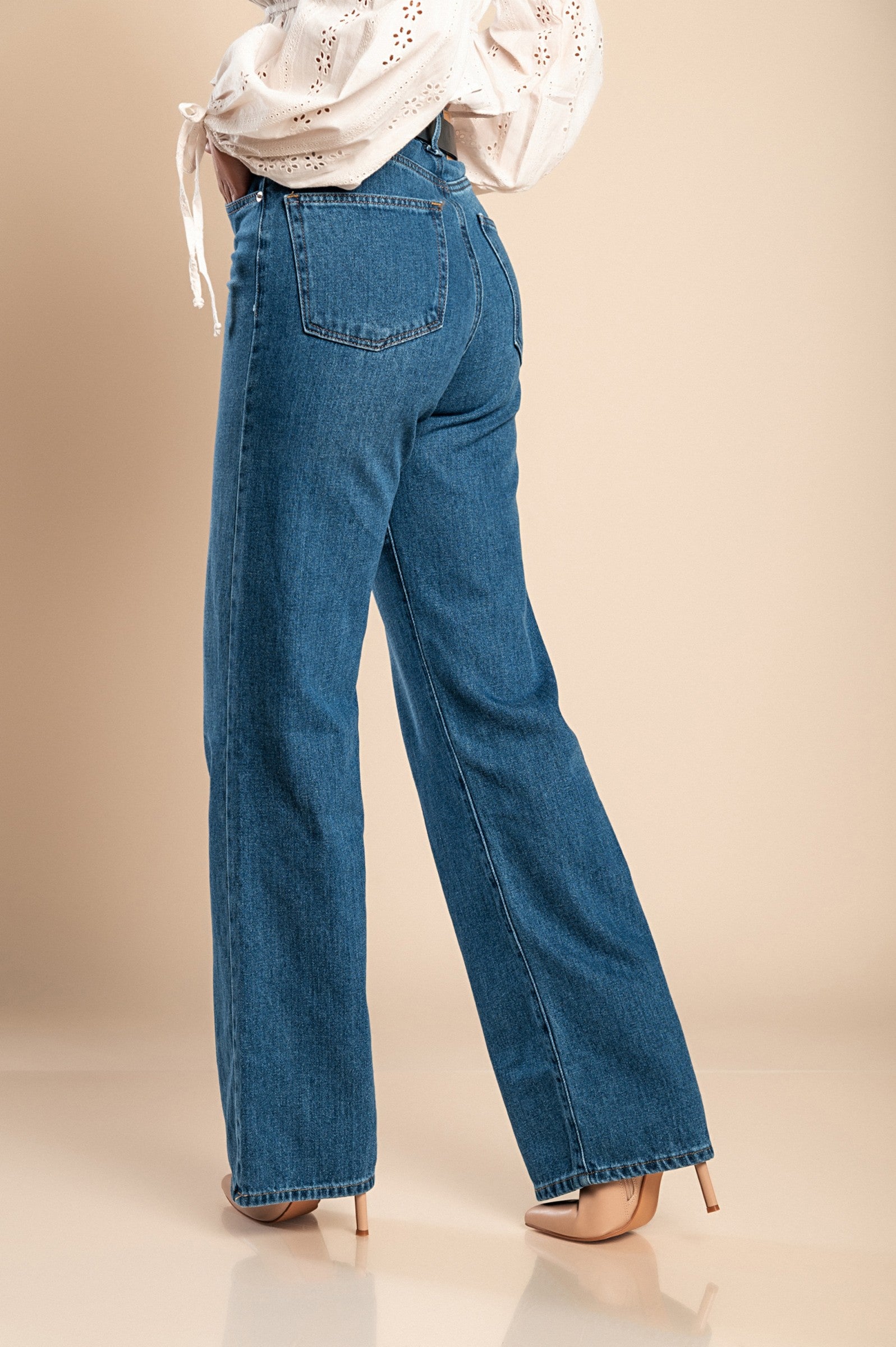 A pair of stylish blue wide-leg jeans made from high-quality cotton, featuring a high waist, front and back pockets, and a zip and button closure.