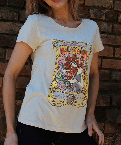 Wild Bohemian Child t-shirt in soft fabric, showcasing a bohemian style with a flattering fit.