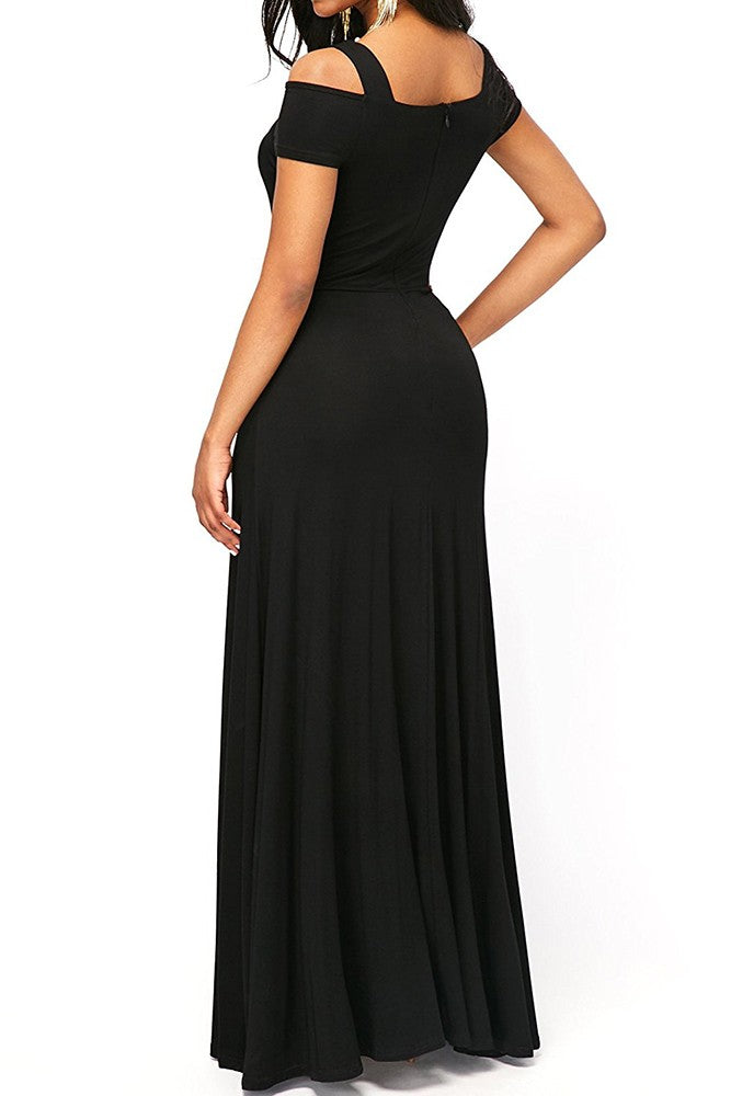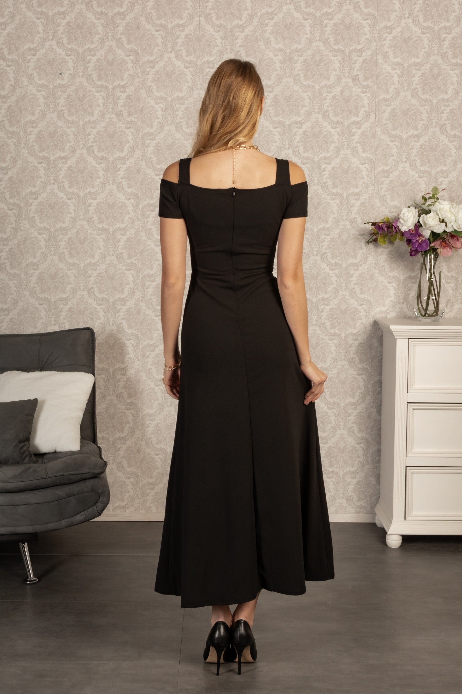 Elegant long black dress for women with open shoulders and side cut-out, featuring a beautiful cleavage design and short sleeves.