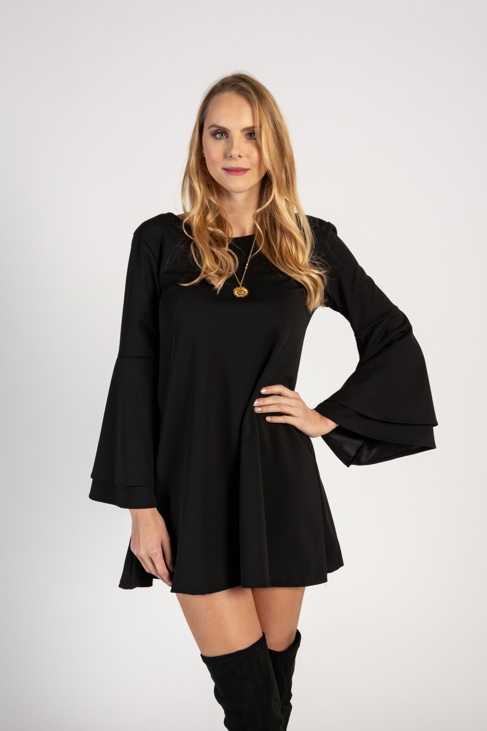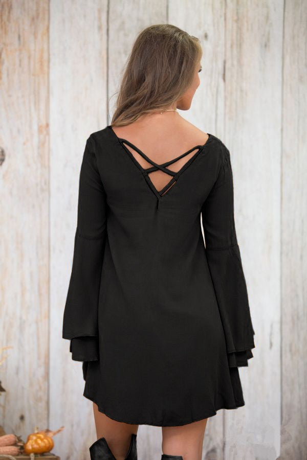 The dress features elegant bell sleeves that add a touch of sophistication and femininity to the overall design. The wider lower part of the dress provides comfort and ease of movement, making it perfect for all-day wear. Additionally, the special back design detail sets this dress apart from others, giving it a unique flair that is sure to turn heads.