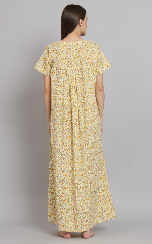 Women Floral Printed Pure Cotton Maxi Nightdress Yellow(Size M)
