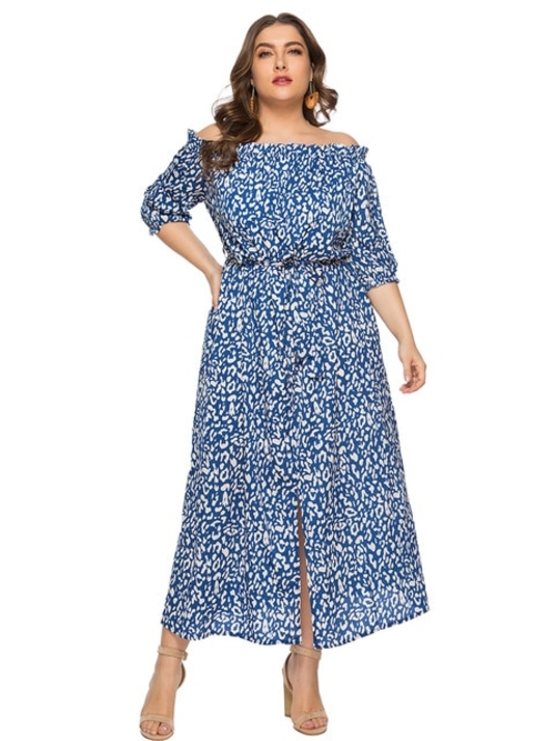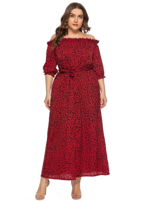 Model Number: 20190326 Plus Size Boat Collar Leopard Print Belt Dress