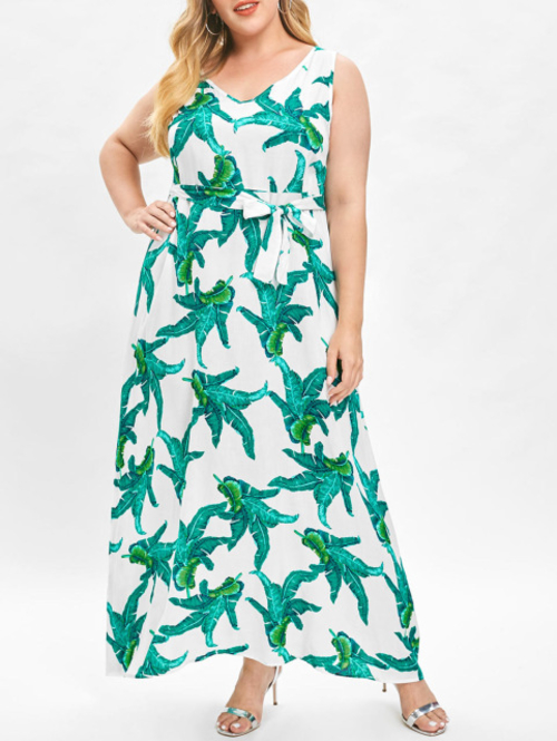 Model Number: 20190530 Plus Size Plunge Palm Print Maxi Dress