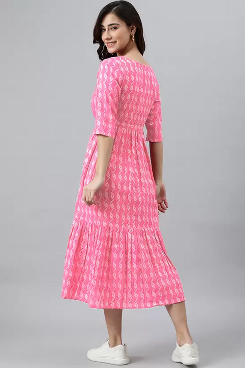 Women Printed Cotton Blend Ethnic Dress  (Pink) size M
