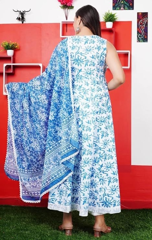Women's Blue Cotton Floral Printed Anarkali Kurta with Dupatta set