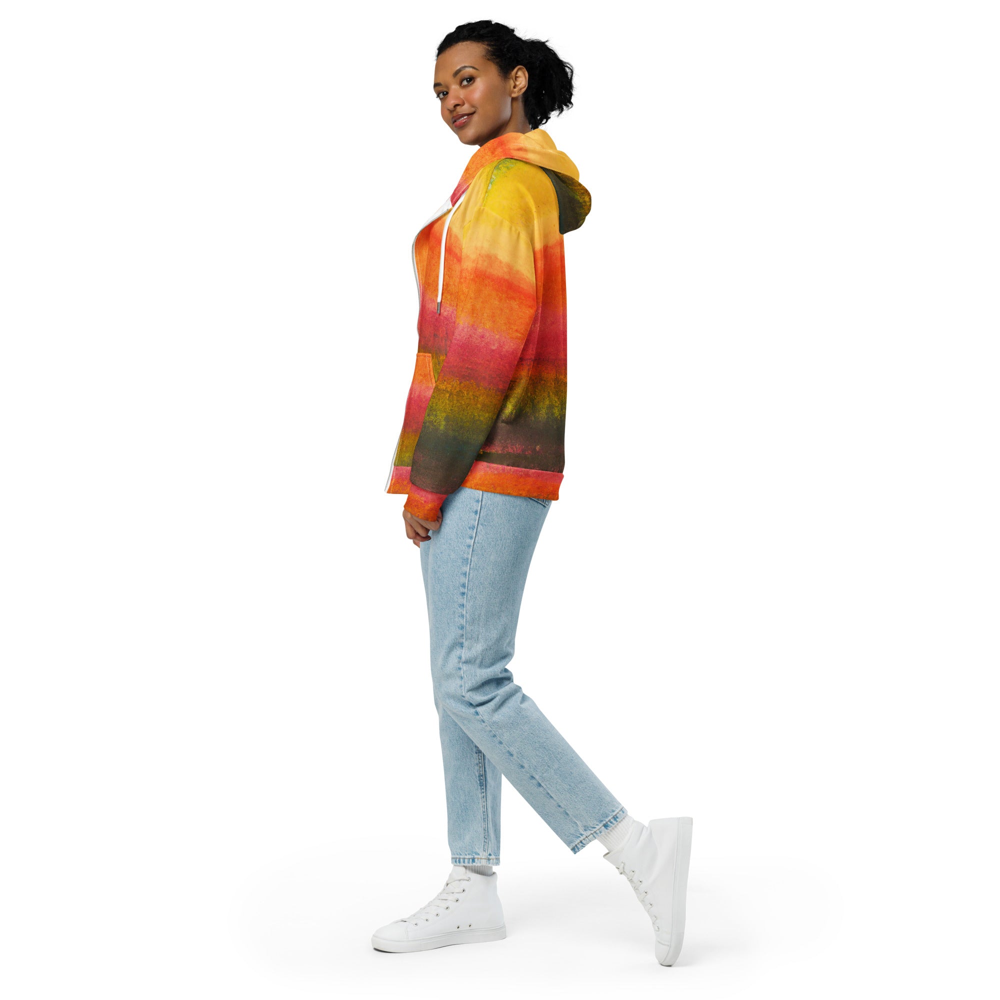 Whether you're heading out for a casual day with friends, lounging at home, or running errands, the Women's Graphic Zip Hoodie is the perfect companion. Its versatile design allows you to pair it with jeans, leggings, or even a skirt for a chic look. The unique watercolor abstract print makes it a standout piece that can elevate any outfit.