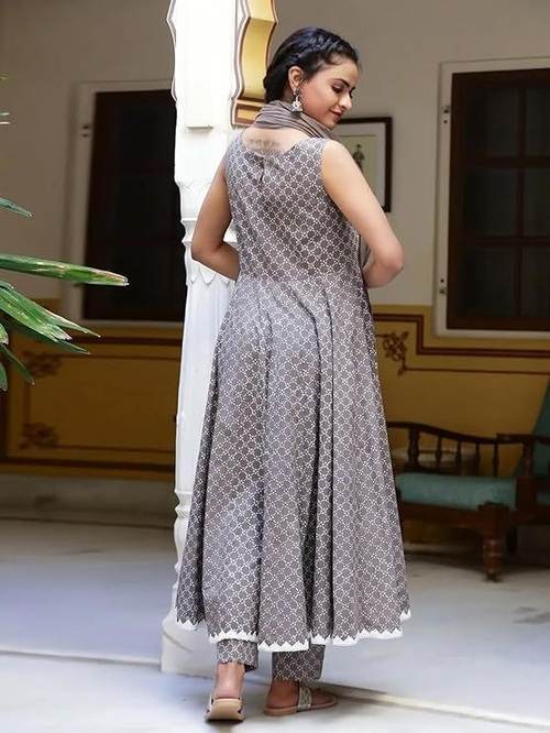 Women's Grey Cotton Printed Anarkali Kurta with Pant and Dupatta set