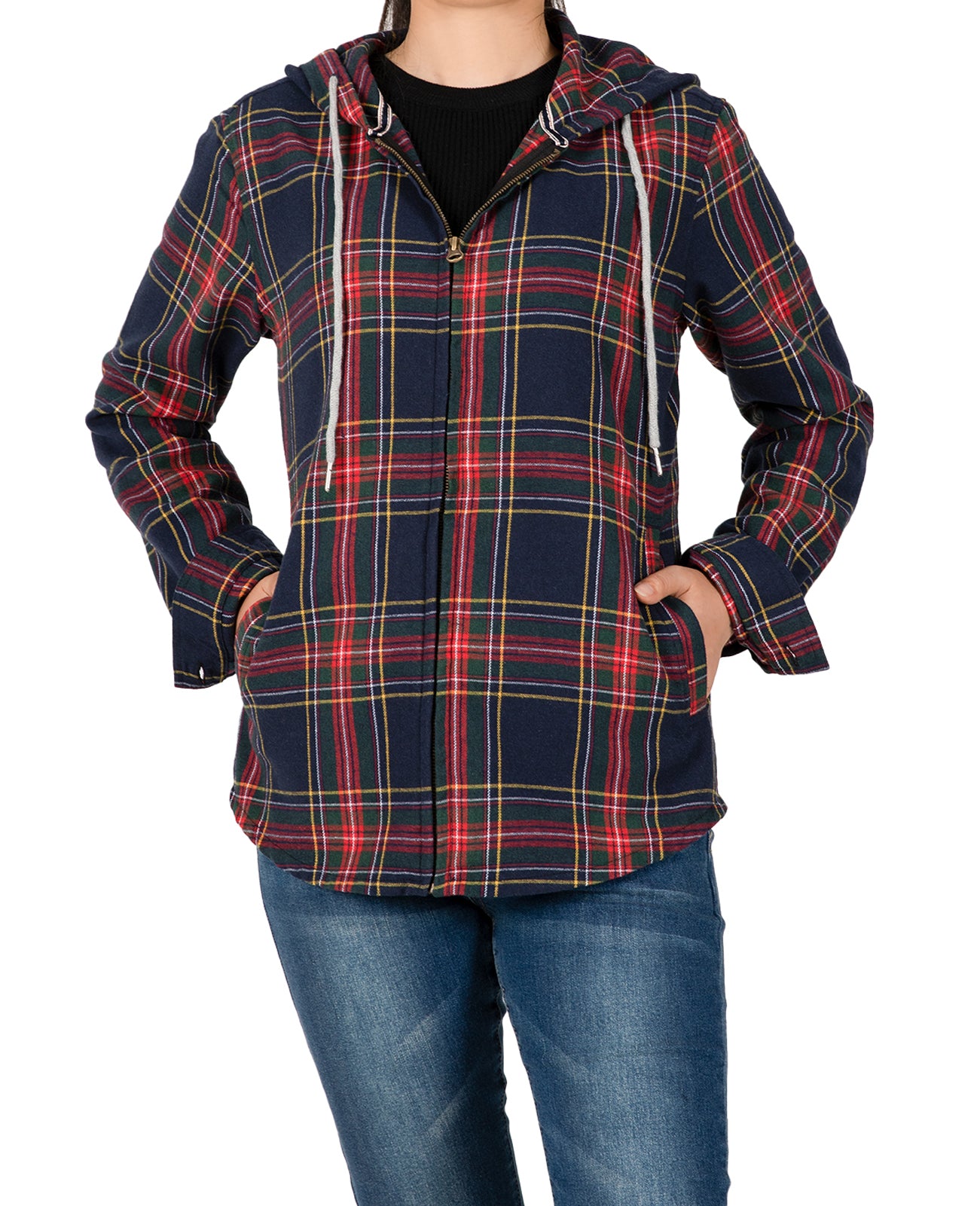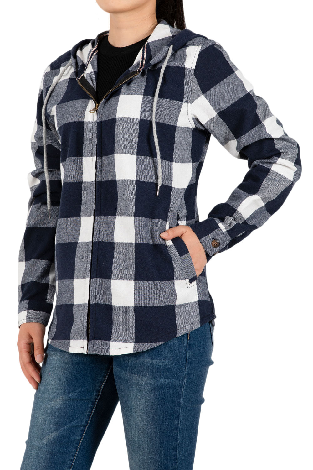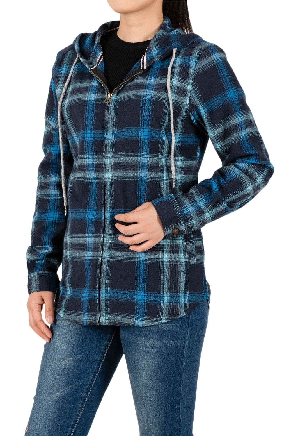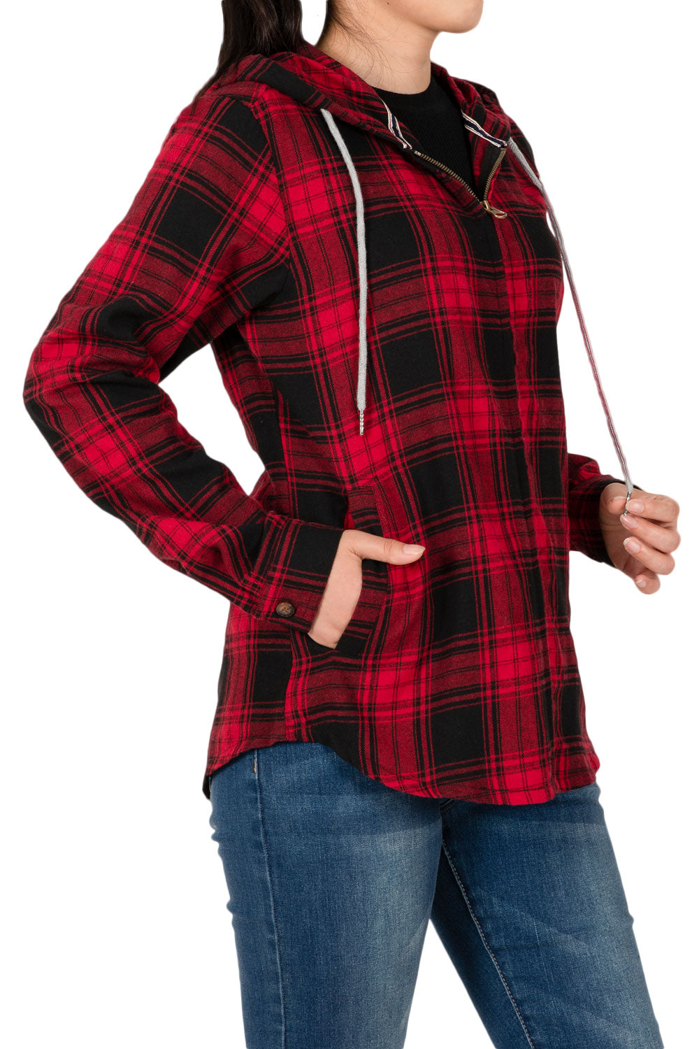 Women's Hooded Plaid Brushed Flannel Shirt in a stylish plaid pattern, featuring a full zip and cozy hood.
