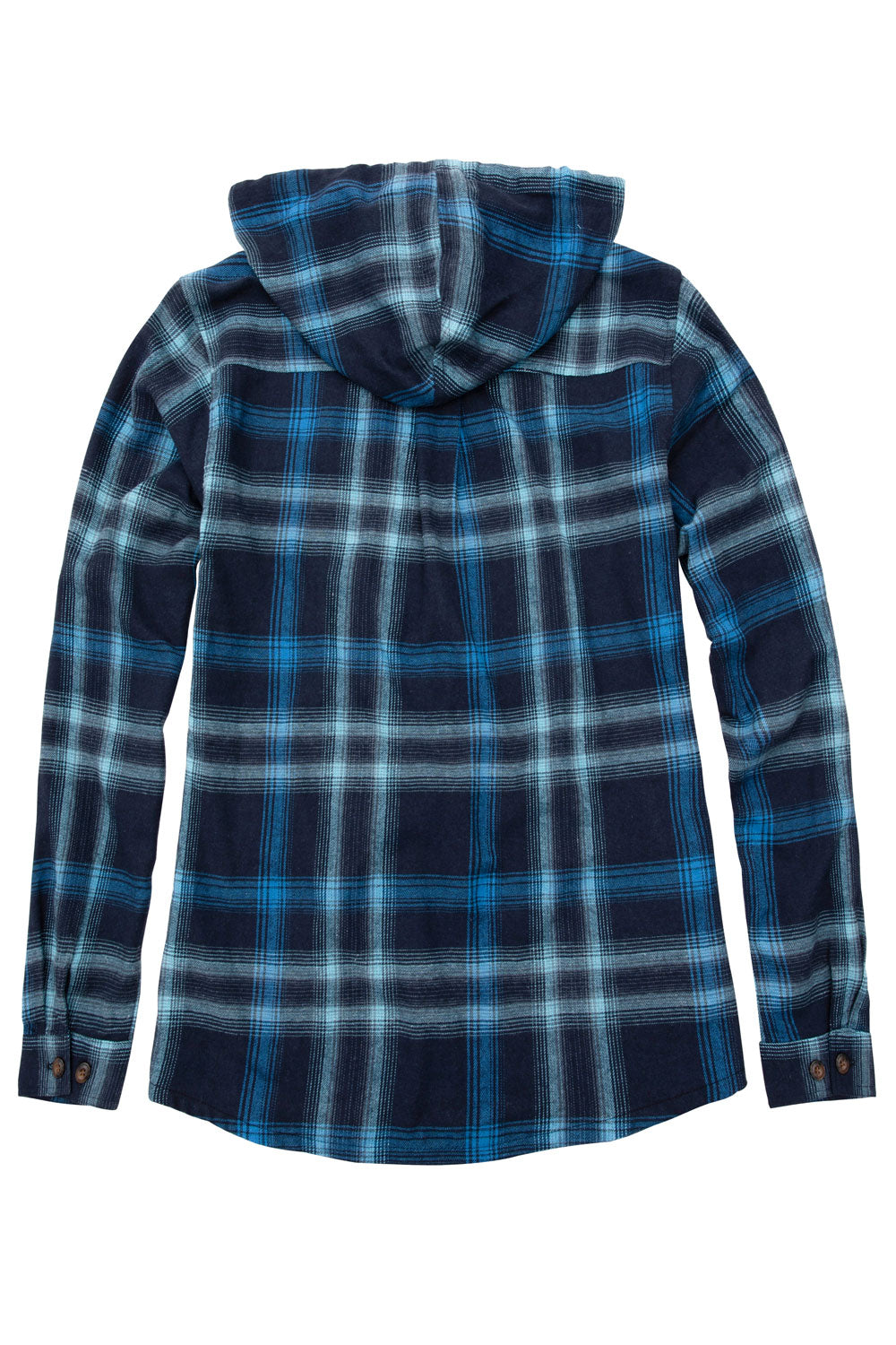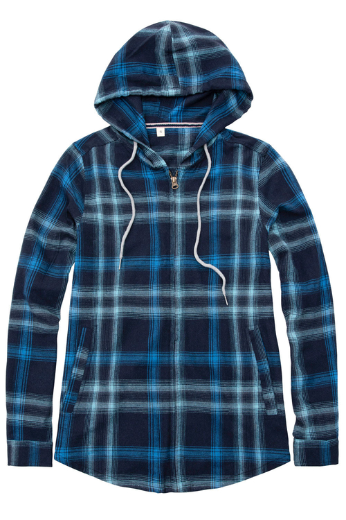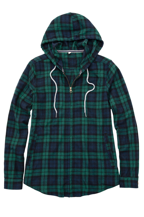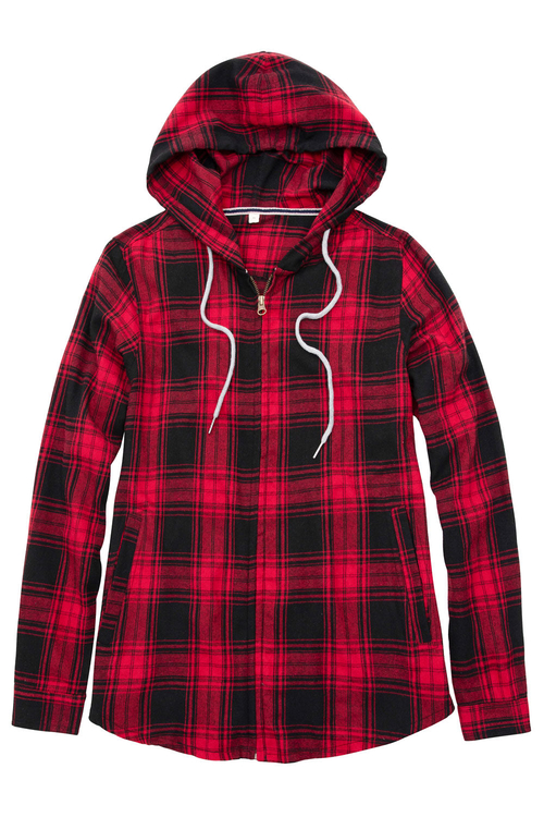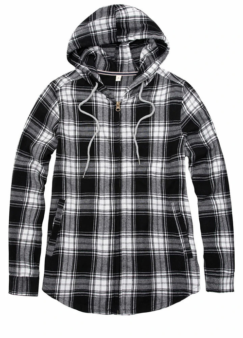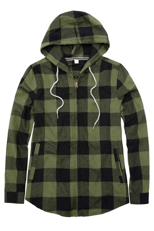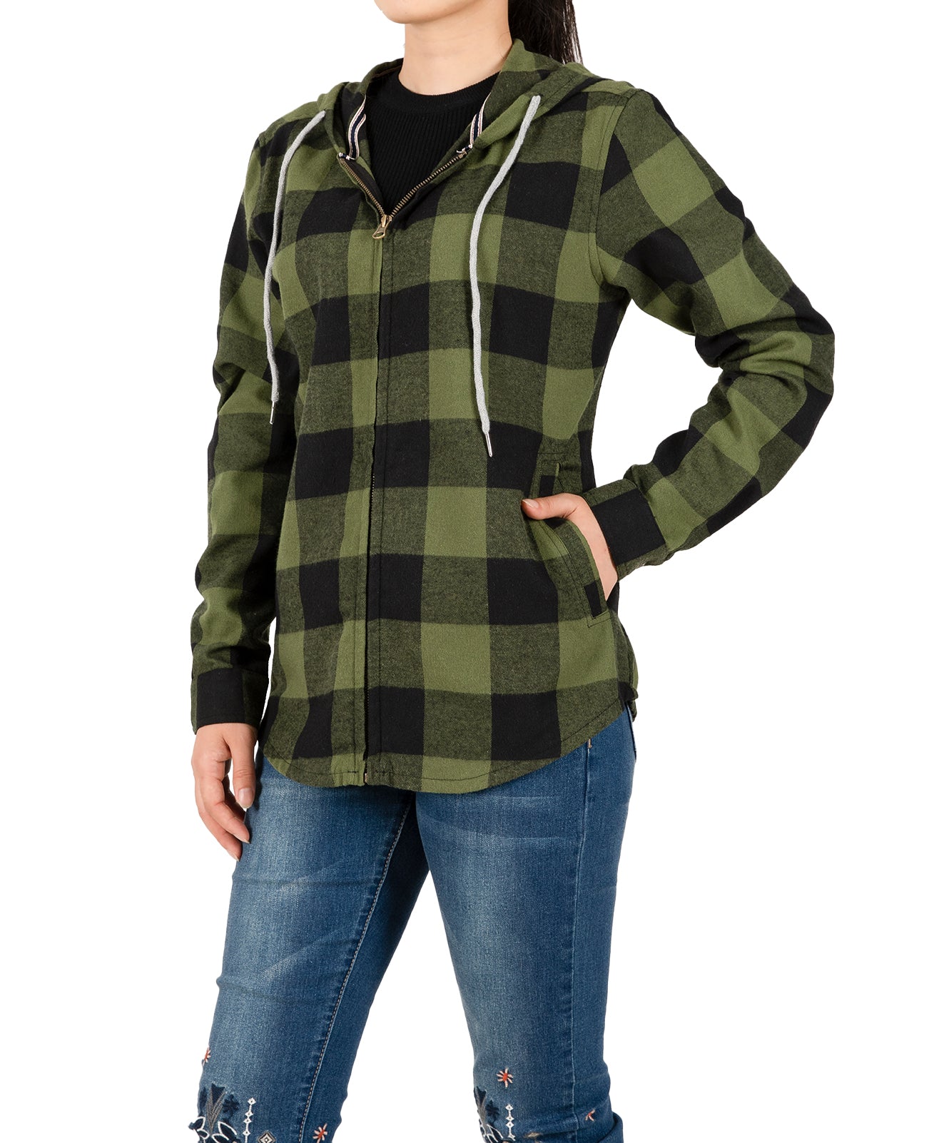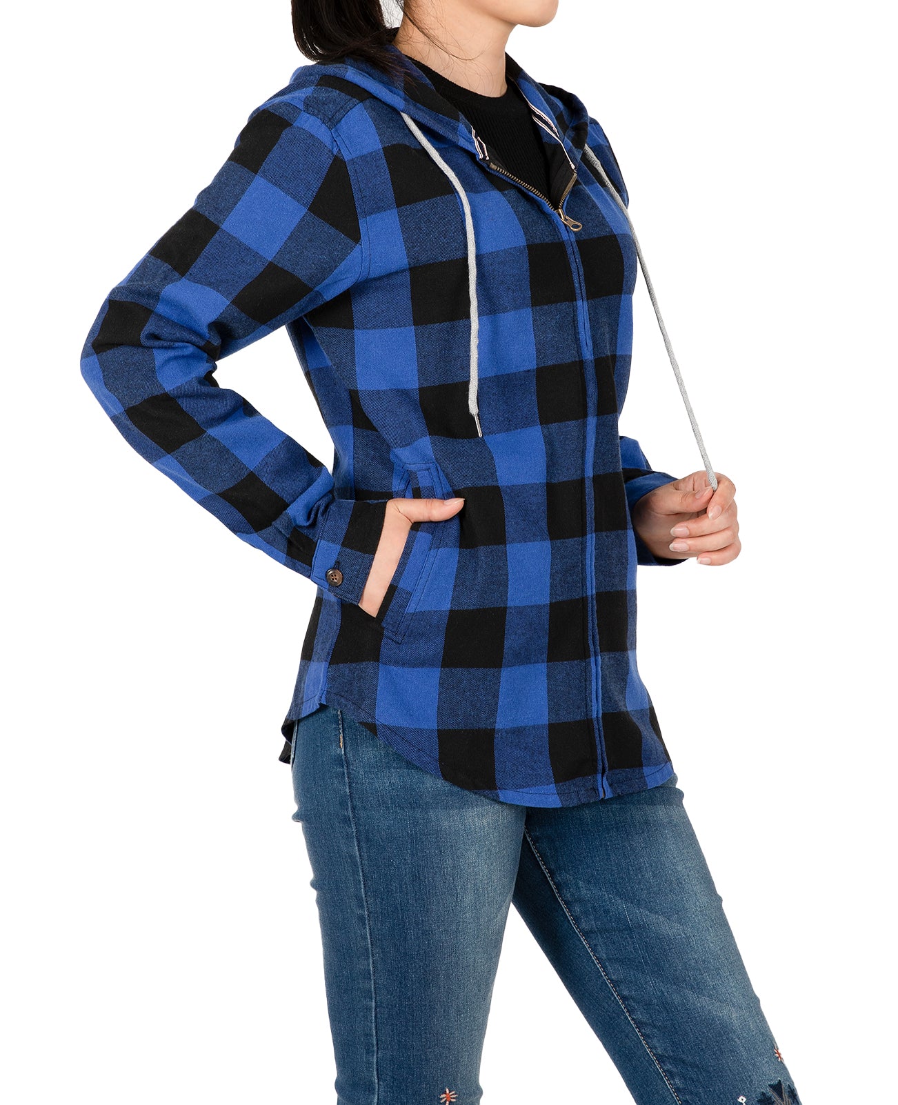 Women's Hooded Plaid Brushed Flannel Shirt in a stylish plaid pattern, featuring a full zip and cozy hood.