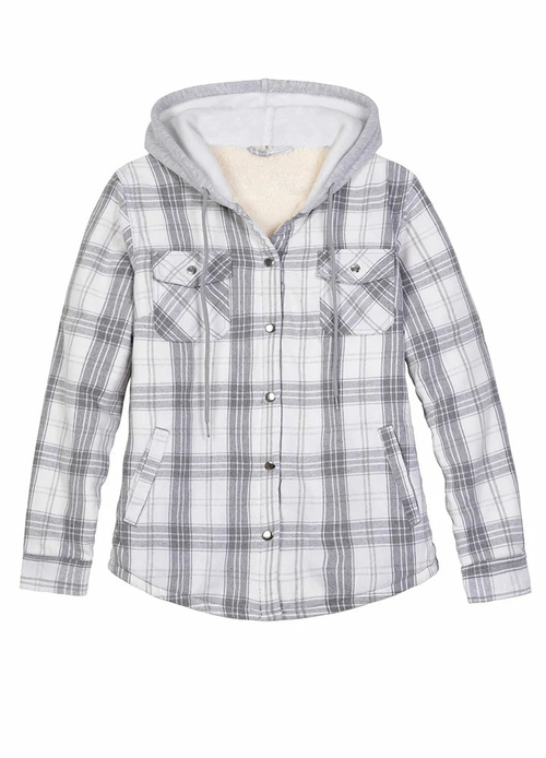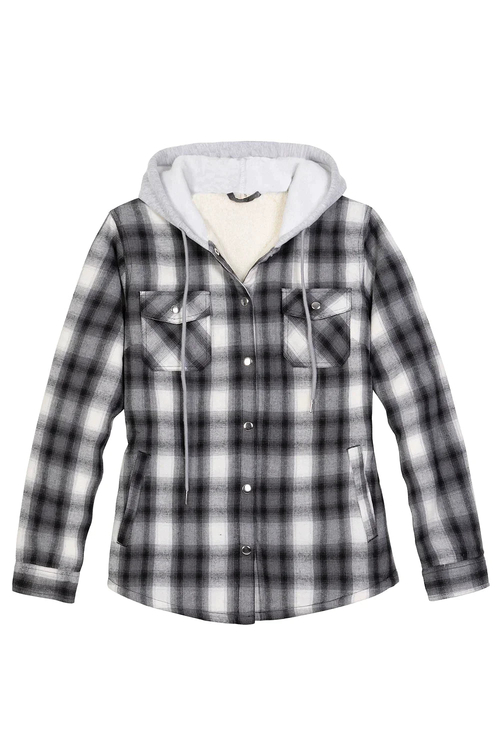 The flannel jacket features a classic plaid pattern that never goes out of style. Its snap-button front placket not only adds to the aesthetic appeal but also makes it easy to put on and take off. The hood provides additional protection against the cold, ensuring you stay snug no matter the weather.