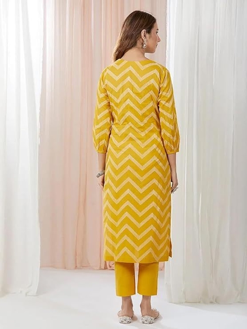 Women's Mustard Cotton Printed Straight Kurta with Pant set size S
