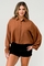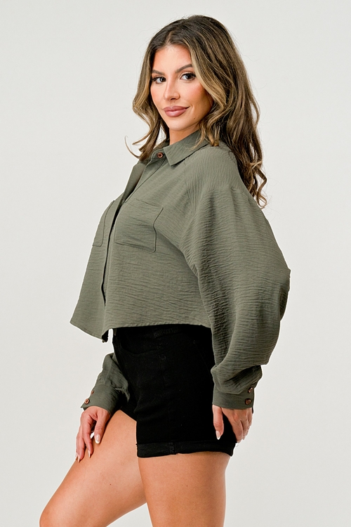 The oversized button-up shirt features a classic collared neckline and a button-front closure, making it a timeless piece that can be dressed up or down. The cropped length adds a trendy twist, allowing you to pair it with high-waisted jeans, skirts, or shorts for a fashionable look. Whether you're heading to brunch with friends or a casual day out, this shirt is the perfect choice.