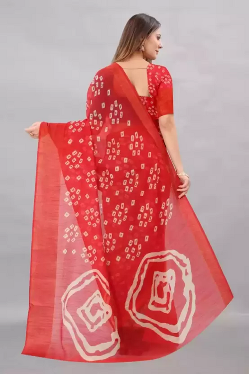 Women's Printed Bandhani Cotton Blend Saree Color Red