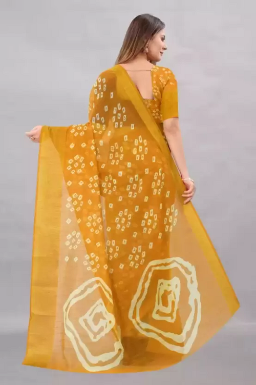 A women's printed Bandhani cotton blend saree blends traditional craftsmanship with modern prints. It features intricate Bandhani tie-dye patterns on a cotton blend fabric, offering a comfortable drape and vibrant colors. These sarees are versatile for both casual and semi-formal occasions, combining cultural elegance with contemporary style.