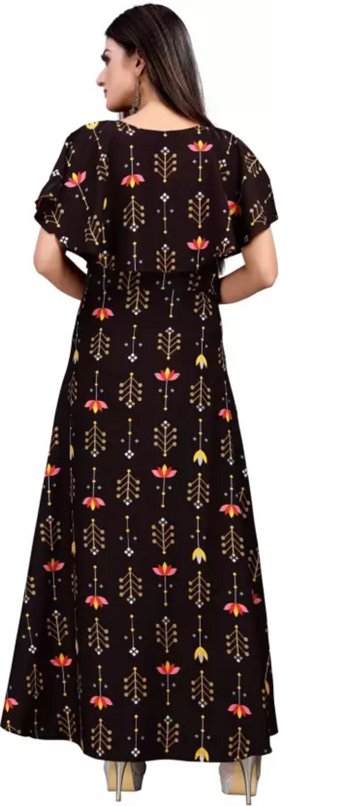 Dropship Women's Printed Crepe Stitched Anarkali Gown (Brown) (Size XL)