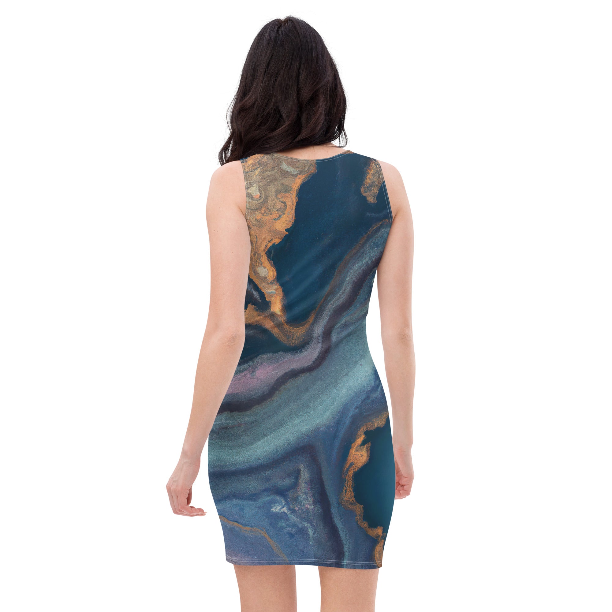 Introducing our stunning Women's Stretch Fit Bodycon Dress in a captivating Blue Pink Marble Swirl Print. This dress is designed to provide both comfort and style, making it an essential addition to your wardrobe. The unique abstract marble swirl pattern in blue, pink, and gold hues adds a touch of elegance and sophistication, ensuring you stand out at any event.