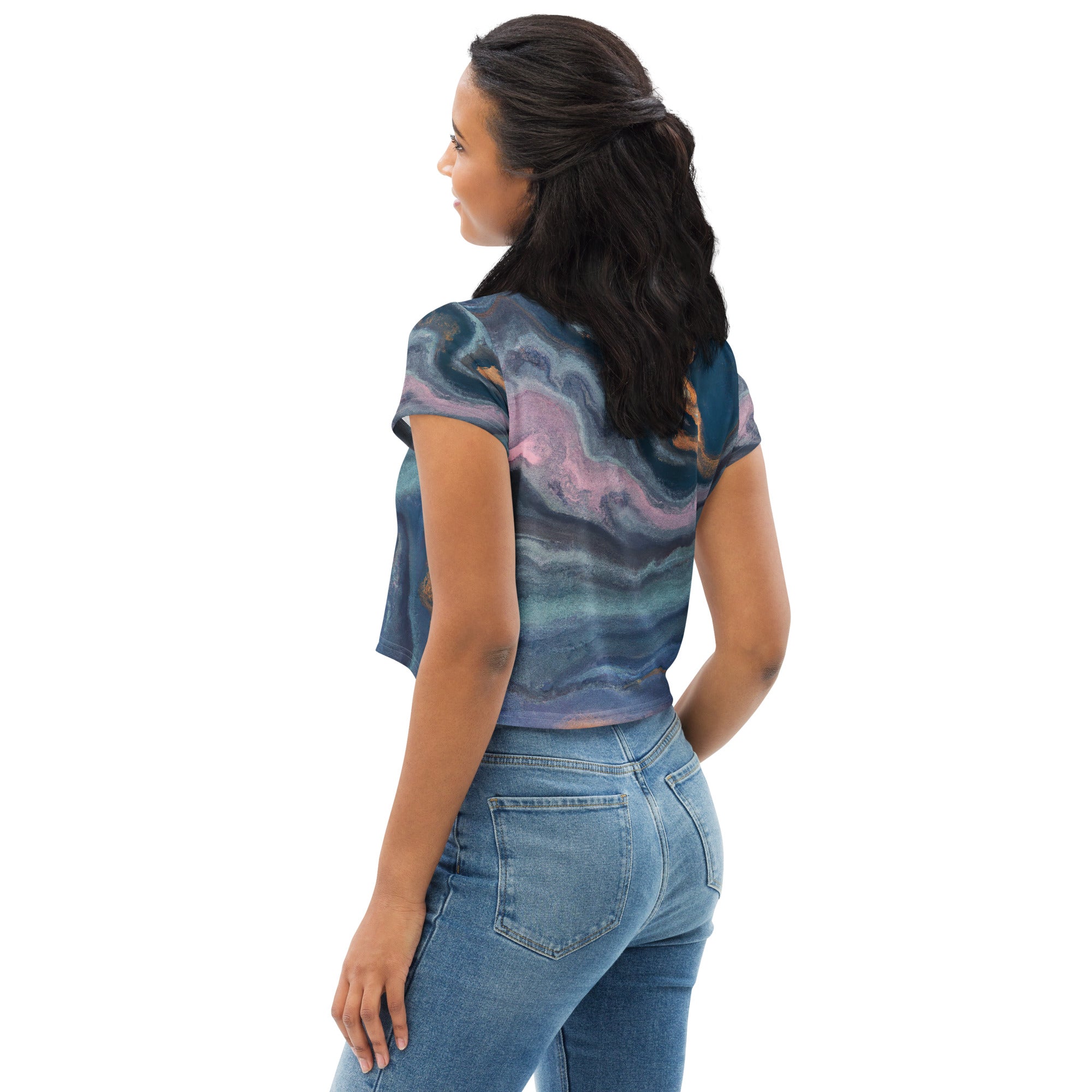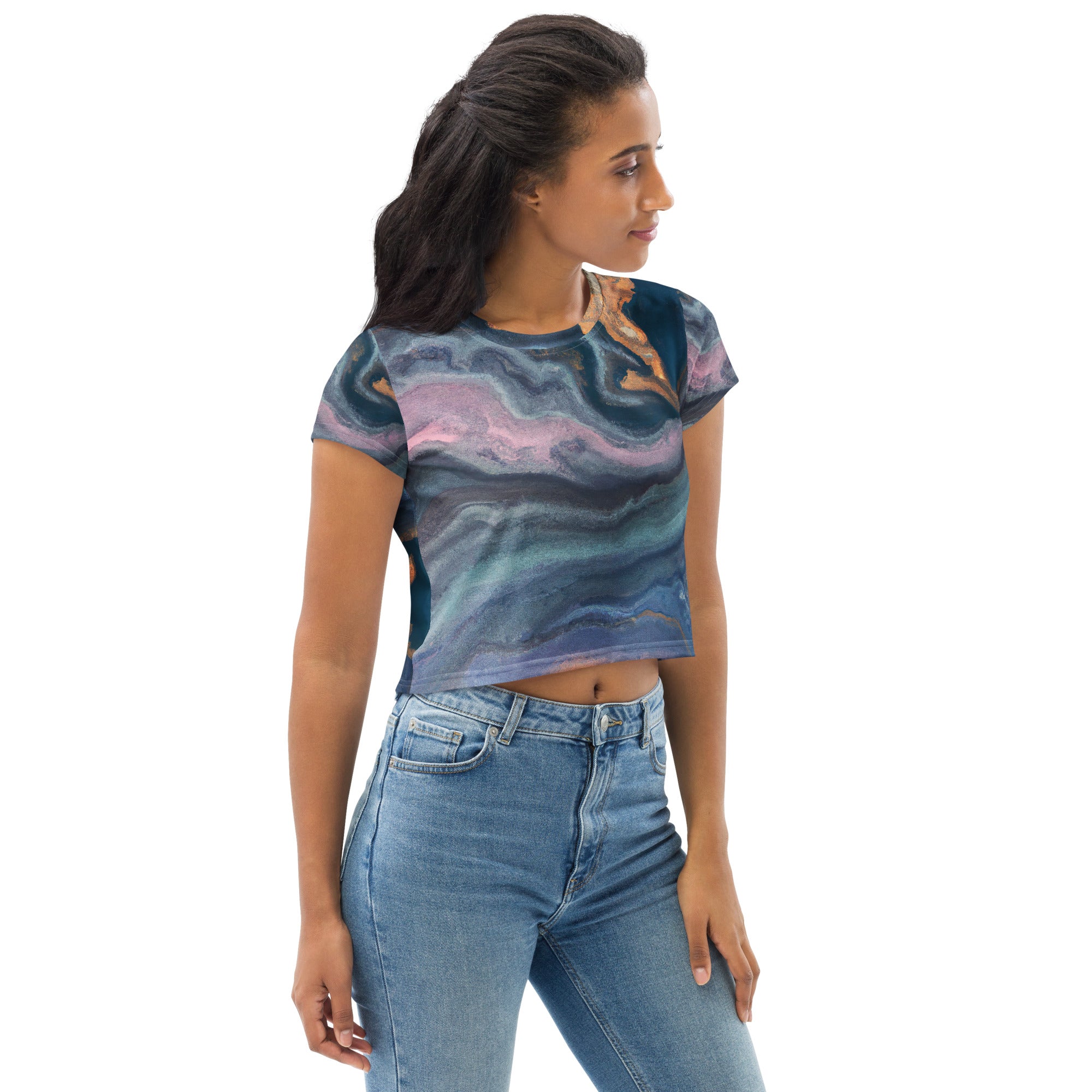 The eye-catching blue pink marble swirl pattern adds a unique touch to your outfit, ensuring you stand out in any casual setting. Whether you're heading to the gym, running errands, or simply lounging at home, this crop tee provides a chic and trendy look that pairs perfectly with high-waisted jeans, shorts, or leggings.