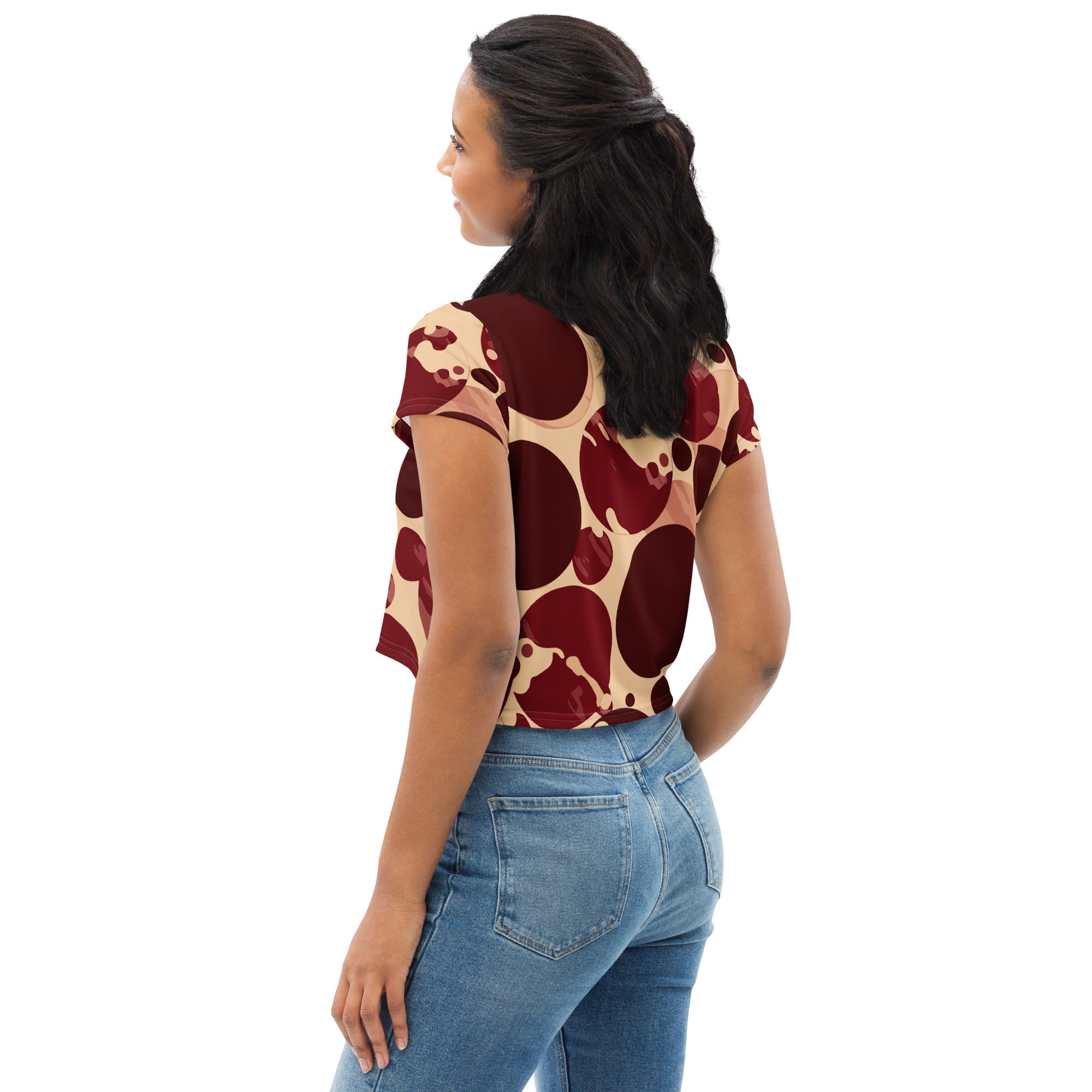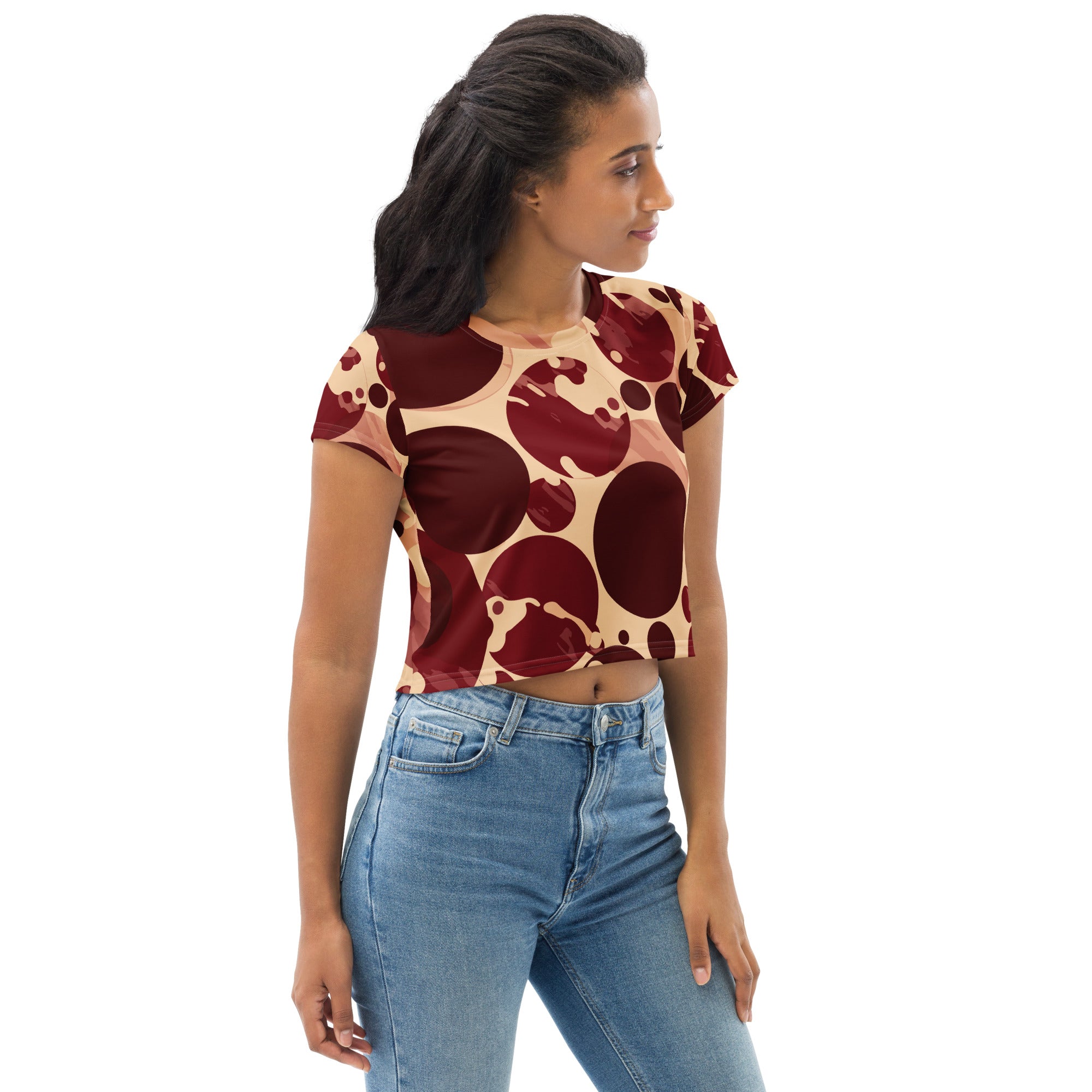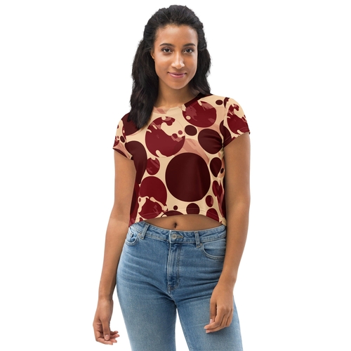 The unique circular spotted illustration adds a trendy flair to the classic crop tee design. The burgundy and beige color combination is versatile, allowing you to pair it with various high-waisted bottoms, from jeans to skirts. Whether you're heading out for a casual brunch or lounging at home, this tee will keep you looking chic and put-together.