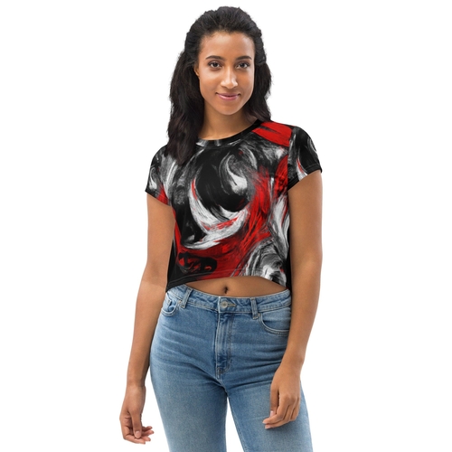 The eye-catching abstract pattern of our Women's Stretch Fit Crop Tee is not just a fashion statement; it’s a versatile piece that can be paired with various high-waisted bottoms. The combination of black, red, and white creates a striking visual that stands out, making it a must-have in your wardrobe. The cropped silhouette enhances your figure while providing a laid-back vibe that is perfect for any occasion.