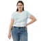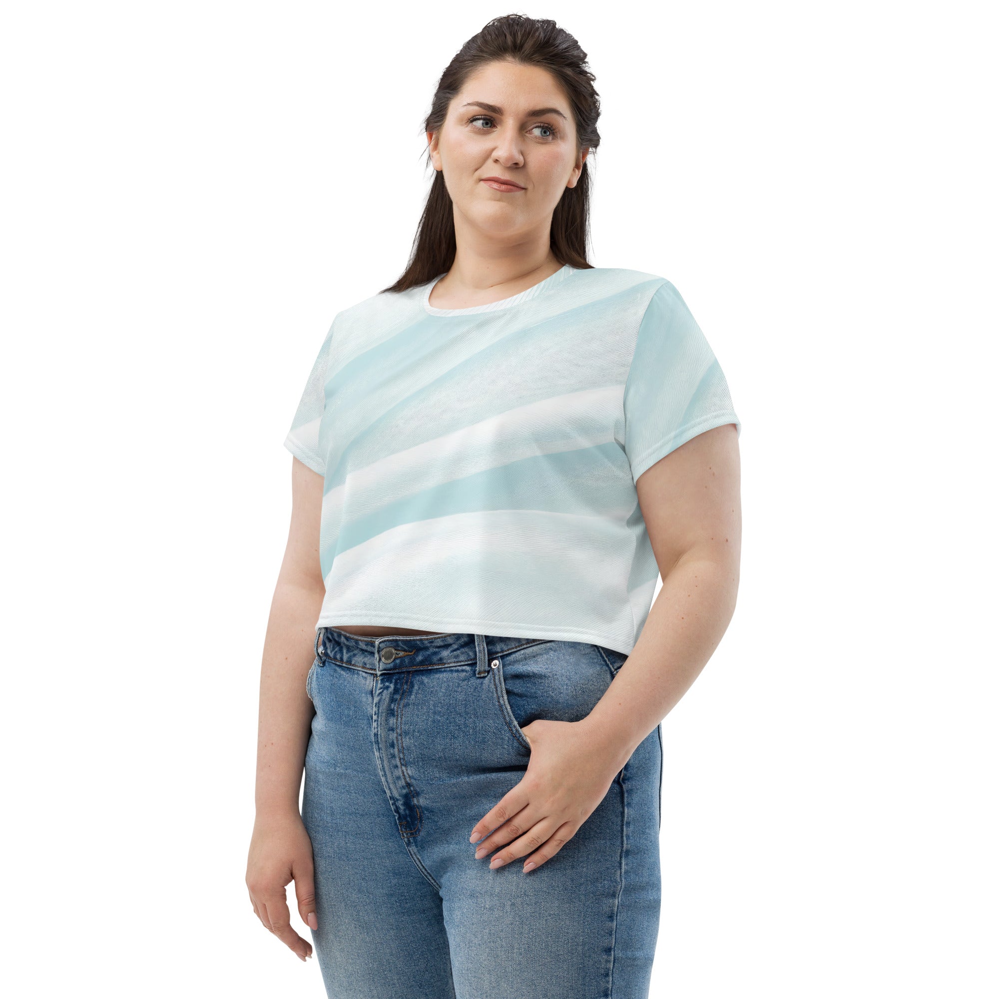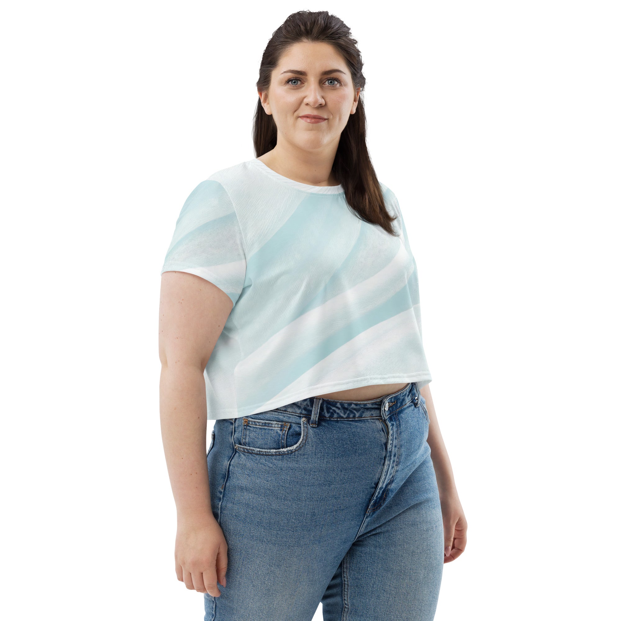 The abstract sky blue swirl pattern adds a unique flair to your casual look, making it a standout piece in any collection. The cropped silhouette is perfect for pairing with high-waisted jeans, skirts, or shorts, allowing you to create a trendy outfit that is both fashionable and functional. Whether you’re heading to a brunch with friends or a casual day out, this crop tee will keep you looking chic.