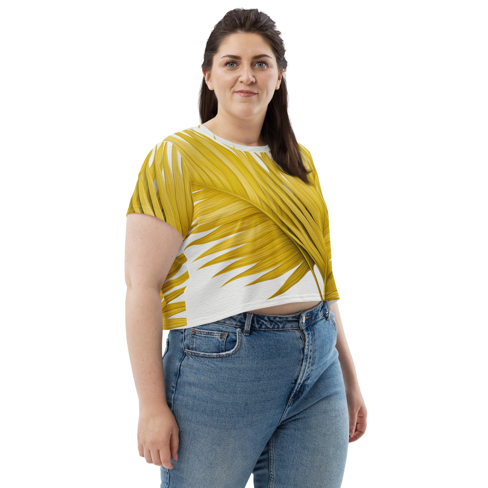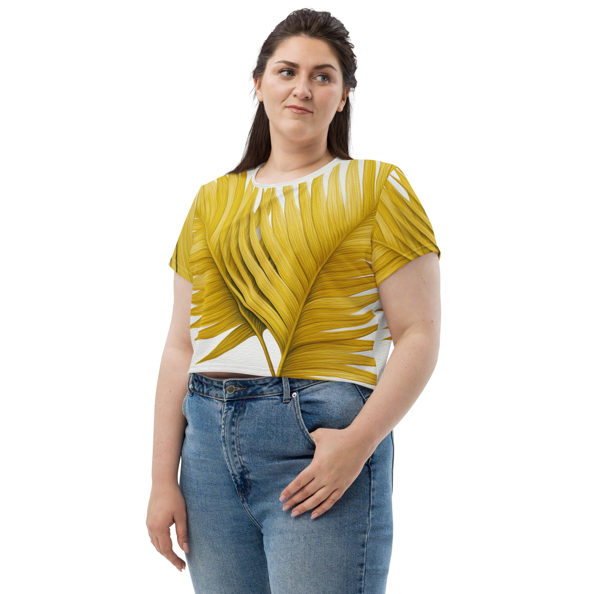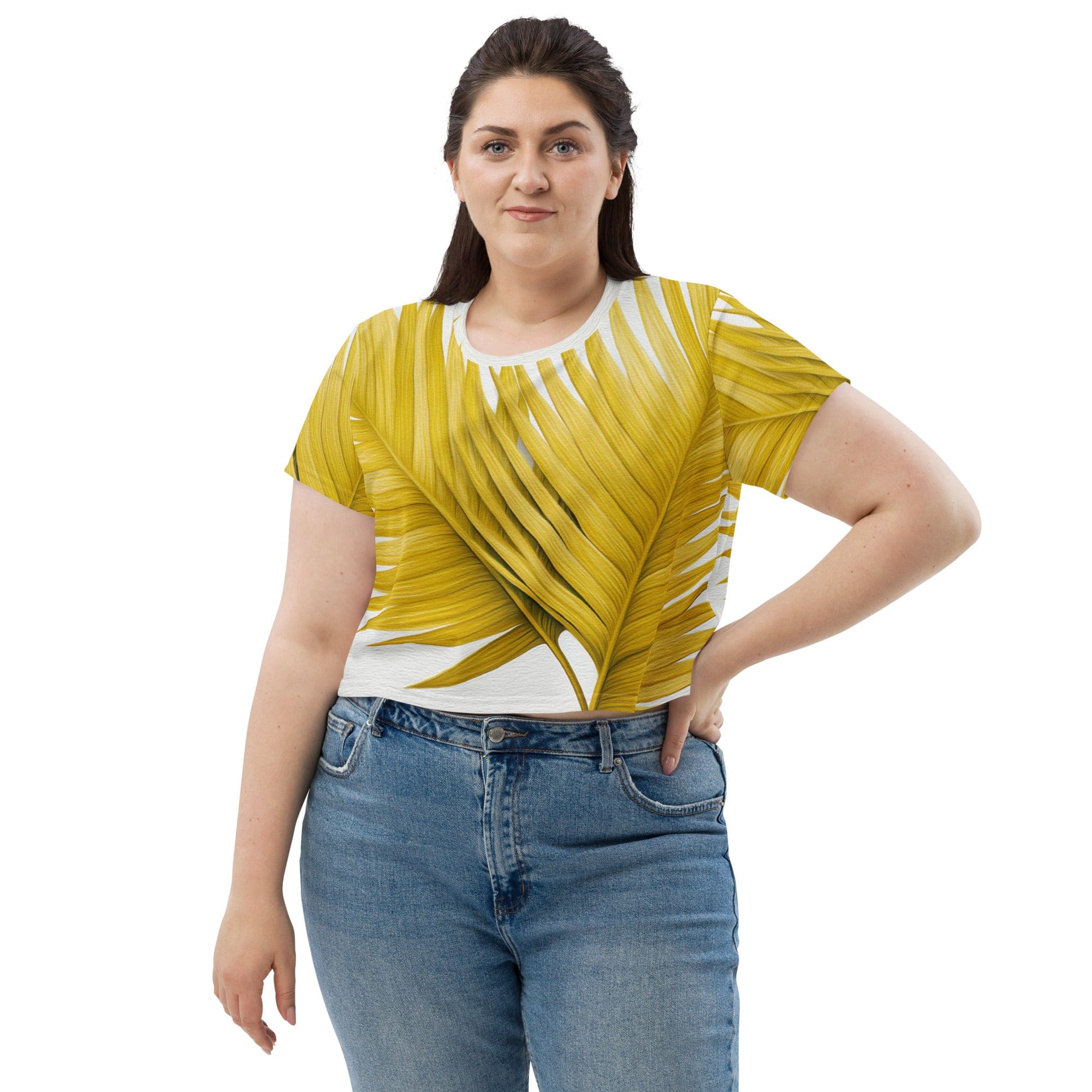 In summary, our Women's Stretch Fit Crop Tee T-shirt Jersey in yellow palm leaves is a must-have for anyone looking to combine style with comfort. With its soft fabric, trendy design, and versatile nature, this crop tee is perfect for any casual occasion. Don't miss out on adding this fashionable piece to your wardrobe!