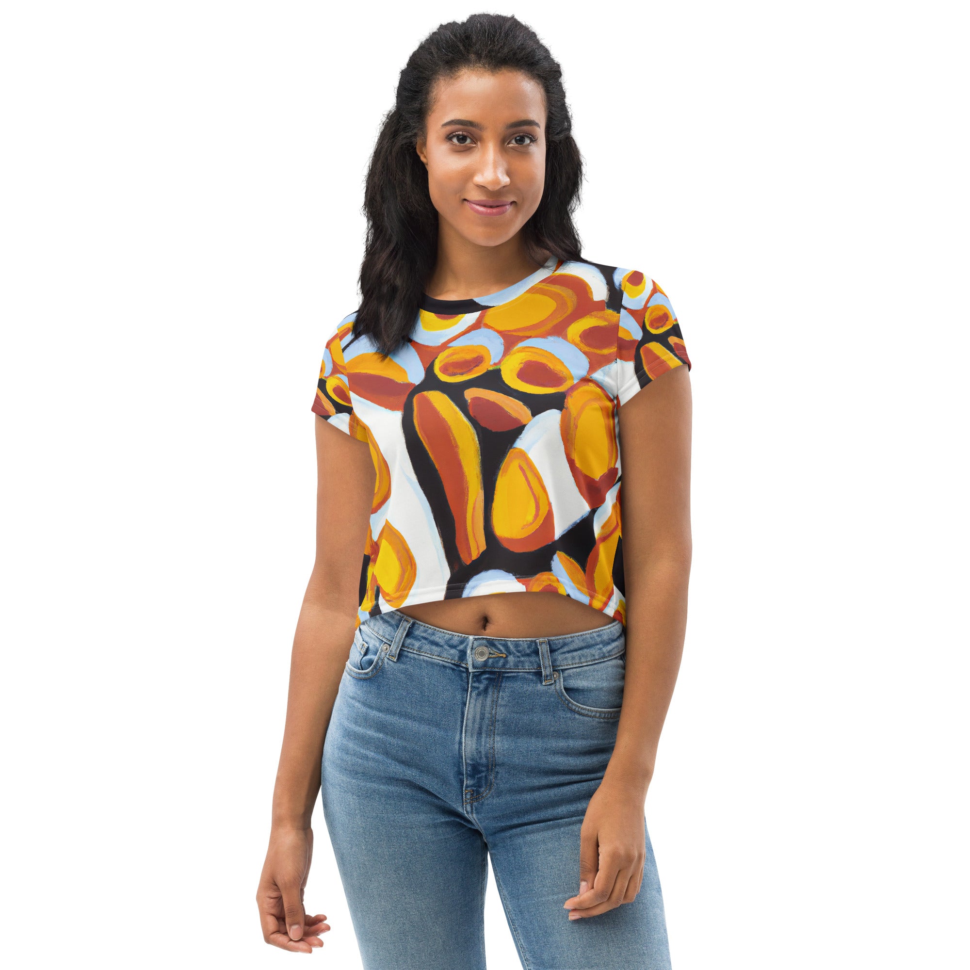 In summary, our Women's Stretch Fit Crop Tee in orange, black, and white geometric print is the perfect combination of style, comfort, and durability. With its trendy design and high-quality fabric, this crop tee is a must-have for any fashion-forward woman looking to enhance her wardrobe.