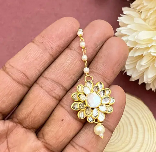 This beautifully crafted accessory is a true celebration of elegance and tradition. Made with the finest Kundan stones and delicate pearls, it exudes timeless charm and grace. Adorn your forehead with this maangtikka and experience the enchantment it brings to your look. The Kundan stones, known for their lustrous appeal, are intricately arranged in a captivating design, while the pearls add a touch of sophistication. The combination of these elements creates a stunning piece that effortlessly enhances your beauty.