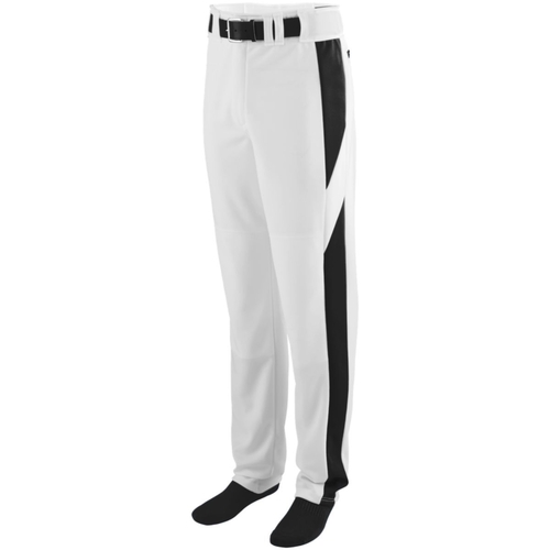 11 ounce 100% polyester double knit * Anti-roll elasticized waist with tunnel belt loops * Two-snap closure * Zipper fly * Two contrast set-in double welt back pockets * Reinforced double-needle coverstitched front and back rise and side seams * Reinforced knees * Contrast color inserts * Relaxed fit - full cut with longer inseam * 35-inch inseam on Adult Large * Graded inseam * Open bottom