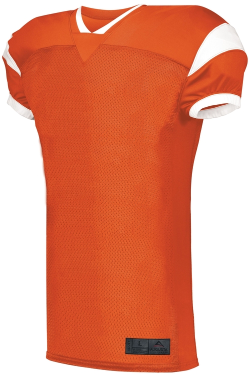 100% polyester heavyweight tricot mesh body * 90% polyester/10% spandex 2-ply yoke, sleeves and side inserts * Updated fit to accommodate traditional and slimmer pads * Outside locker label * V-neck collar with center front insert * Contrast color cap sleeves with contrast color half-elastic cuffs for secure fit over pads