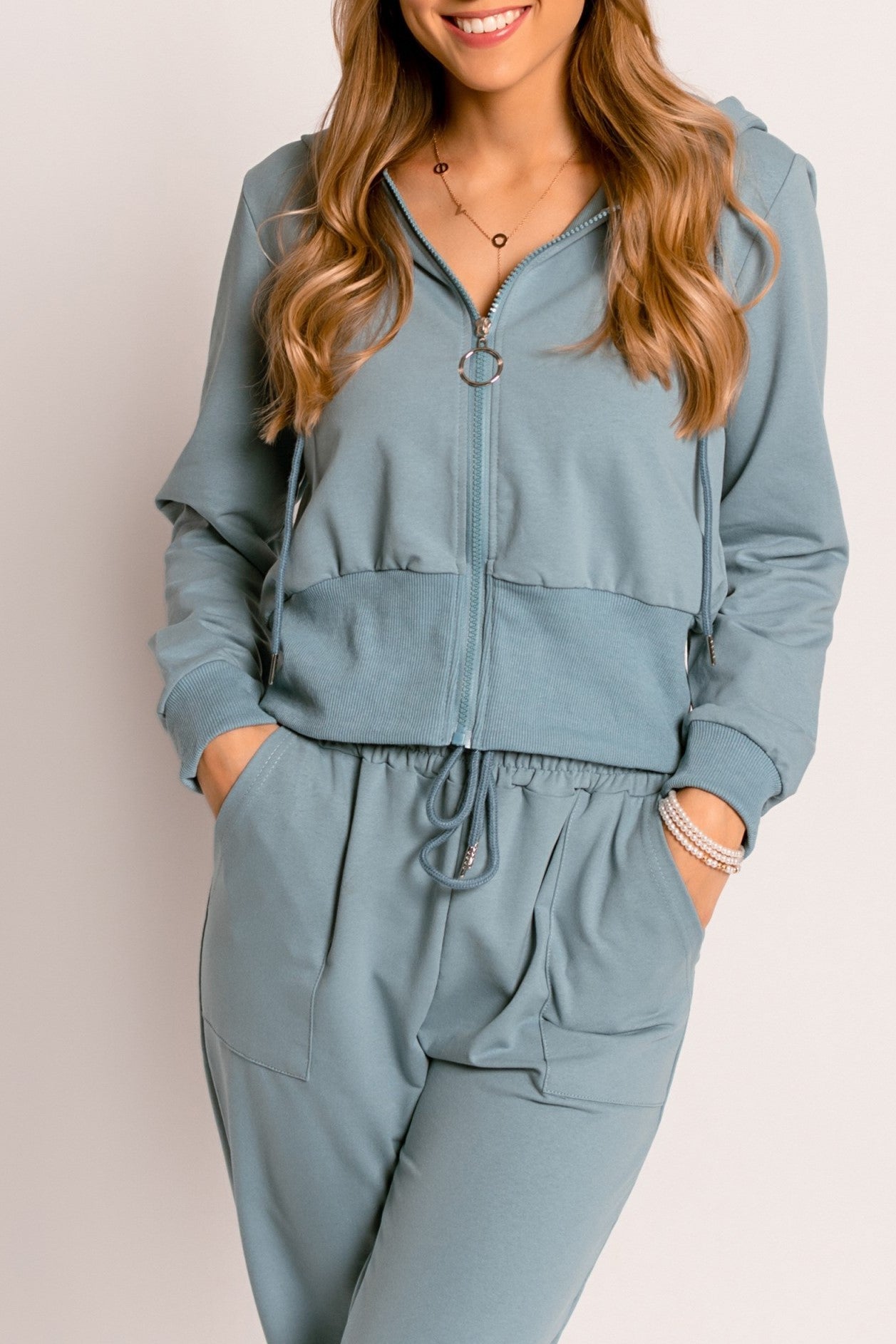 Zipped sports shirt Trepita in blue with long sleeves, drawstring hood, and front zipper closure, showcasing a comfortable and stylish design.