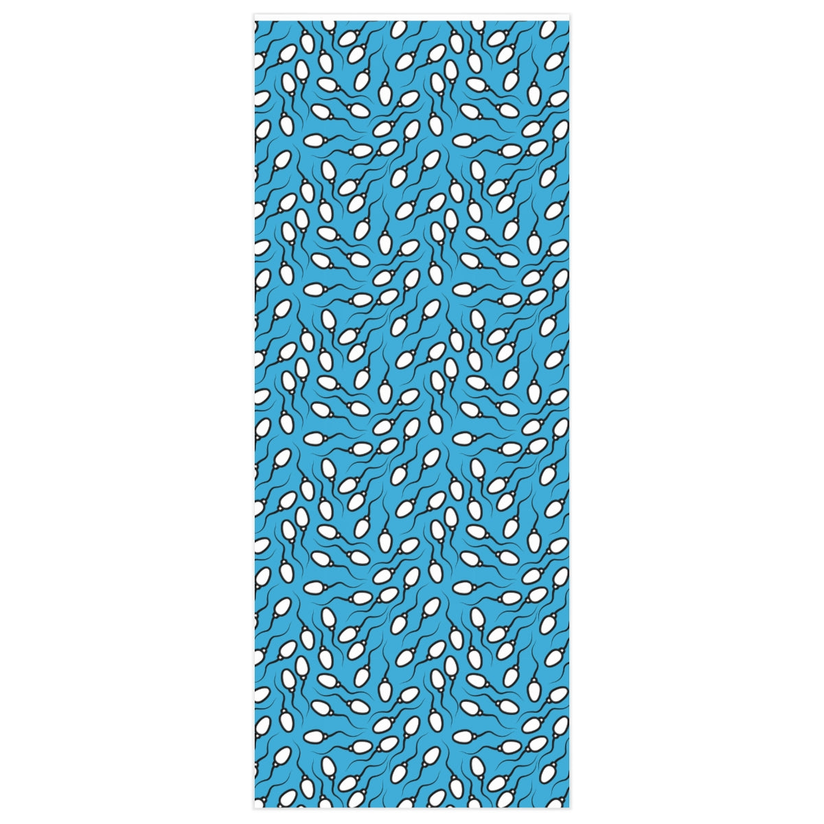 Blue Sperm Wrapping Paper featuring a playful sperm design on premium gloss paper, rolled up for easy storage.