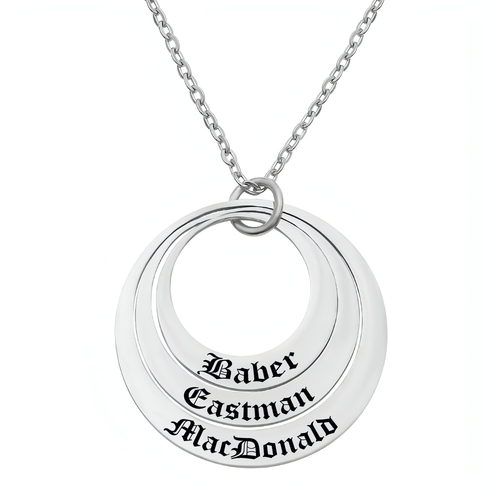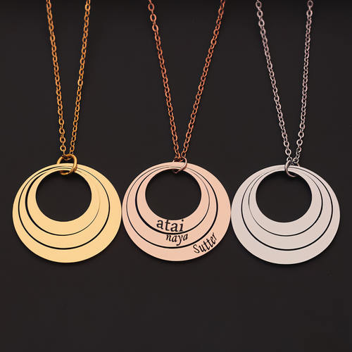 Celebrate your family, friends, or special bonds with our Custom Engraved Three-Name Necklace. This personalized triple-ring name necklace is designed to showcase your unique connections. With a sleek and modern design, it allows you to engrave up to three names or meaningful words, making it the perfect sentimental keepsake for yourself or a loved one.